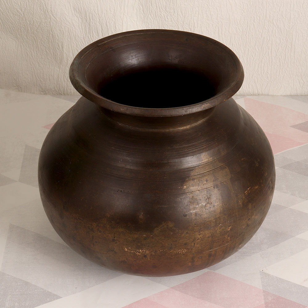 Buy a vintage brass cooking pot online that is meticulously handcrafted by talented Indian artisans in the renowned Assamese Art tradition. Made from high-quality brass, it exudes an authentic antique brown finish that adds a touch of timeless elegance to any setting. This versatile piece can be a stunning addition to your home, office, restaurant, hotel, cafe, or shop. Its allure lies in its dual functionality – while it once served as a utilitarian cooking vessel, today it has been repurposed as an indoor flower pot. Its resplendent vintage charm makes it the ideal choice for decoration purposes, serving as a focal point of beauty in any space. This vintage brass cooking pot is not just a decor piece; it's a collector's dream. Add it to your vintage collection and experience the nostalgia of a bygone era. It also makes for a thoughtful and sentimental gift for your family, friends or relatives on special, festive, or auspicious occasions. This piece is a timeless testament to the rich artistic heritage of Assam and the skilled hands that created it.