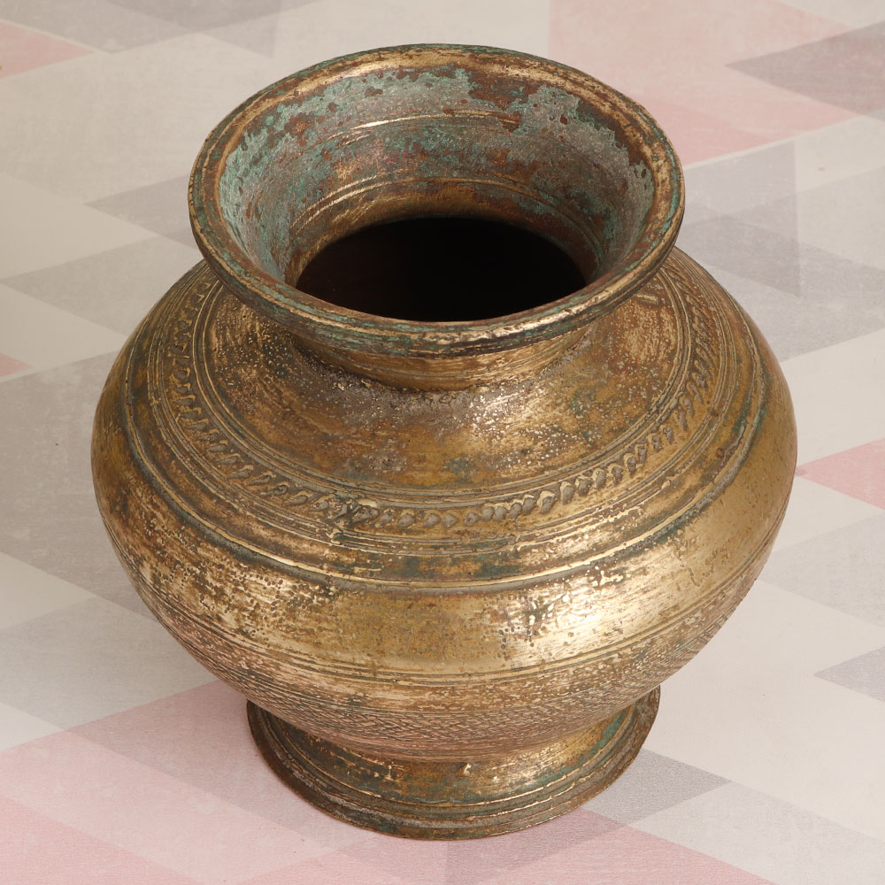This exquisite vintage brass holy water pot is a true testament to the craftsmanship of skilled Indian artisans, meticulously crafted in the intricate South Indian Art style. With its antique brown finish, it exudes an aura of timeless elegance. Crafted from high-quality brass, this pot is not just a piece of art but a versatile addition to your space. This multifunctional piece can be placed in various settings - be it your home, office, restaurant, hotel, cafe, or shop. As an indoor flower pot, it infuses a touch of old-world charm into your decor. However, its utility doesn't end there. It is also perfect for use during havan, rituals, and other auspicious occasions, where it holds holy water with reverence. Position it in the north direction of a room to harness its positive energy and bring a sense of tranquillity to your surroundings. Additionally, it's a splendid addition to any vintage collection. Gift it to your family, friends or relatives on special, festive, or auspicious occasions, and you're not just gifting a piece of history, but a symbol of blessings and positivity.