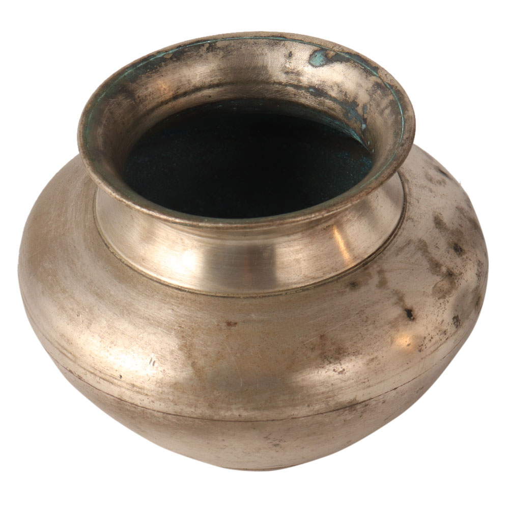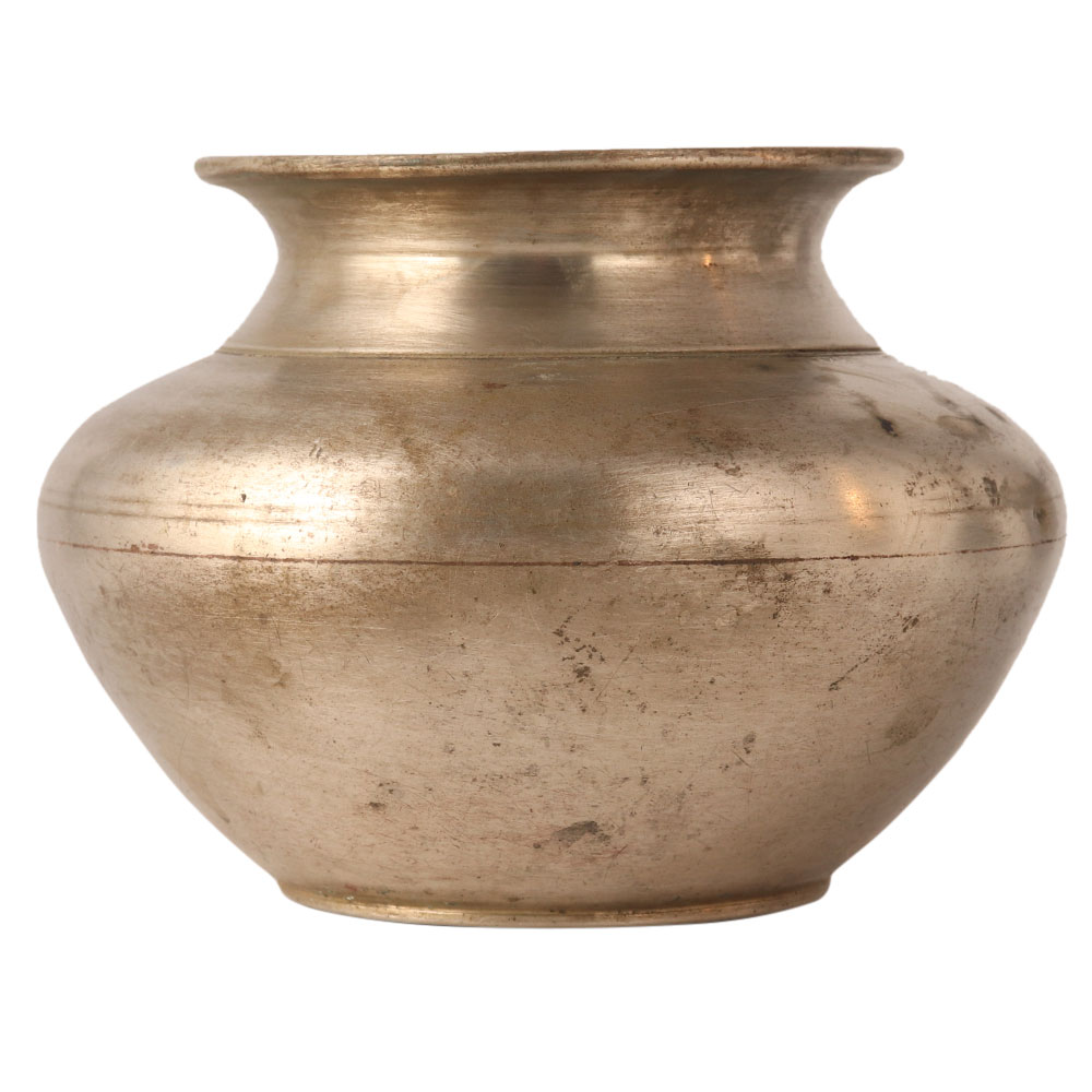 This matte, handmade pot is carved in the Indian state of Himachal Pradesh. It is made of white metal alloy and has a flat surface. Use it as a flower pot and display it in your home or office.