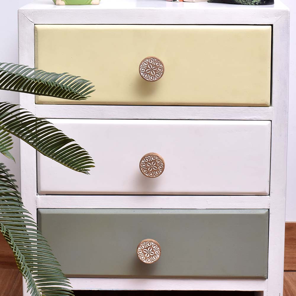 Enhance your furniture with the Handmade White and Brown Floral Wooden Round Cabinet Knobs. These stunning, hand-painted knobs showcase a detailed floral design in warm white and brown shades, providing a rustic and vintage flair to your cabinets, drawers, or doors. Ideal for refreshing furniture or adding a unique touch to any space.