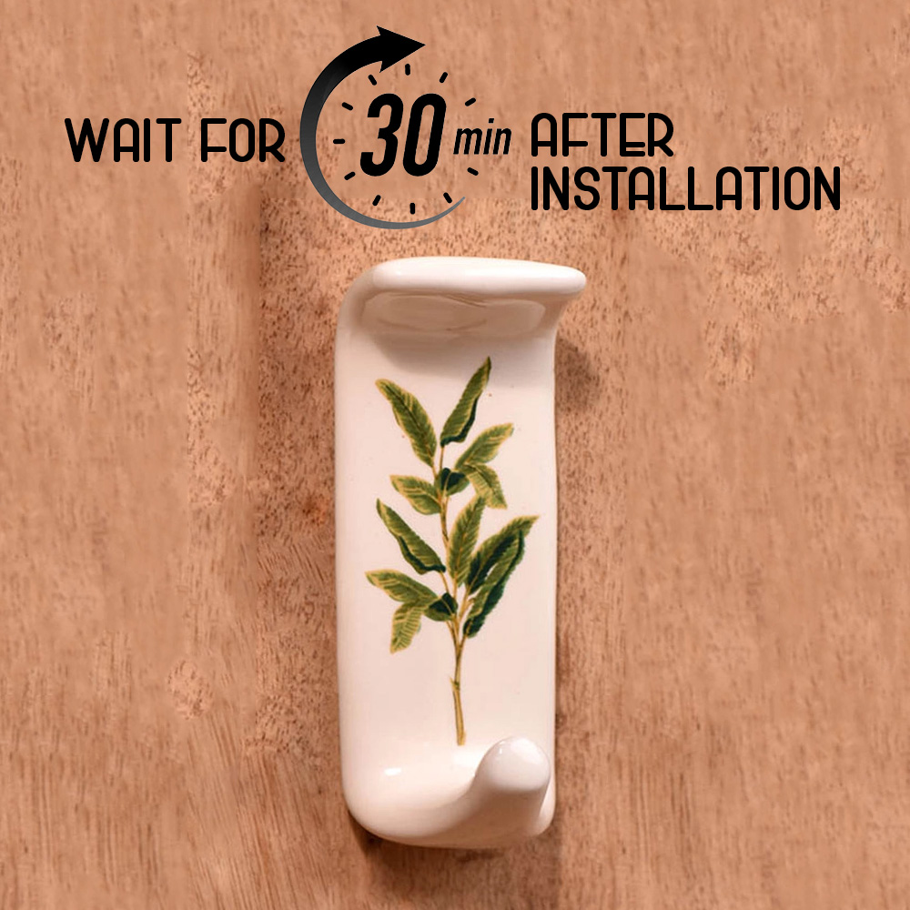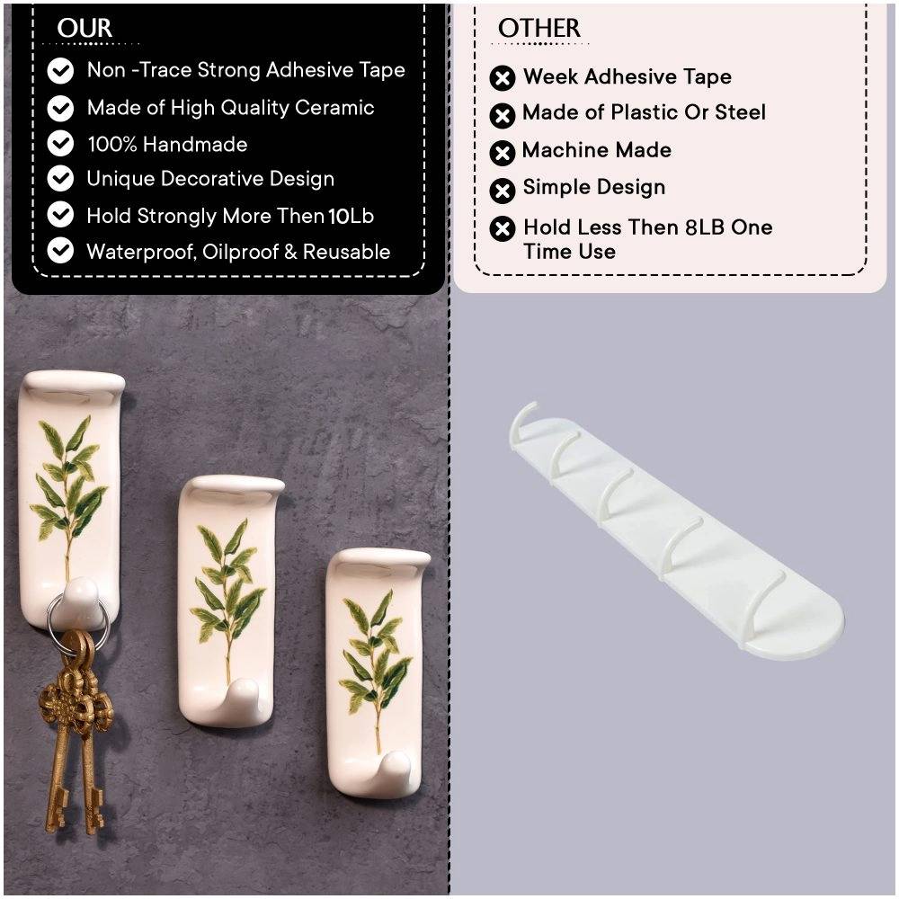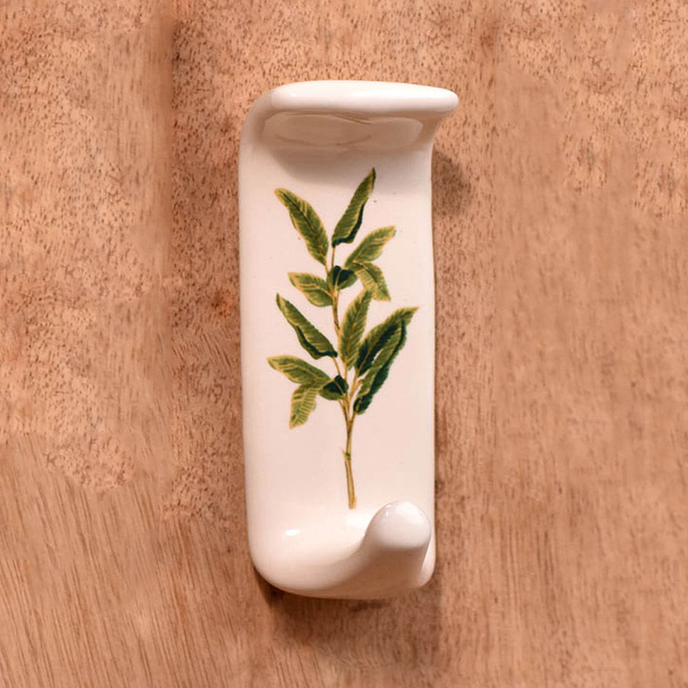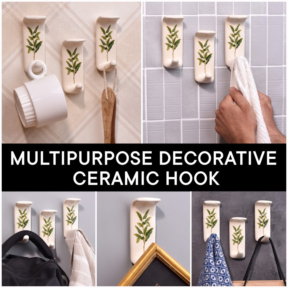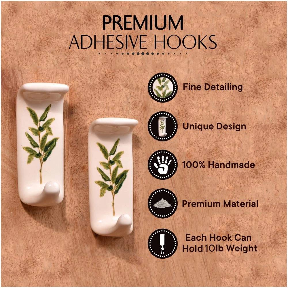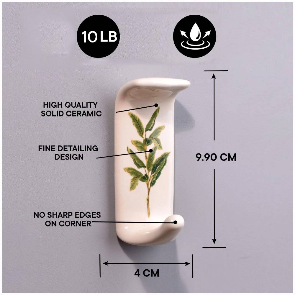 An Adhesive Ceramic Wall Hook in a pristine white hue that is adorned with a charming green leaf engraving and meticulously handcrafted by professional Indian artisans. This decorative and functional piece seamlessly combines form and function, elevating your home decor while providing practical utility. Crafted from premium-quality ceramic, this adhesive hook for painted walls is not just a mere stick hook, it's a durable and reliable solution for your hanging needs. Its heavy-duty design ensures it can securely hold towels, clothes, hats, bags, keys, scarves, and jackets with ease, offering a clutter-free and organized living space. The green leaf motif adds a touch of nature's beauty to your interiors, blending seamlessly with various decor styles. This adhesive wall hook is not only versatile but also a thoughtful gift option for your family, friends or relatives, perfect for special or festive occasions. Share the warmth of handmade craftsmanship and functionality with this charming ceramic wall hook, a fusion of artistry and practicality. Transform your space effortlessly with this stunning piece today.
