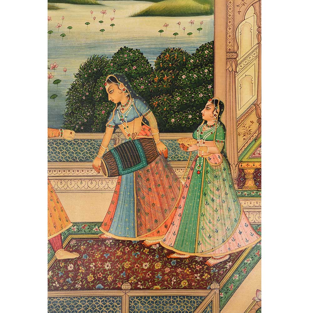 This is a rare Canvas painting from the Mughal era. It depicts the queen and the king enjoying wine in the open harem courtyard on the terrace. It is perfect for presentation, collection, and as a gift.