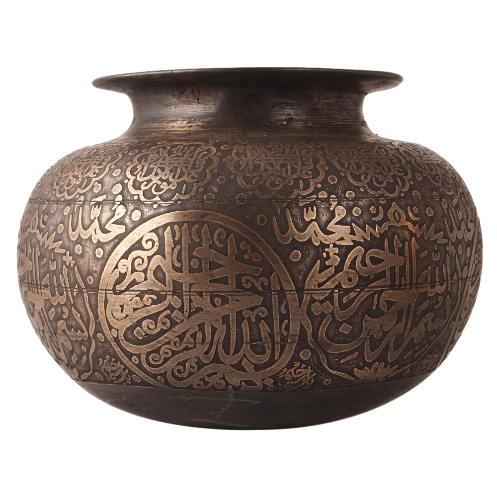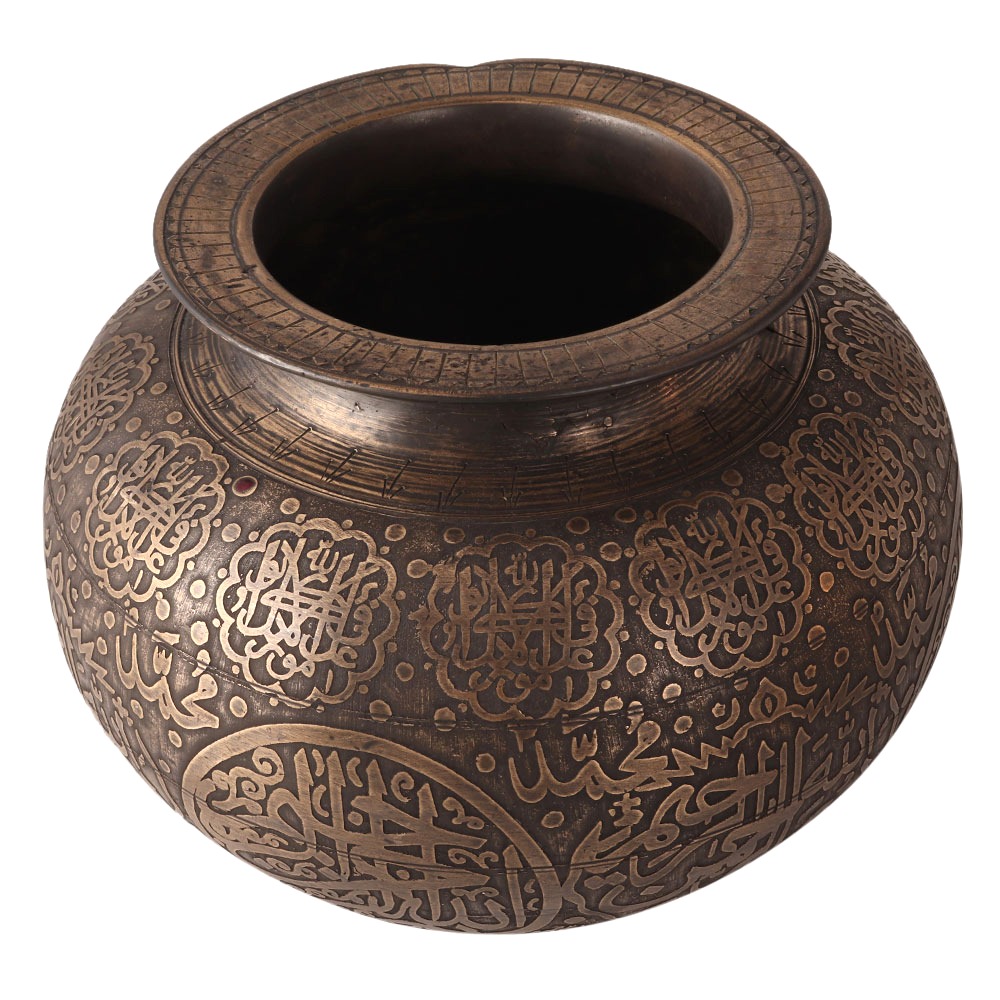 A fully engraved cooking pot in Islamic art. This heavy vintage style pot is carved from brass and has a sturdy appearance. This pot was used for cooking rice and daal in homes. Since it is made of brass, it has many health benefits when cooking. It was often used for store water for home use. You can display it in your vintage collection. A beautiful flower pot for your entrance and garden. Housewarming gift, Christmas and New Year gift for your friends and relatives.