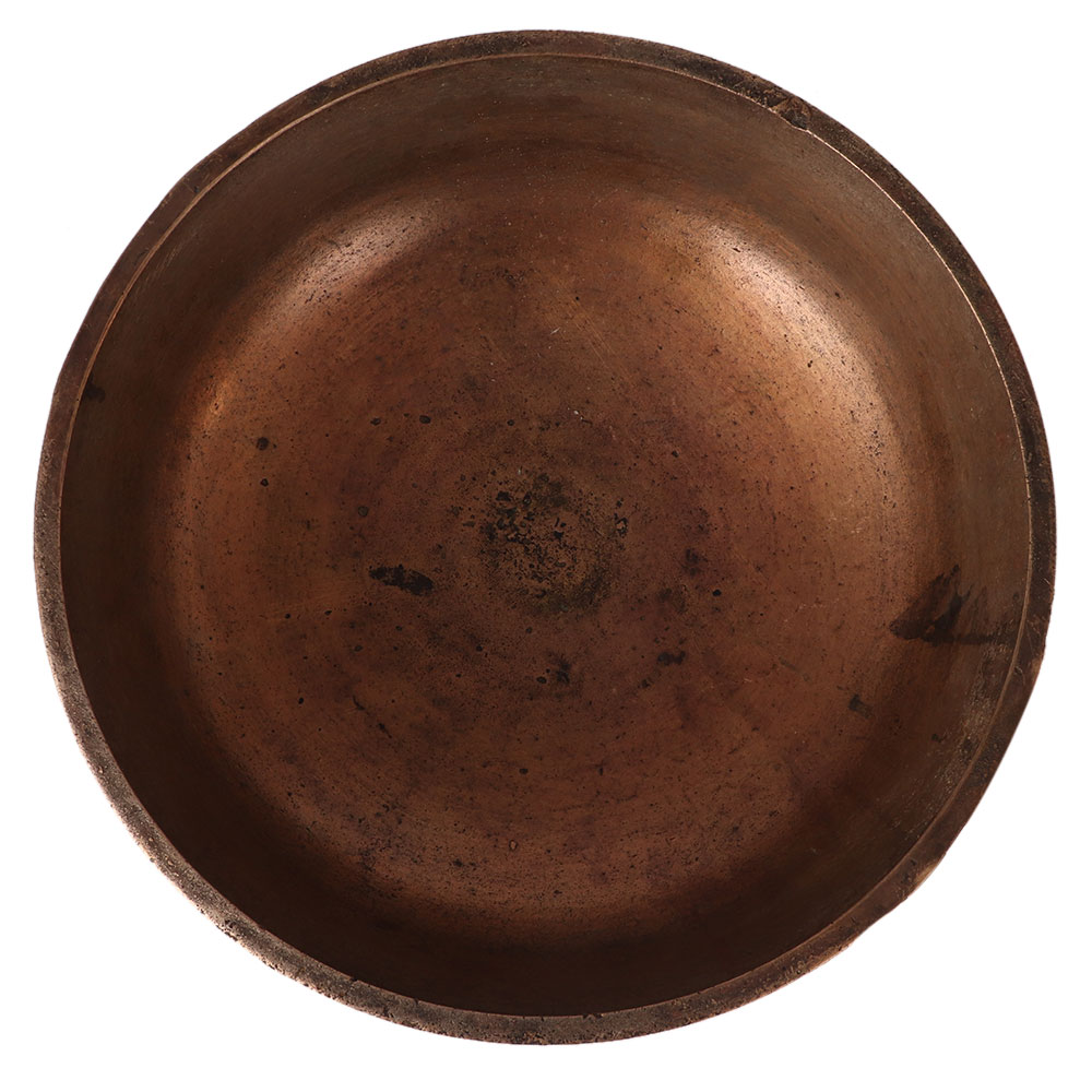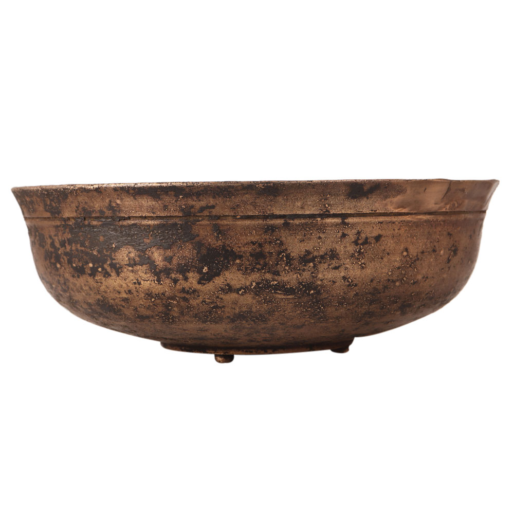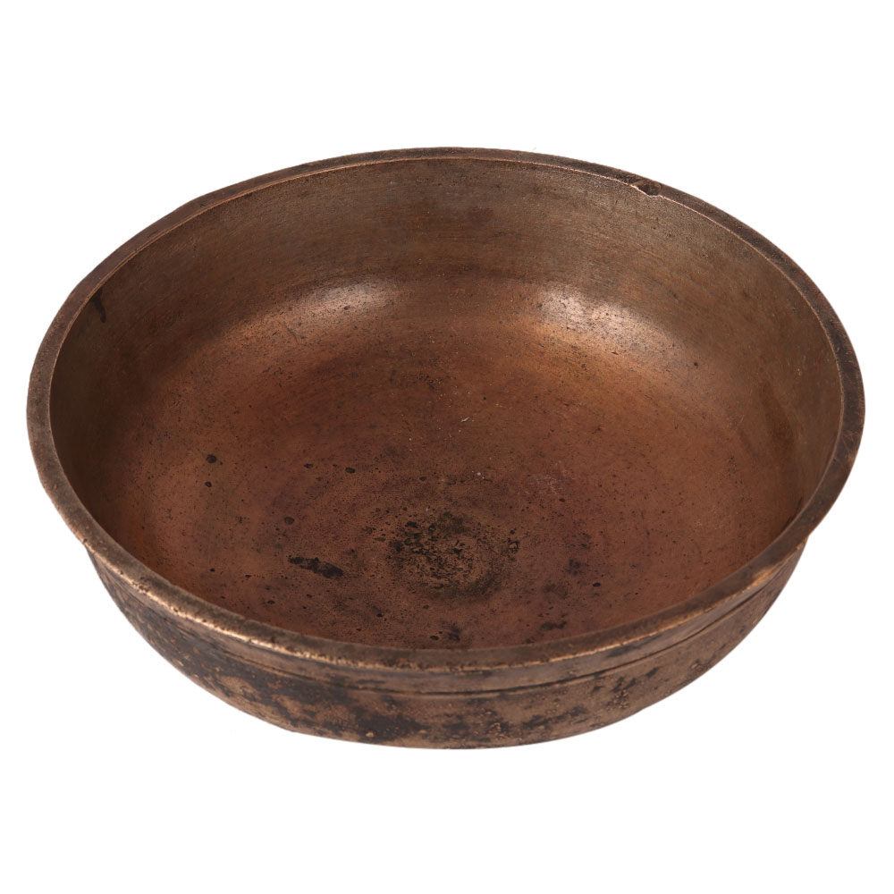A heavy vintage style sacred bowl carved from brass. It has three supports on the bottom to hold on the surface. It has a circular ring engraved on the side. It is used in temples for bathing the god. Vintage collectors must have this bowl in their collection. Use it as an indoor flower pot to enhance your interior design.