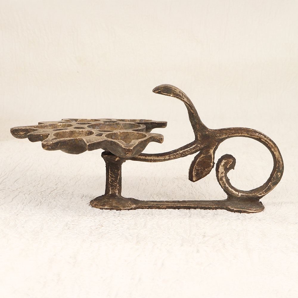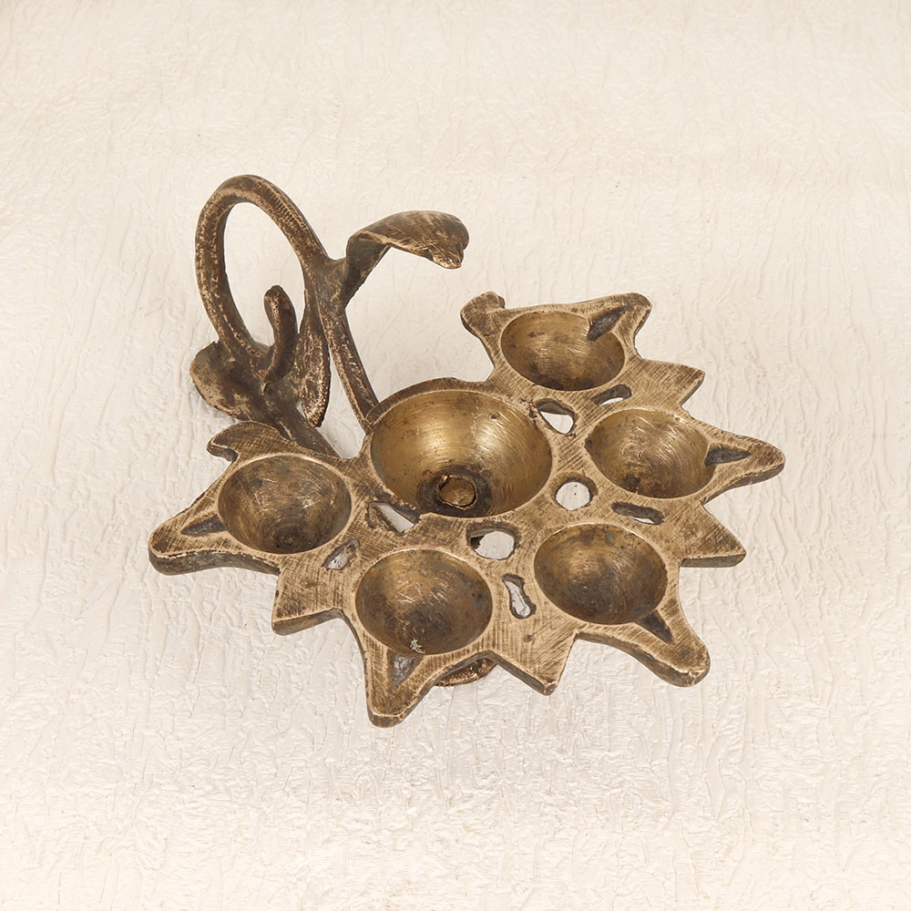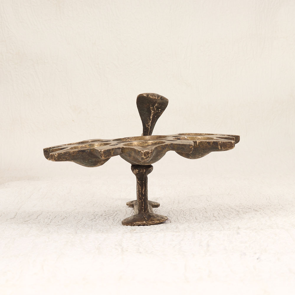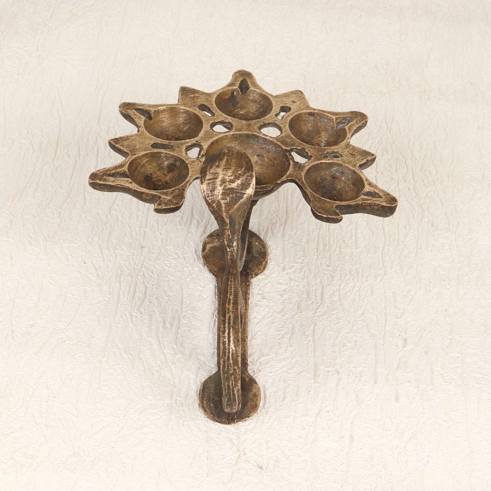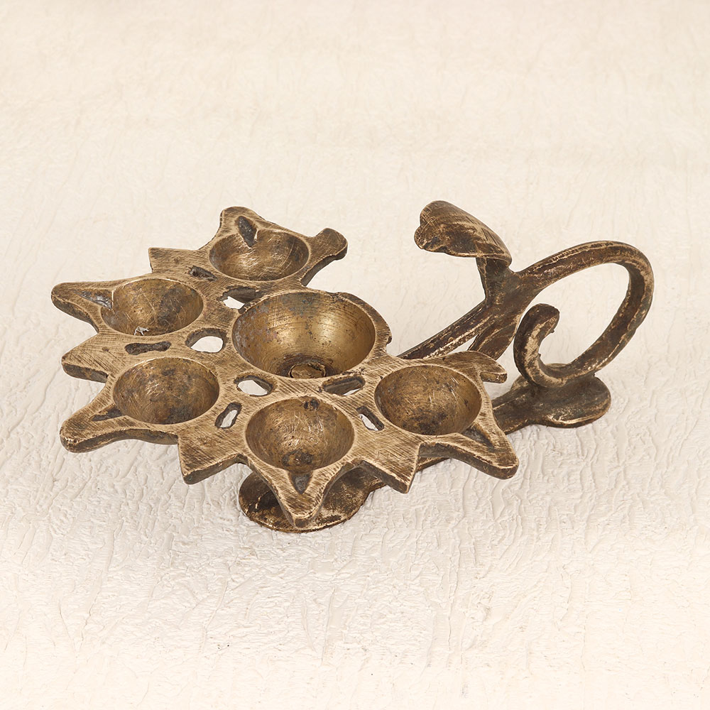 Buy a Vintage Brass Aarti Oil Lamp online that features a distinctive cobra handle and six intricately designed jyots. Handcrafted by skilled Indian artisans from premium brass, this timeless piece boasts an antique brown finish that exudes charm and authenticity. Perfect for igniting a warm glow during prayer ceremonies, this lamp can be fueled with traditional mustard oil or ghee using cotton wicks. The careful craftsmanship and attention to detail make it a valuable addition to any vintage collection. Its versatility allows it to seamlessly integrate into various settings, whether at home, in the office, a restaurant, hotel, or café prayer room. Beyond its decorative appeal, the Vintage Brass Aarti Oil Lamp serves as a thoughtful and meaningful gift for your family, friends or relatives on special, festive, or auspicious occasions. Embrace the rich cultural heritage and add a touch of tradition to your surroundings with this timeless piece that transcends time and resonates with the artistry of Indian craftsmanship.