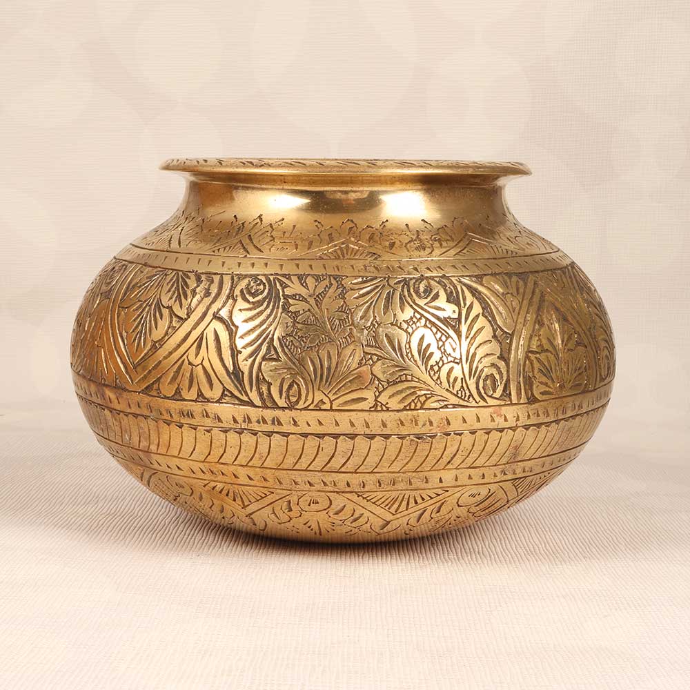 This vintage brass cooking pot beautifully captures the rich engraving style of South Indian artistry. Its antiqued patina and elegant shape speak to the remarkable craftsmanship of a bygone era. While too delicate for cooking use today, this etched brass pot has been given a new lease on life as a decorative accent piece. Place it on your coffee table or kitchen island as an exotic vase, fill it with fresh blooms and let it spark conversation. The smooth, curved form and detailed engraving lend visual interest and rustic texture to bookshelves, console tables, or mantels. Display it as a stand-alone objet d'art and allow its warm, golden sheen to elevate your living space. However you choose to showcase it, this brass pot adds an intriguing touch of vintage charm to modern sensibilities. A treasure from the past, repurposed for today.