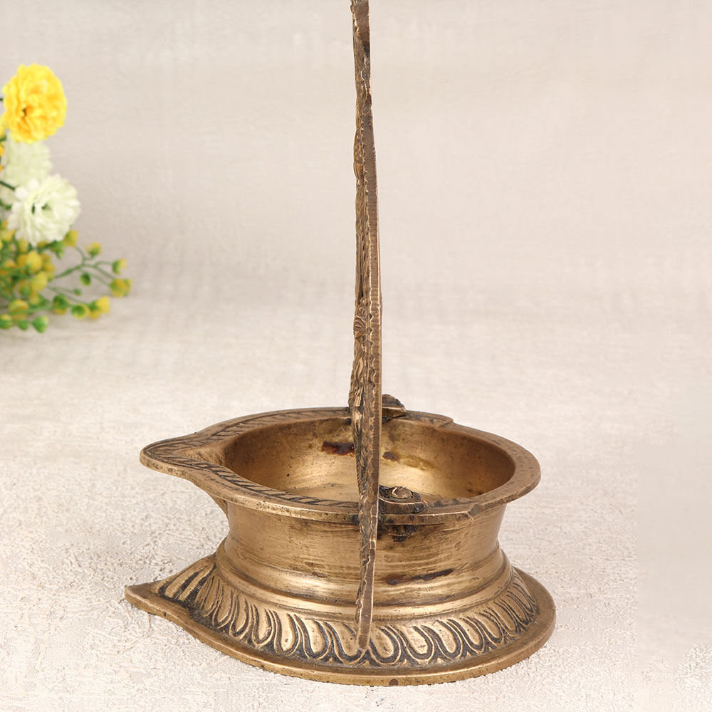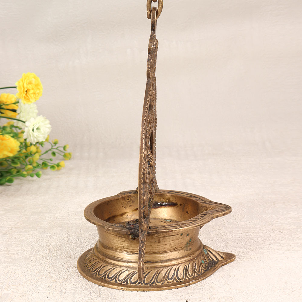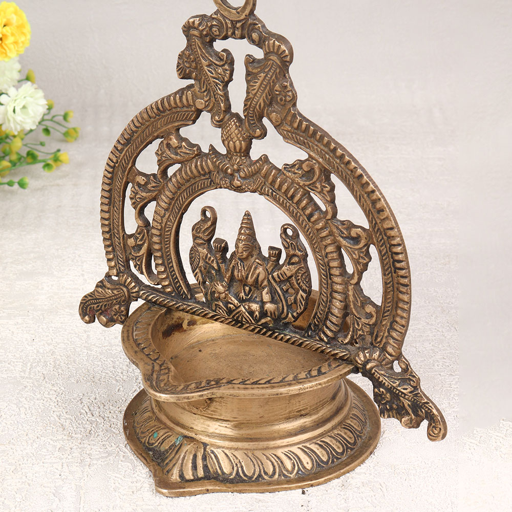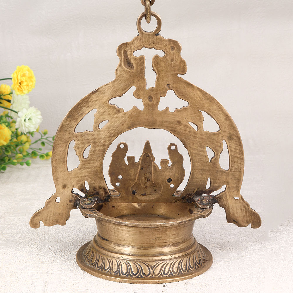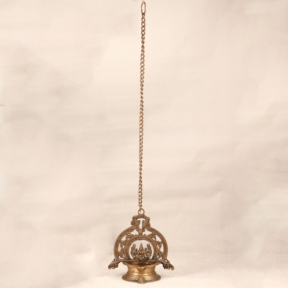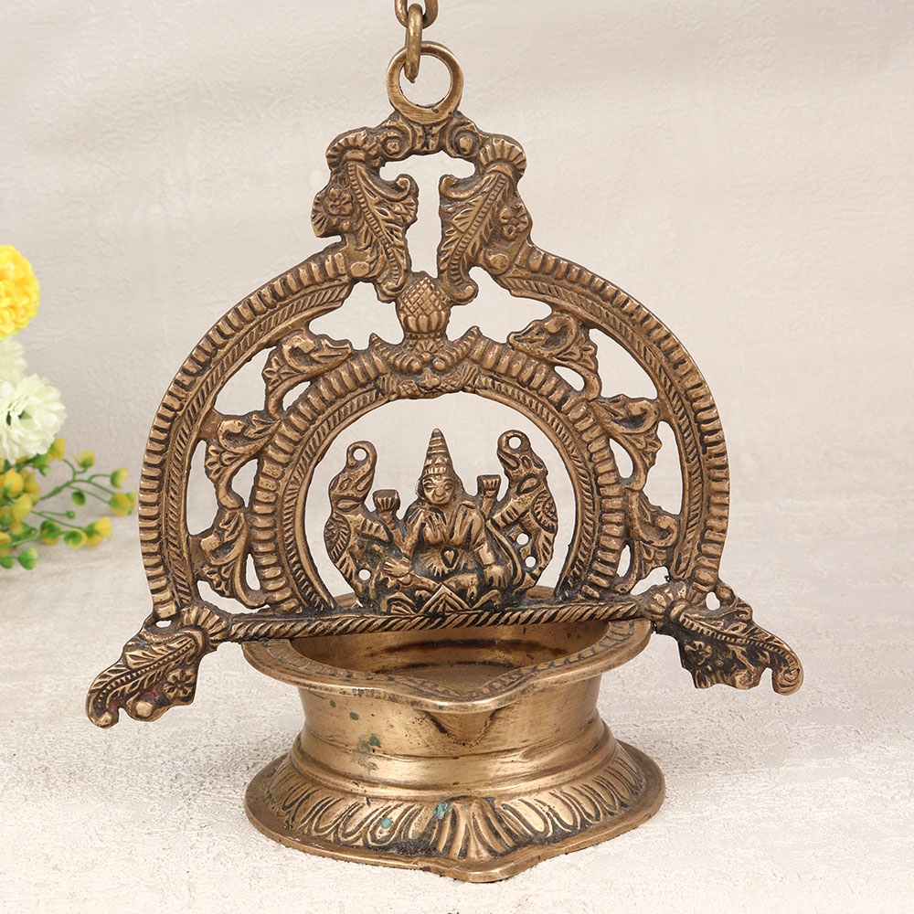 A Vintage Brass Hanging Gajalakshmi Oil Lamp that brings the rich heritage of South Indian craftsmanship to your sacred and personal spaces. This exquisite lamp is adorned with intricate details and is meticulously handmade by highly skilled Indian artisans using high-quality brass, reflecting the epitome of artistic finesse. The antique brown finish adds a touch of old-world charm, making it a perfect addition to your vintage collection. Designed with devotion in mind, this hanging lamp features the revered Gajalakshmi motif and is crafted to be lit using mustard oil or ghee with a cotton wick. Its versatile nature allows it to be suspended in temples, homes, offices, restaurants, hotels, or cafes, creating an ambiance of spiritual tranquillity. A thoughtful gift for your family, friends or relatives on special, festive, or auspicious occasions, this brass masterpiece is a symbol of tradition and elegance, echoing the timeless beauty of Indian artistry. Illuminate your surroundings with the grace of the Vintage Brass Hanging Gajalakshmi Oil Lamp and experience the divine connection it brings to your rituals and spaces.