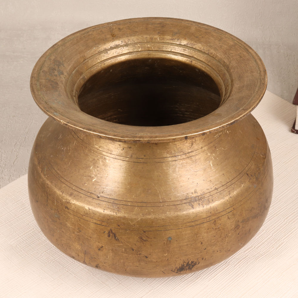 Decorate your living room with the timeless charm of our Vintage Brass Holy Pot that is a testament to exquisite craftsmanship and South Indian Artistry. Handmade by highly skilled and experienced artisans in India, this pot boasts a rich antique brown finish, adding a touch of sophistication to any environment. Crafted from high-quality brass, it exudes durability while embracing the authenticity of traditional craftsmanship. Versatile and captivating, this holy pot doubles as a unique flower pot, seamlessly blending spirituality with aesthetics. Whether adorning your home, office, restaurant, hotel, or cafe, its elegant design complements any setting. Embrace the nostalgia of a bygone era by incorporating it into your vintage collection, or gift it to your family, friends or relatives on special, festive, or auspicious occasions. Imbued with cultural significance and artistic finesse, this Vintage Brass Holy Pot is a treasure that transcends time, bringing a piece of Indian heritage to your cherished spaces.