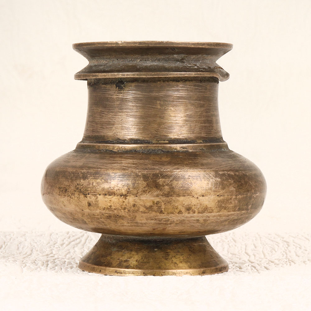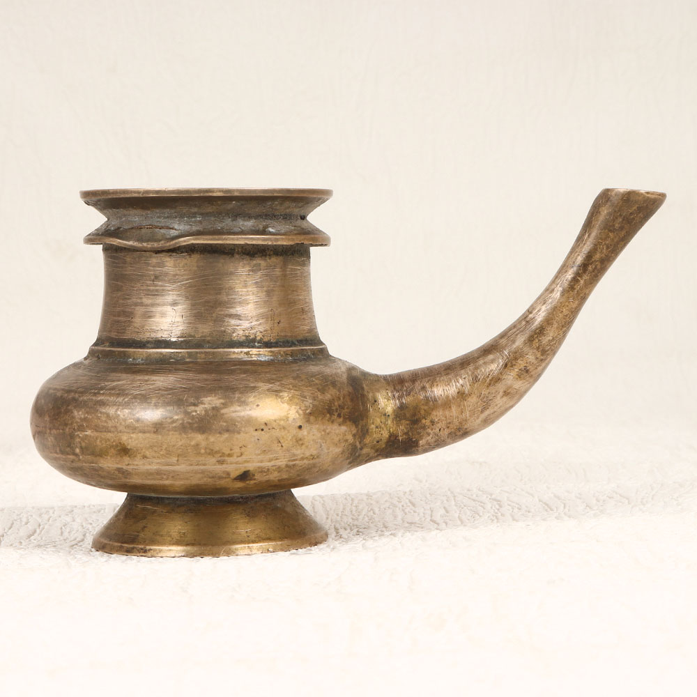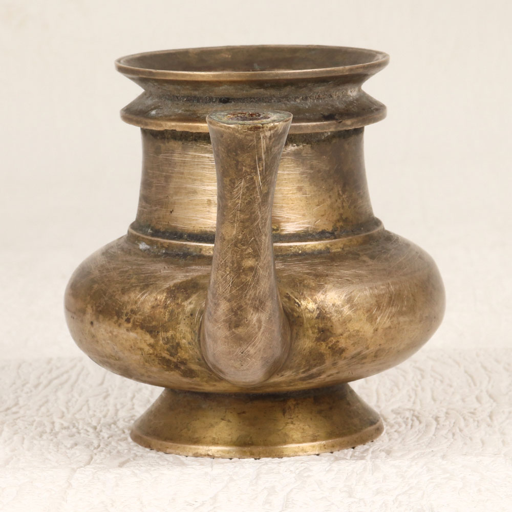 This Vintage Brass Pot with Spout is a timeless piece meticulously handcrafted by highly talented Indian artisans from South India. Crafted with precision and devotion, this pot is made from high-quality brass, showcasing an authentic antique brown finish that adds a touch of elegance to any space. Primarily designed for use during prayers, rituals, and havans, this pot serves as a sacred vessel to hold holy water. Its spout ensures a graceful and controlled pour, making it an essential accessory for spiritual practices. Beyond its spiritual significance, this pot doubles as a captivating decor item suitable for homes, offices, restaurants, hotels, or cafes, particularly within prayer rooms. The pot's vintage charm makes it a delightful addition to any collection of antiquities. Its versatile aesthetic makes it an excellent gift choice for your family, friends or relatives on special, festive, or auspicious occasions. Whether placed as a focal point in a sacred space or used to enhance the ambiance of a room, this Vintage Brass Pot with Spout seamlessly blends tradition and beauty, embodying the artistry of Indian craftsmanship.
