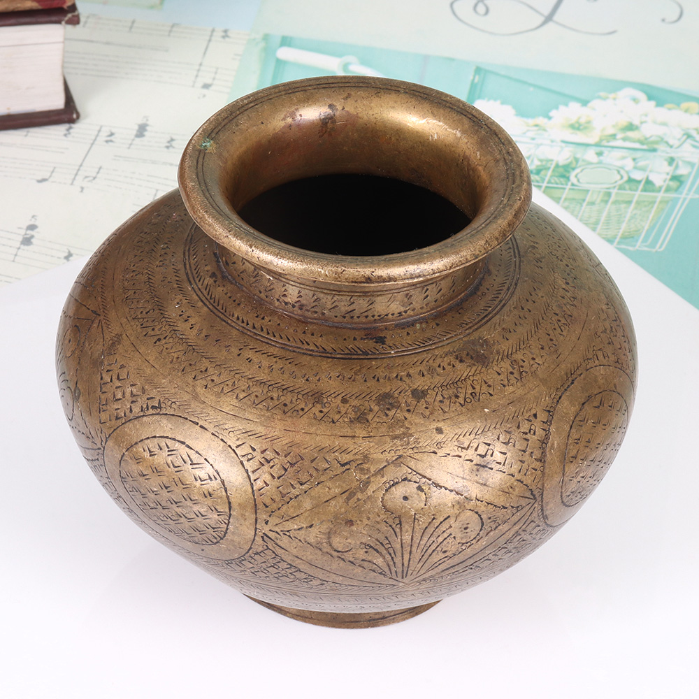 Discover the captivating allure of this one-of-a-kind antique brass holy water pot, meticulously crafted by skilled artisans in the renowned region of Gujarat, India. Imbued with centuries of sacred tradition, this stunning vessel is a testament to the enduring beauty and significance of ritual objects. Elevate your spiritual practice and infuse your environment with a sense of timeless reverence. This antique brass holy water pot is more than just a functional vessel - it's a work of art that will captivate the senses and transport you to a realm of profound connection. Whether you're a devoted follower of Hinduism, Buddhism, or any faith that incorporates sacred water ceremonies, this exquisite piece will become a cherished companion on your spiritual journey. Allow its radiant presence to inspire you, guide you, and deepen your relationship with the divine. Unlock the mystical power of this antique brass holy water pot and let it become a transformative addition to your sacred space. Experience the awe-inspiring beauty and profound significance of this timeless treasure, and let it elevate your rituals and décor to new heights of reverence and wonder.