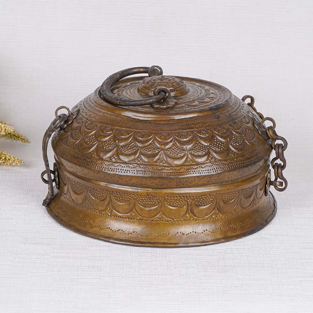 Buy a brass vintage jewelry box online from our website that is a true masterpiece of craftsmanship. This brown-coloured, round-shaped box is a nostalgic piece that will transport you to a bygone era. The box features a secure latch, ensuring your precious items are kept safe, while the elegant handle on top allows for easy portability. Adorned with intricate engravings, this jewelry box showcases beautiful designs that reflect the rich artistic heritage of India. This box is traditionally handmade by skilled Indian artisans, adding an authentic touch to its allure. Originally used to store jewelry in Indian households, this box now offers versatility for various purposes. Whether you seek a stylish girl’s jewelry box, a luxury jewelry box for your cherished collection, or a stunning jewelry gift box, this vintage brass creation is the perfect choice. It can store your jewelry or small keepsakes, serve as a captivating display piece at exhibitions, museums, shops, hotels, or restaurants. Furthermore, this jewelry box makes an incredible gift for your loved ones on special occasions or festive celebrations. Embrace the charm and elegance of this brass vintage jewelry box, a timeless treasure to be cherished for generations to come.