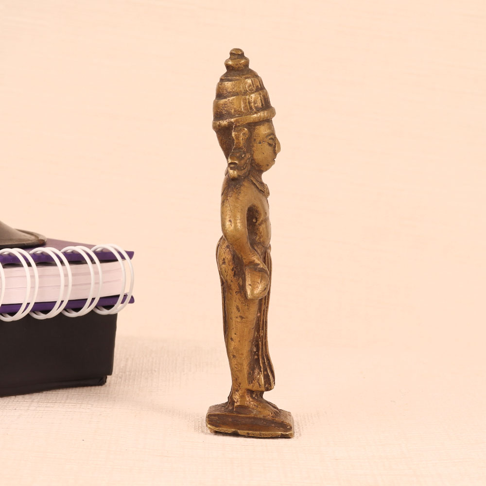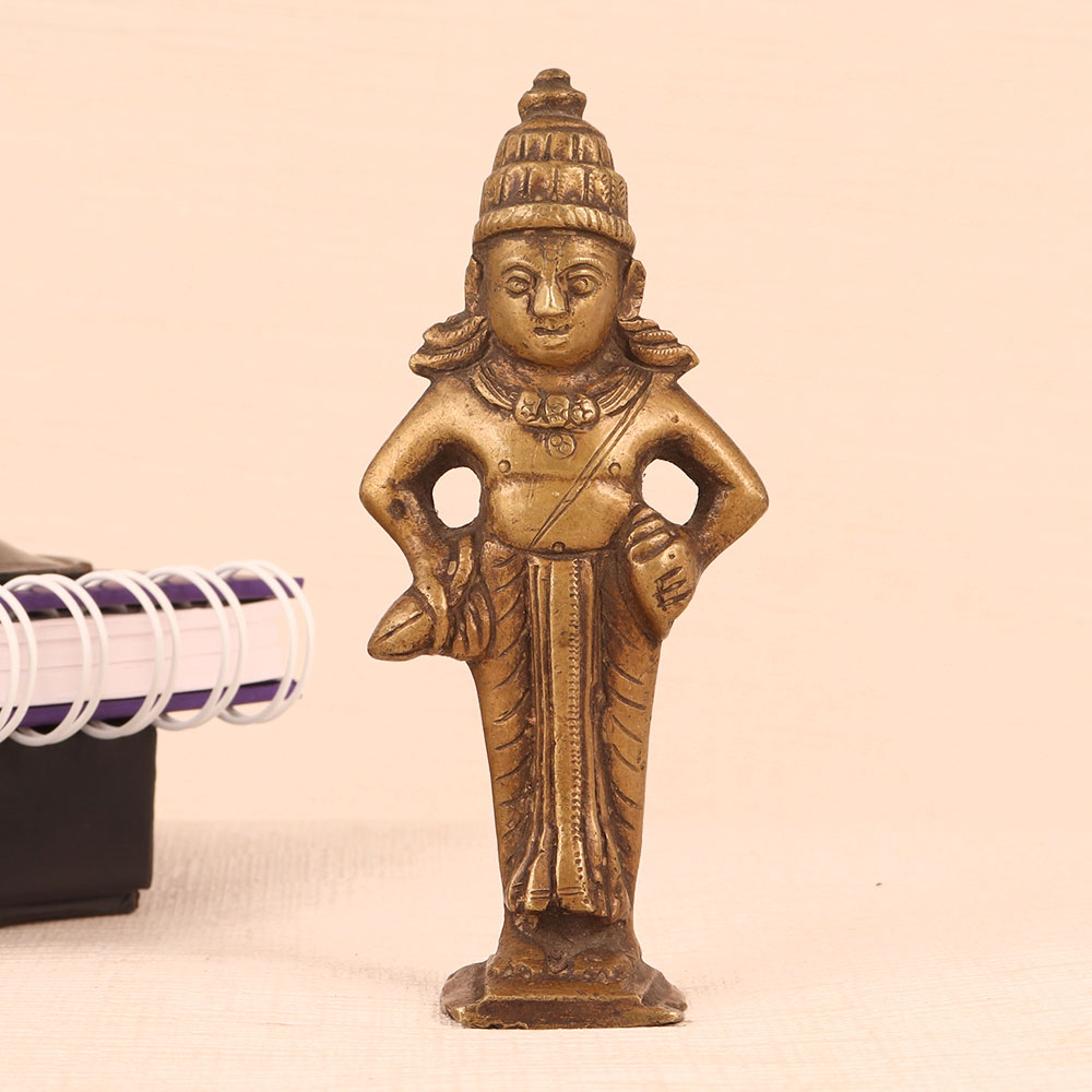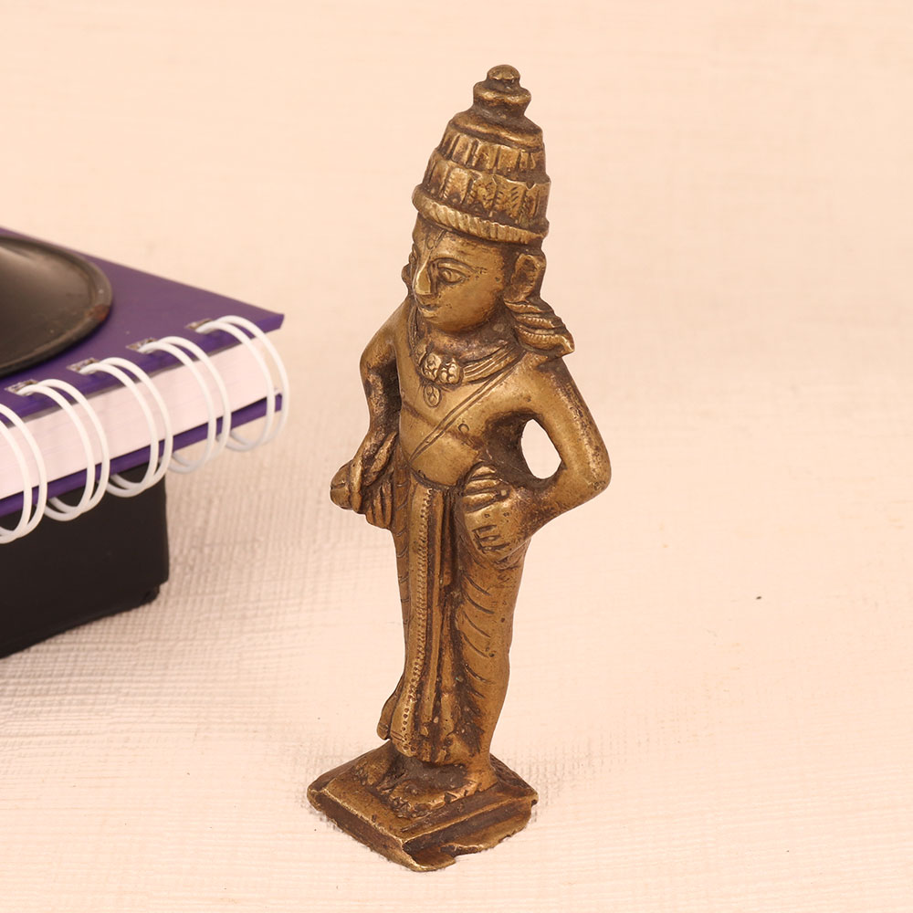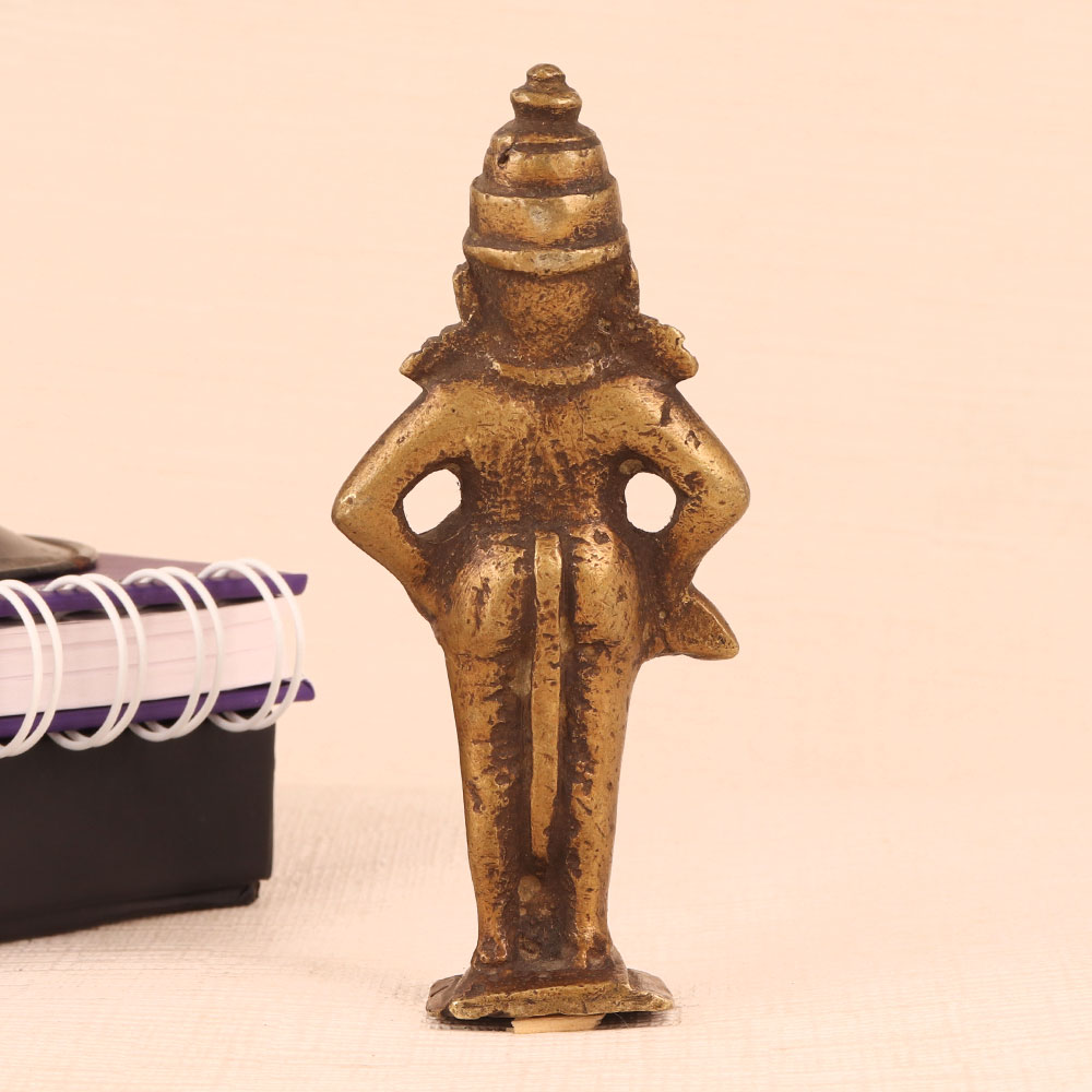 Immerse yourself in the divine presence of Lord Vitthal with this exquisite brass statue, a true testament to the artistry of highly talented Indian artisans. Standing gracefully on a sturdy platform, this majestic sculpture captures Lord Vitthal in all His glory. Lord Vitthal, revered as an incarnation of Lord Krishna, holds a special place in the hearts of devotees for His unconditional love and devotion. His charming demeanor and enchanting flute music are beautifully depicted in this antique brown finish, bringing an aura of serenity and divinity to any space. Crafted with precision and dedication, this statue is a masterpiece of Indian craftsmanship. Handmade from high-quality brass, it radiates both elegance and spiritual significance. Place it in your home, office, restaurant, hotel, cafe, or shop's prayer room to create a sacred ambiance that invites worship and contemplation. For collectors of vintage treasures, this brass Lord Vitthal statue is a valuable addition. It carries the essence of tradition and artistry, making it a cherished item in any collection. This divine masterpiece is also a thoughtful gift choice for your family, friends or relatives on special, festive, or auspicious occasions, symbolizing your blessings and best wishes. Bring home the spiritual bliss and artistic heritage embodied in this remarkable Lord Vitthal brass statue.