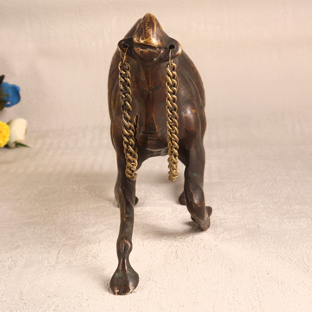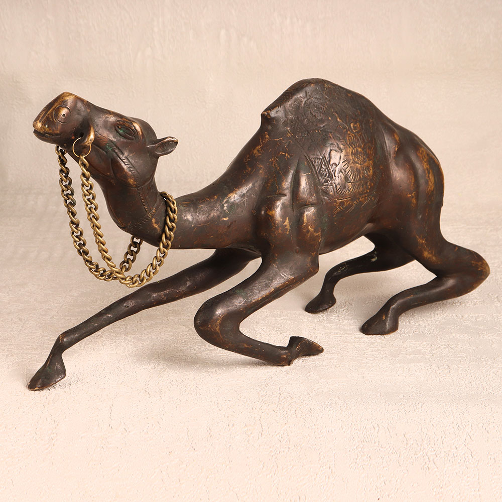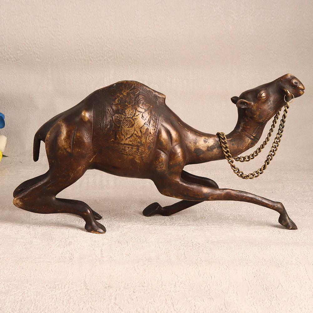 A brass statue of a half-sitting camel that is skillfully crafted by talented Indian artisans. This exquisite piece showcases a captivating antique brown finish, adding a touch of timeless elegance to any setting. Handmade with the utmost precision and care, this brass camel statue exemplifies the rich tradition of Indian craftsmanship. Its intricate details and high-quality brass construction ensure a lasting and beautiful addition to your decor. Versatile and versatile, this stunning camel statue is the perfect choice for elevating the ambiance of your home, office, hotel, cafe, shop, or restaurant. Its unique blend of artistry and vintage charm makes it an excellent addition to your antique collection or a captivating exhibit piece. Moreover, this exceptional brass camel statue is a thoughtful and symbolic gift for your family, friends or relatives on special, festive, or auspicious occasions. Its cultural significance and timeless design will be cherished by those fortunate enough to receive it. Embrace the artistry of Indian craftsmanship and make a statement with this captivating camel statue.