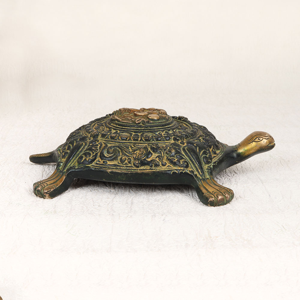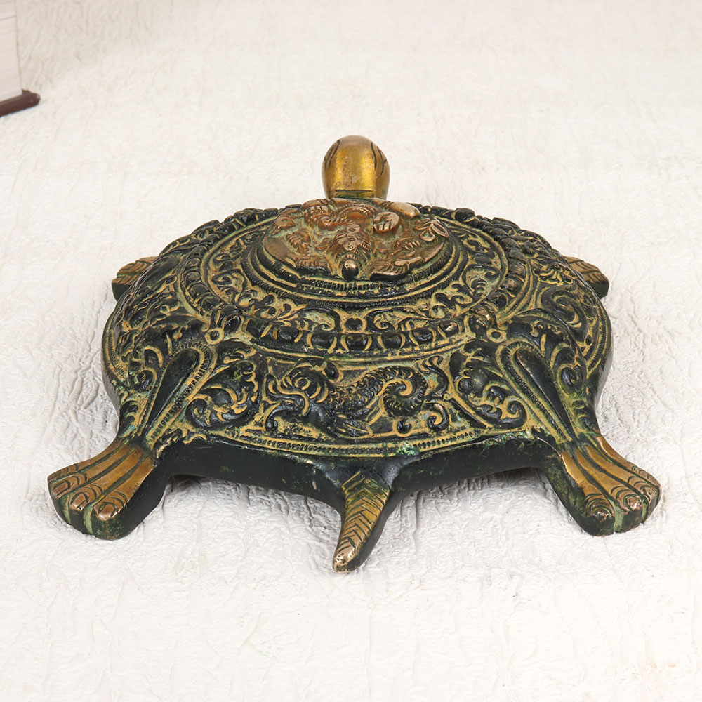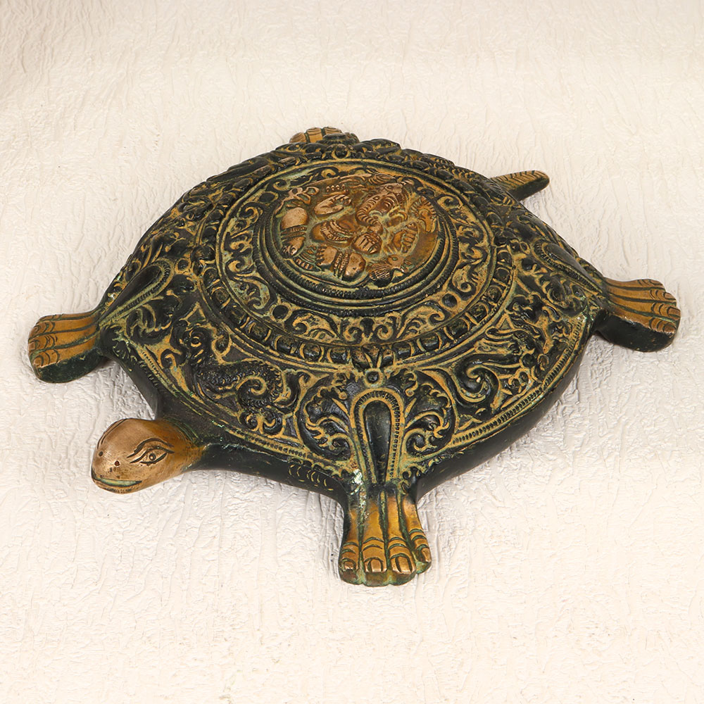 Immerse your space in the divine aura of spirituality with this exquisite Vintage Brass Statue of the Turtle Yantra adorned with Lord Ganesha. Meticulously handcrafted by highly skilled Indian artisans, this masterpiece showcases the artistic finesse and cultural richness of traditional craftsmanship. Carved with precision, Lord Ganesha graces the summit of the yantra, radiating an aura of tranquillity and blessings. The statue features a captivating brown and dark finish, enhancing its vintage appeal and adding a touch of timeless elegance. Crafted from high-quality brass, this enduring piece is not just a symbol of devotion but also a testament to the artisan's dedication to perfection. Versatile in its placement, this intricately designed statue finds its home in various settings – be it your home, office, restaurant, hotel, or cafe prayer room. Beyond its spiritual significance, it serves as a striking decorative piece, effortlessly blending antiquity with contemporary aesthetics. Whether adding a touch of spirituality to your living space or contributing to a vintage collection, this Turtle Yantra statue is an ideal choice. Additionally, it makes for a thoughtful and meaningful gift for your family, friends or relatives on special, festive, or auspicious occasions, encapsulating the essence of cultural heritage and divine blessings in one remarkable artefact.