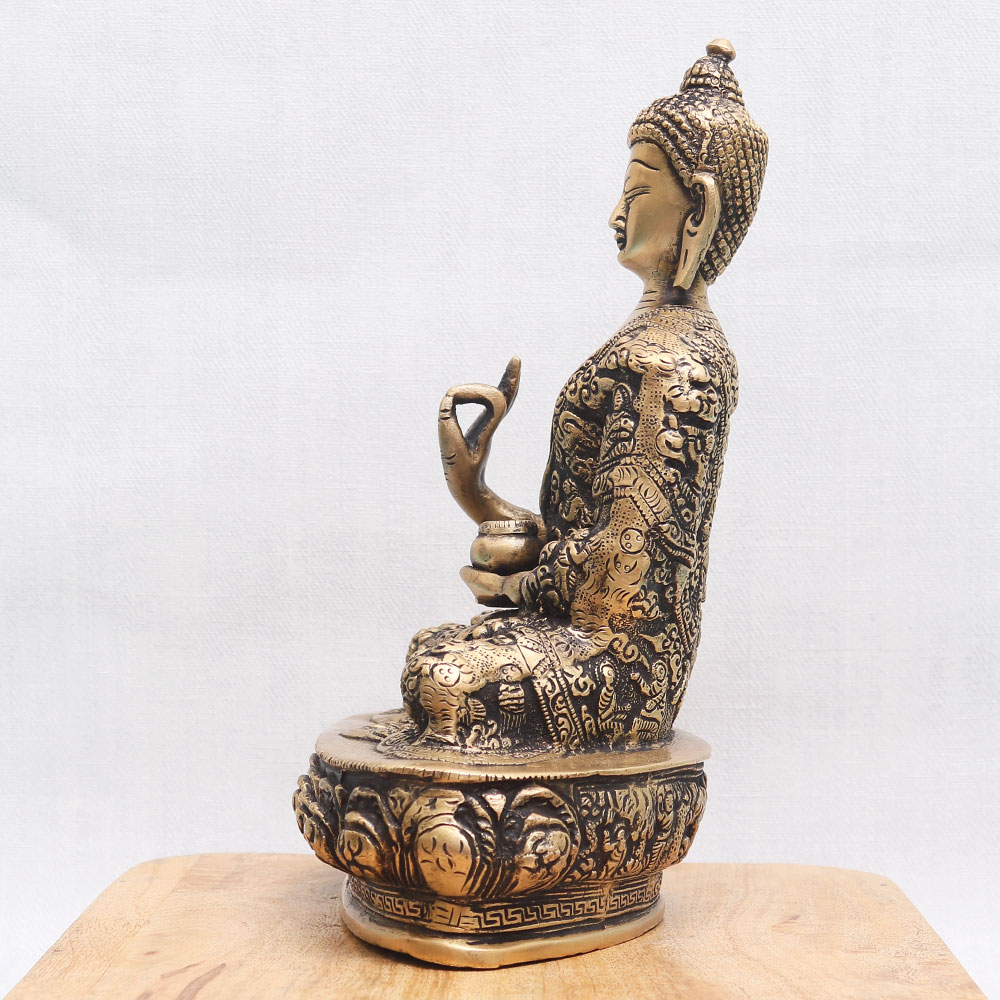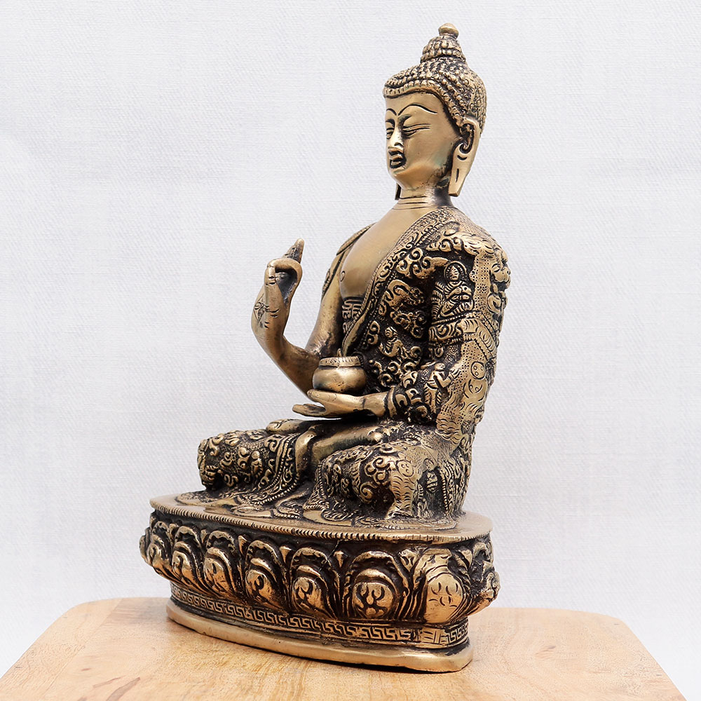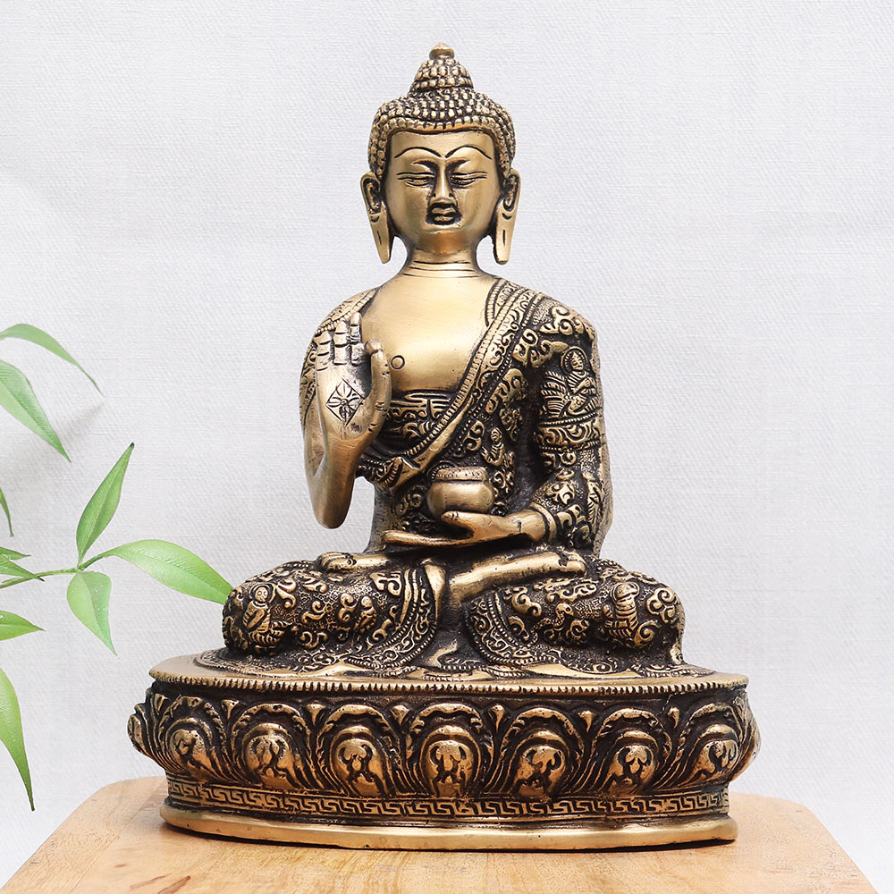 A captivating bronze statue of the Blessing Buddha which is crafted by skilled Indian craftsmen using high-quality bronze. This exquisite piece showcases the Buddha seated in a serene posture, emanating tranquillity and compassion. Handmade with utmost precision and adorned with intricate details, this statue boasts an antique finish that adds a touch of timeless elegance to any setting. Whether placed in your home, office, restaurant, or hotel, this remarkable artefact serves as a captivating decoration, elevating the ambiance and inspiring a sense of serenity. It is also a cherished addition to any vintage collection, serving as a testament to the artistry of the past. Its museum-worthy craftsmanship makes it a stunning exhibit in museums or exhibitions, allowing viewers to appreciate the intricate beauty of Indian art. Furthermore, this statue makes for an incredible gift for your loved ones on special or festive occasions. Symbolizing blessings, peace, and enlightenment, it carries a profound spiritual meaning and serves as a heartfelt gesture.