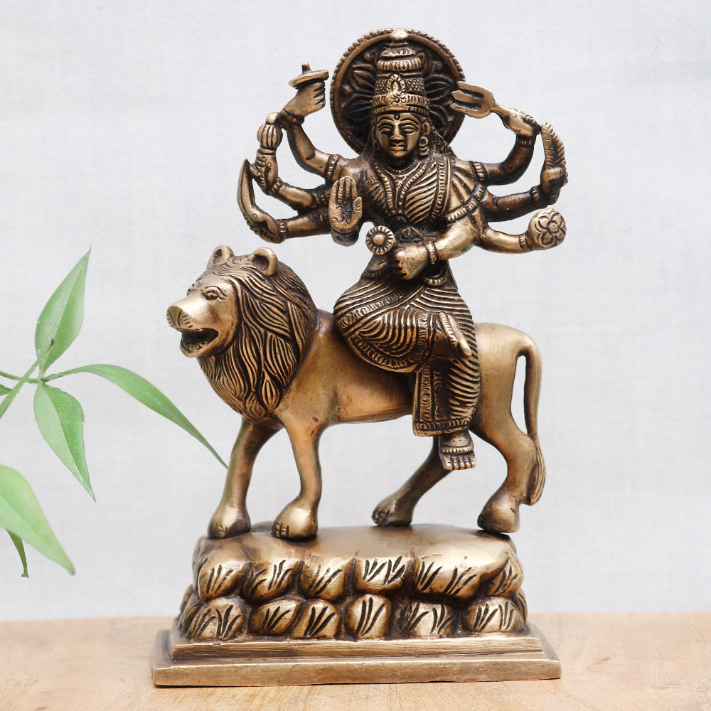 A Bronze Goddess Durga idol which depicts her sitting gracefully on her powerful Vehicle Lion. Handcrafted by skilled Indian artisans, this high-quality bronze sculpture showcases intricate details that exude elegance and grandeur. The statue's handmade artistry adds a touch of uniqueness, while the antique finish lends it a timeless allure. Ideal for adorning your home, office, restaurant, hotel or temple, this exquisite idol of the divine goddess invites reverence and devotion. Additionally, this collectible piece makes a splendid addition to any vintage collection, museum, or exhibition, showcasing the artistic heritage of India. Its presence enhances the spiritual ambiance and creates a serene atmosphere for worship. This god sculpture doubles as a stunning decorative item, bringing beauty and charm to any space. Moreover, it serves as an auspicious gift for your family, friends, or relatives, perfect for special and festive occasions.