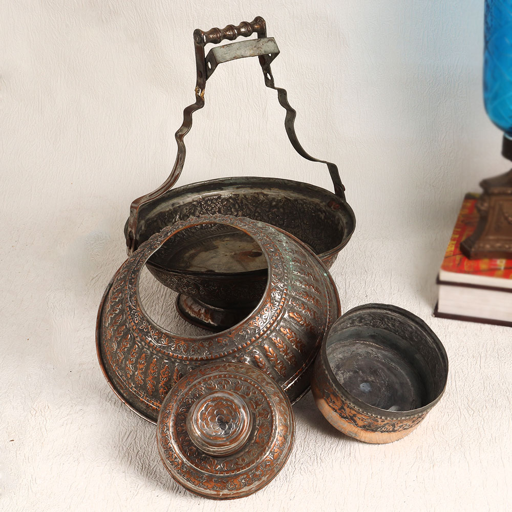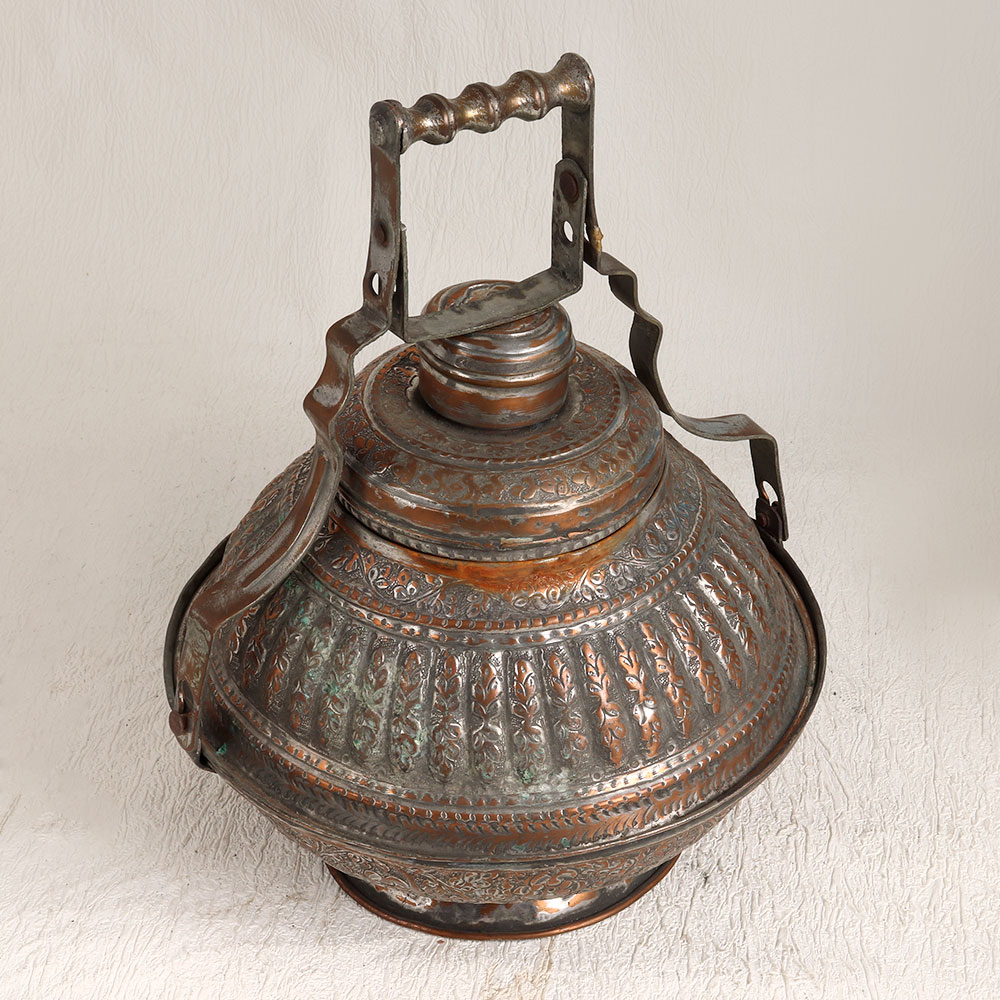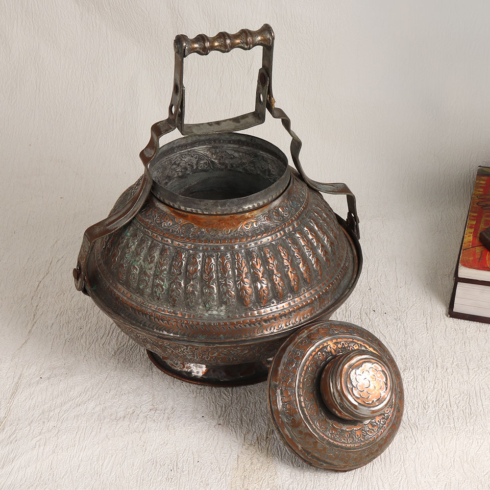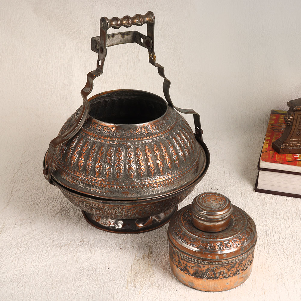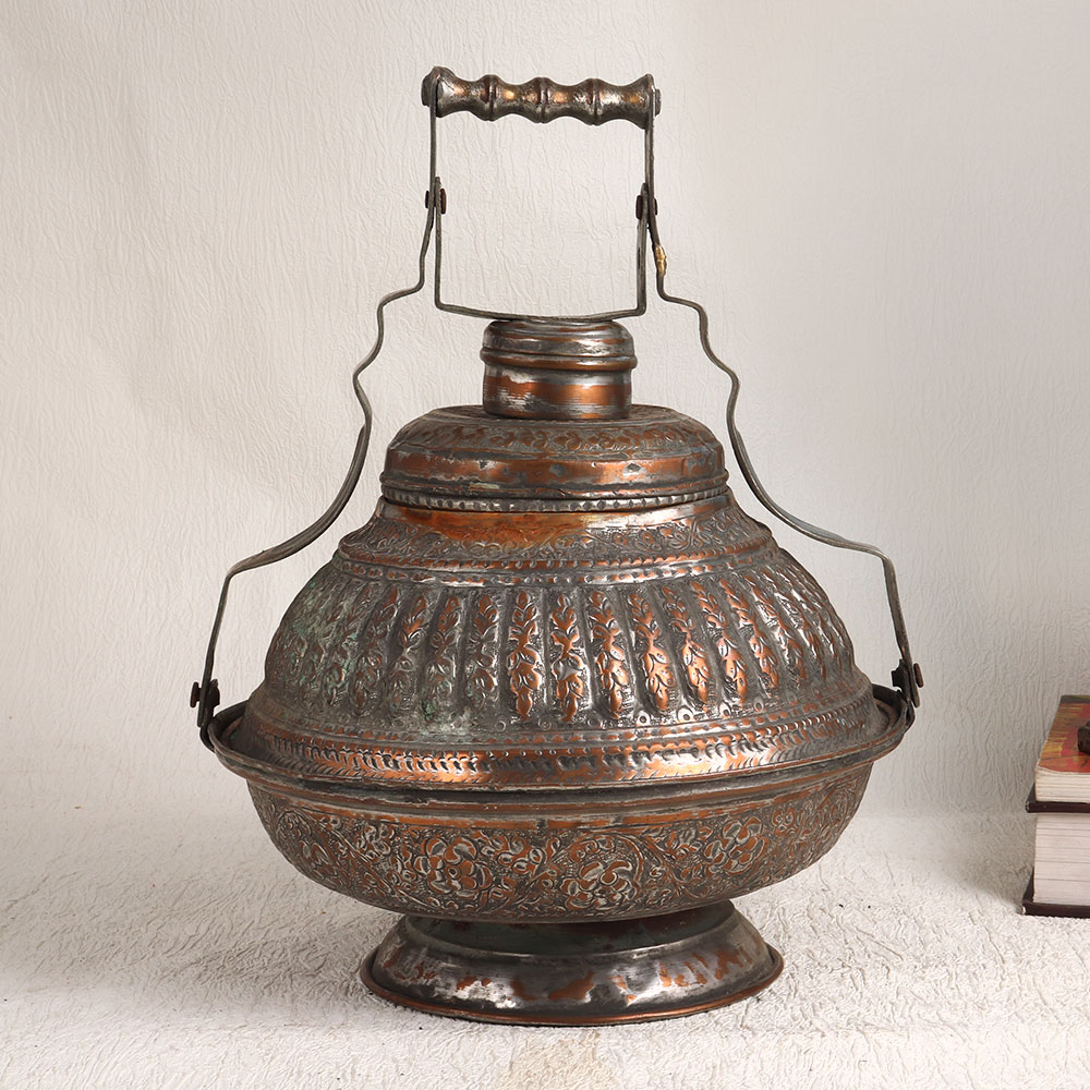 Buy a Vintage Copper Unique Box with a beautifully carved handle and an antique brown finish. Handcrafted by skilled Indian artisans, this piece is a testament to the artistry of the Islamic tradition. Crafted from high-quality copper, this vintage box embodies the intricate craftsmanship that has been passed down through generations. While it's a stunning work of art, we recommend using it primarily for decorative purposes due to its vintage nature. This remarkable piece will be a showstopper in any setting, whether it's your home, office, restaurant, hotel, cafe, or shop. The ornate carvings and warm, antique brown finish add a touch of opulence to any space, making it a standout conversation piece. Ideal for collectors of vintage treasures, this box is a valuable addition to your collection. Furthermore, it makes for a thoughtful and memorable gift for your family, friends or relatives on special, festive, or auspicious occasions, infusing their space with the charm and history of this unique piece.