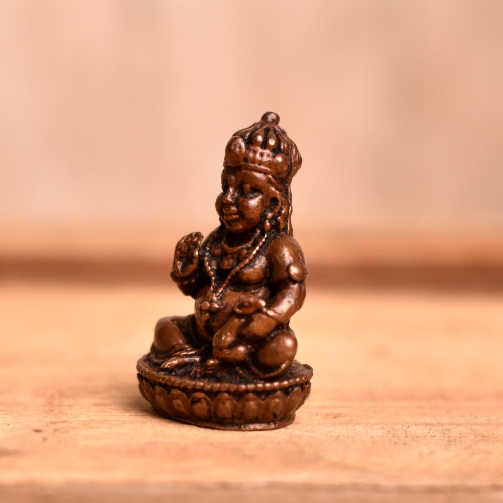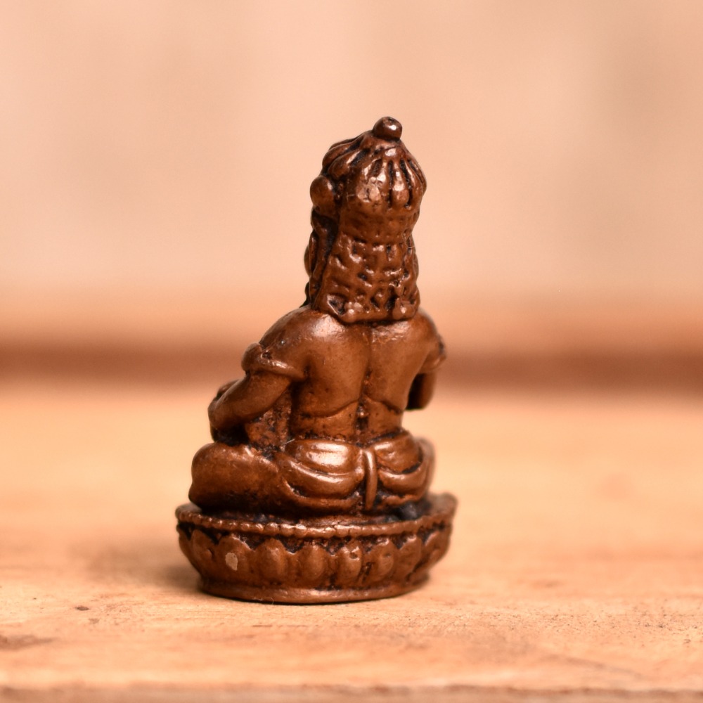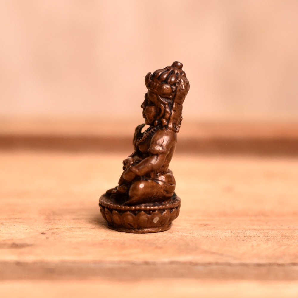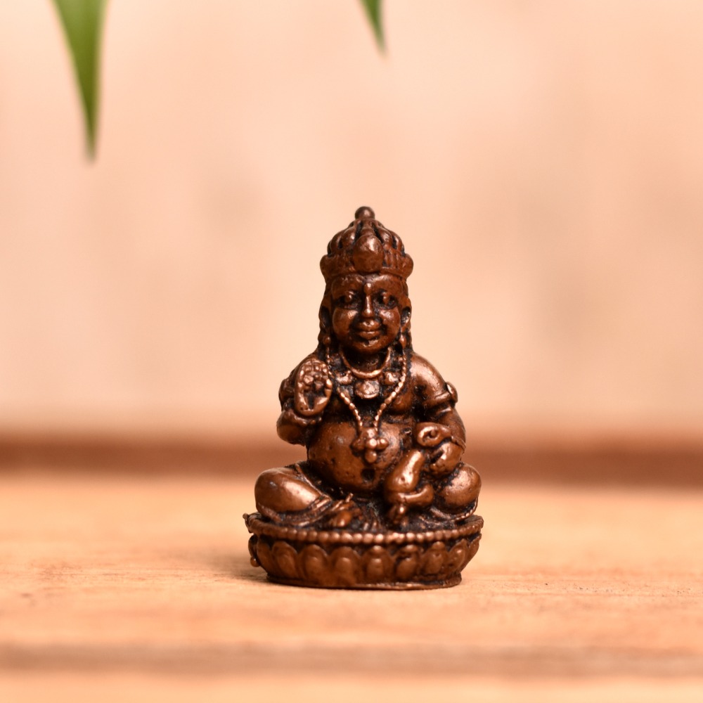 An exquisite Indian god statue depicts Lord Kubera, the God of wealth, seated in a serene pose with intricate details crafted by skilled Indian artisans. Made entirely by hand with a copper metal finish, this statue is believed to bring good fortune and prosperity to the owner. The Copper Lord Kubera statue is a popular item for those seeking to add a touch of Indian culture to their prayer room at home, office, restaurant, hotel, cafe or shop. It is a perfect item for religious or spiritual individuals looking to enhance their worship rituals or meditation practices. This beautiful statue can be bought online, making it easy for anyone to purchase this work of art from anywhere in the world. It is also an excellent gifting option for loved ones on special or festive occasions such as weddings, housewarmings, or religious festivals. The Lord Kubera idol represents the pinnacle of Indian craftsmanship and is a symbol of wealth and prosperity. This statue is sure to be a cherished addition to any collection and a meaningful representation of Indian culture and spirituality.