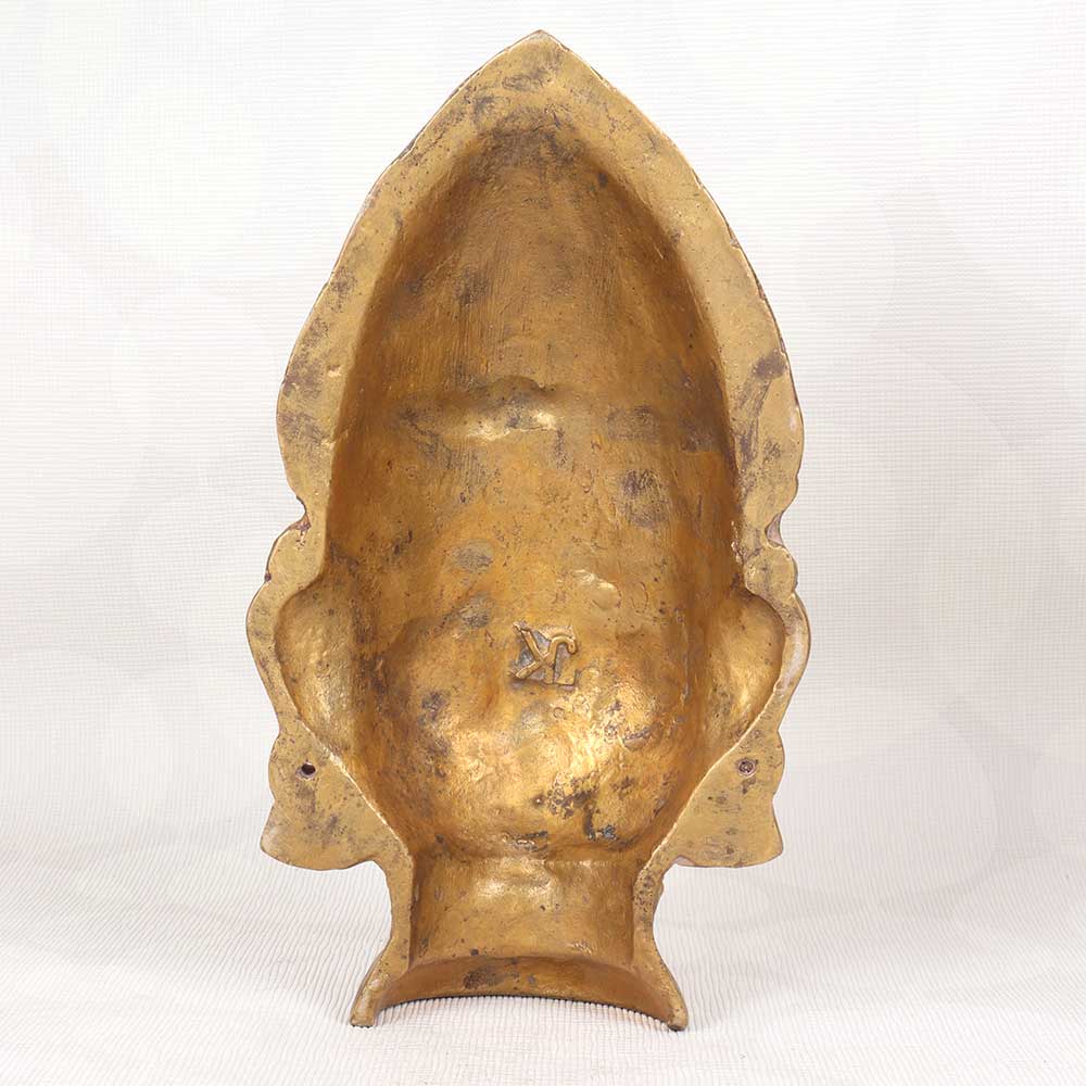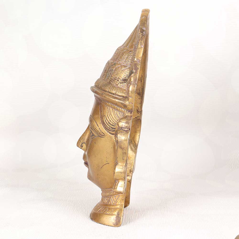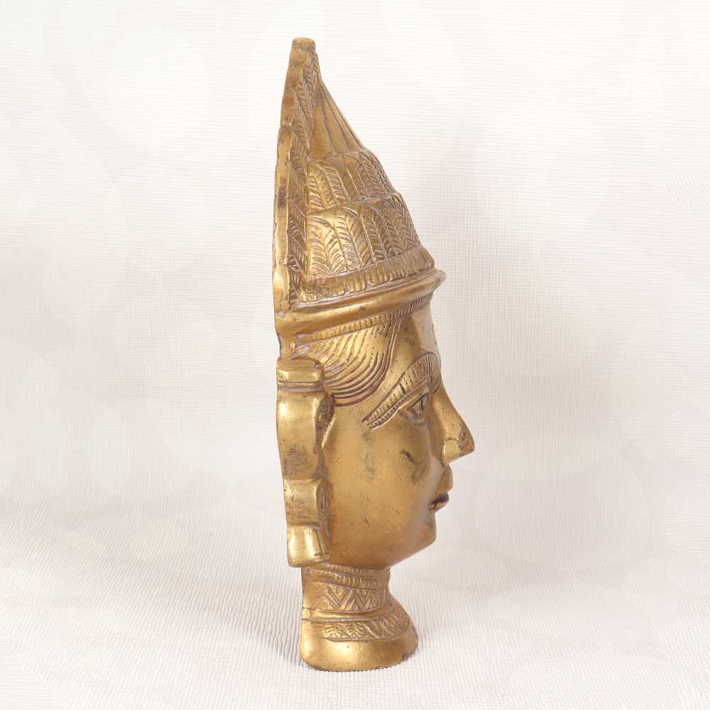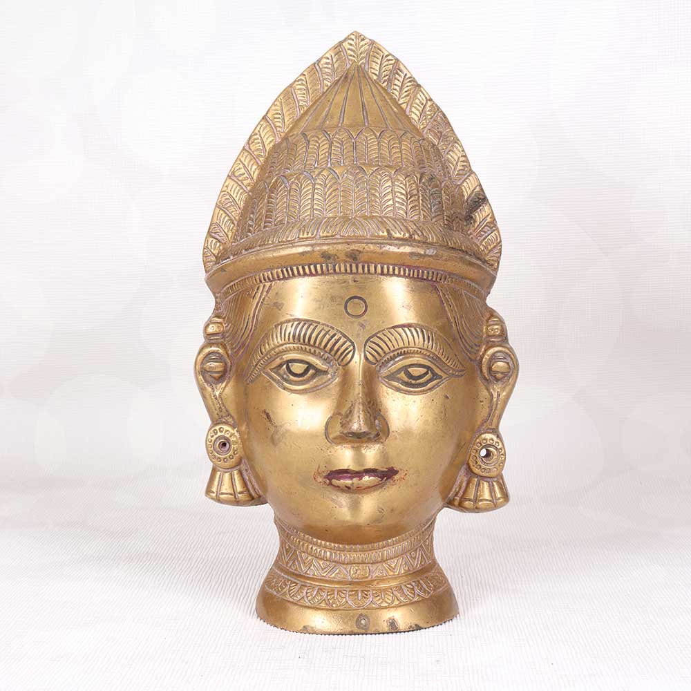 Step back in time with this antique brass Gauri head statue, an authentic relic crafted in Western India. Cast in solid brass with exquisite detail, this Hindu goddess effigy will infuse your home with old-world allure. Admire the sublime serenity etched into Gauri's face, her eyes downcast in tranquil contemplation. Intricate patterns adorn her jewelry and traditional headpiece, evidence of the masterful metalworking techniques used to create this vintage sculpture. Display her graceful visage on a bookshelf, console table or entryway credenza to welcome guests with her calming energy. For collectors of Hindu iconography or anyone fascinated by Eastern spiritual motifs, this antique Gauri head is a striking accent piece. Her warm, lustrous brass finish adds a sophisticated glimmer to any room. Let this vintage Indian goddess statue connect you to the spiritual roots of yoga and remind you to nurture inner peace. She brings an air of tranquility and devotion to any home.