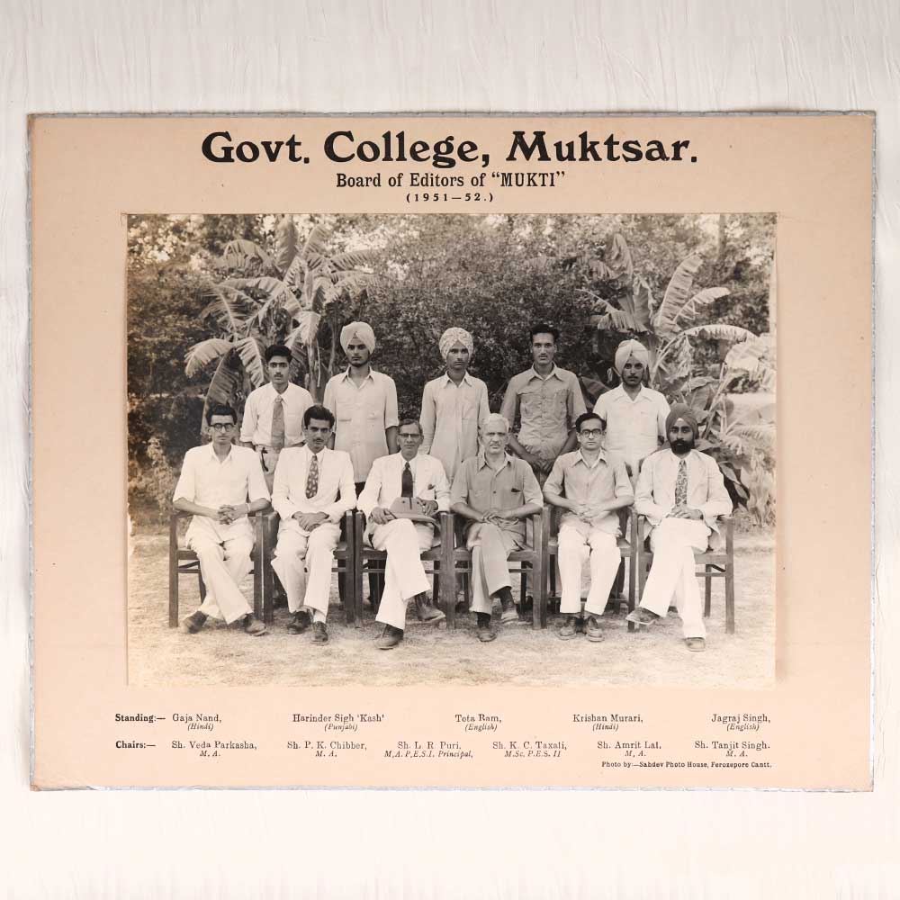 Step back in time with this one-of-a-kind vintage 1951-52 photograph from Govt. College, Muktsar! Showcasing the Board of Editors of the college magazine 'Mukti', this stunning black and white print will transport you to the halls of this prestigious Indian institute. This is your chance to own an authentic piece of history straight from the Govt. College archives. The editors are pictured together, dressed smartly and exuding scholarly sophistication. This rare photograph offers a portal into the past, allowing you to envision college life in a bygone era. Whether you're an alum looking to relive your glory days or simply love historic photography, this print makes a fantastic addition to any home decor collection. A perfect gift for former students and professors of Govt. College, Muktsar during this time. Display it proudly and let the memories come flooding back!
