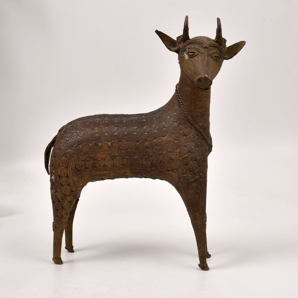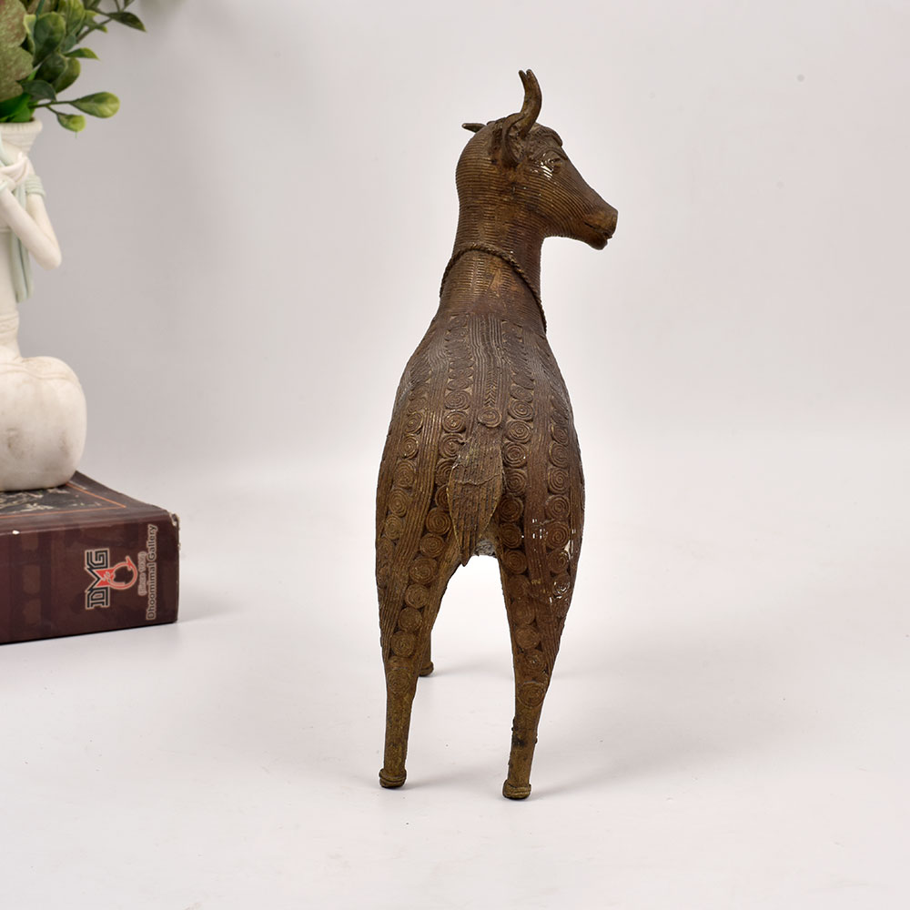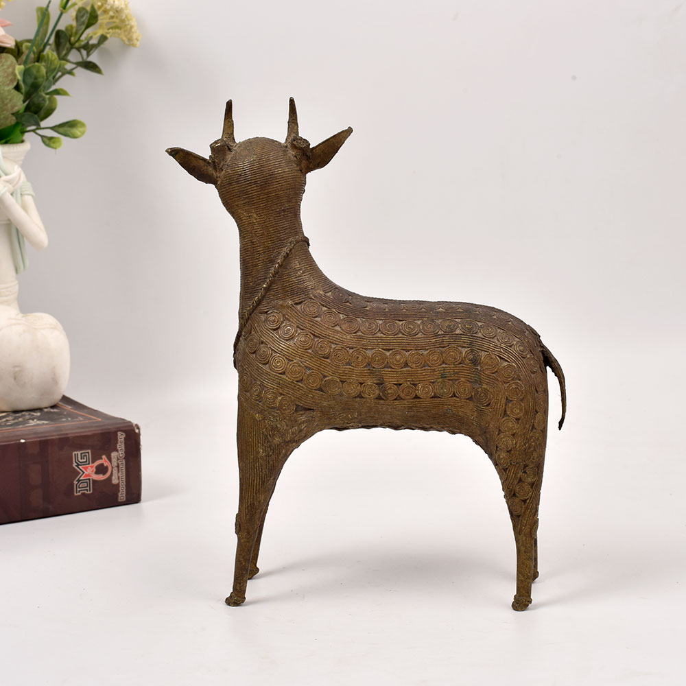 Elevate your décor with the timeless elegance of this Vintage Brass Deer Statue, a stunning representation of Odisha's renowned Tribal Art. Crafted with meticulous attention to detail, this majestic figure commands attention as a striking centerpiece or thoughtful accent piece. This impressive deer statue is more than just a decorative item - it's a work of art that celebrates the rich cultural heritage of India's Odisha region. Imagine this regal figure standing guard in your living room, evoking a sense of peaceful serenity. Or place it on your entryway table to welcome guests with its captivating presence. Whether you're drawn to the natural beauty of the deer or the fascinating tribal influences, this vintage brass statue is a must-have for any discerning home. It makes a thoughtful housewarming gift, a unique accent for an office or studio, and a conversation-starting piece that reflects your refined taste. Bring the wild wonder of the forest indoors with this exceptional work of Tribal Art.