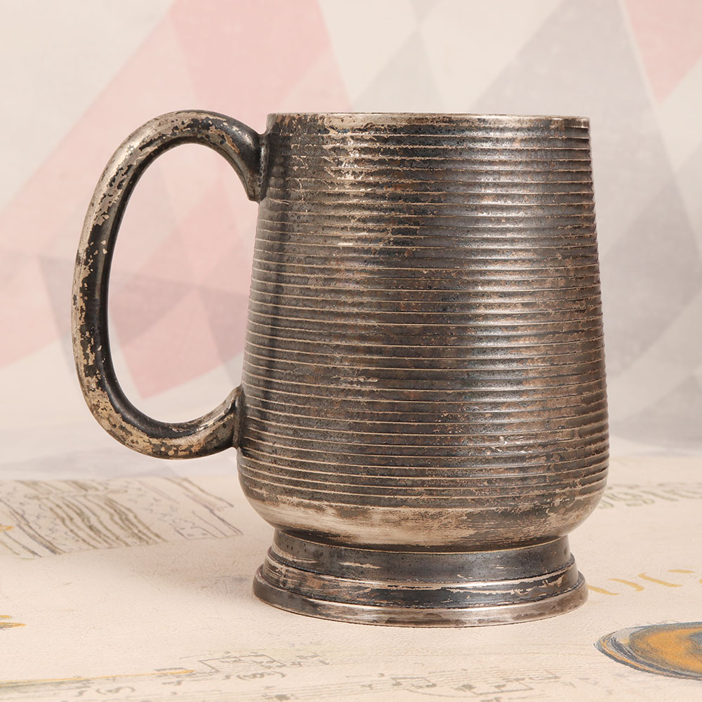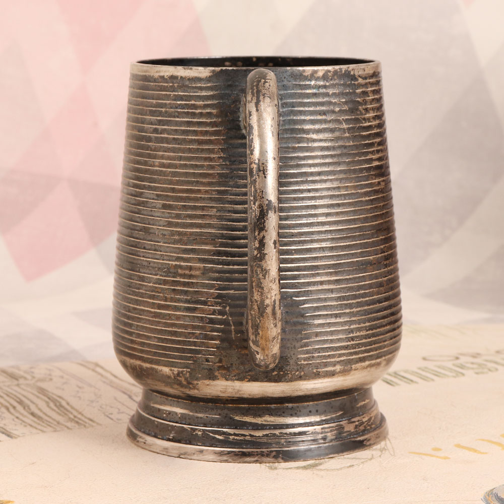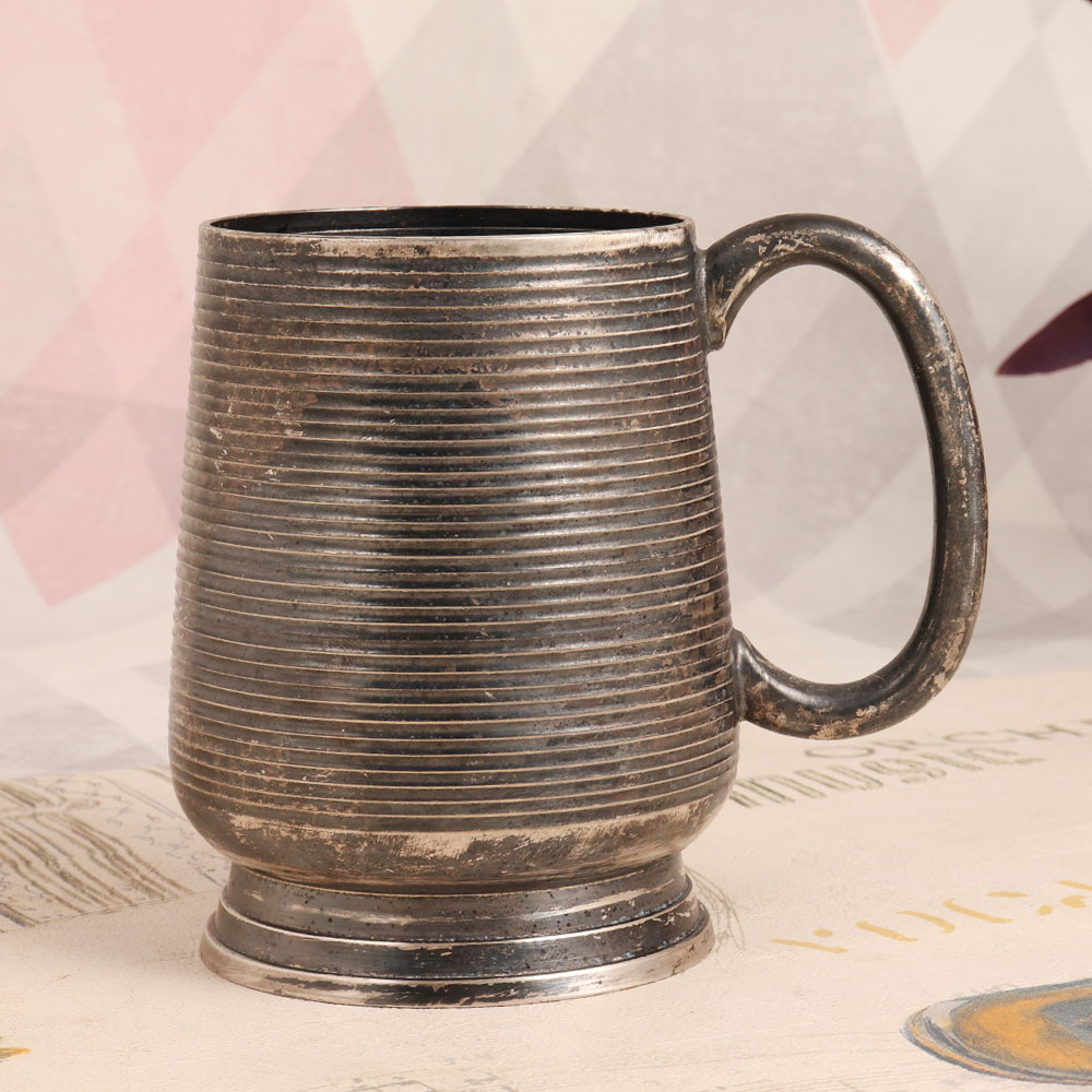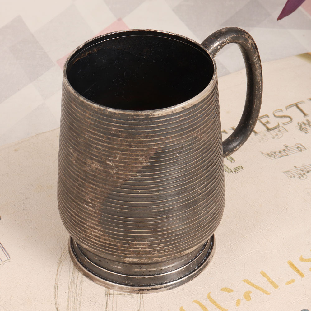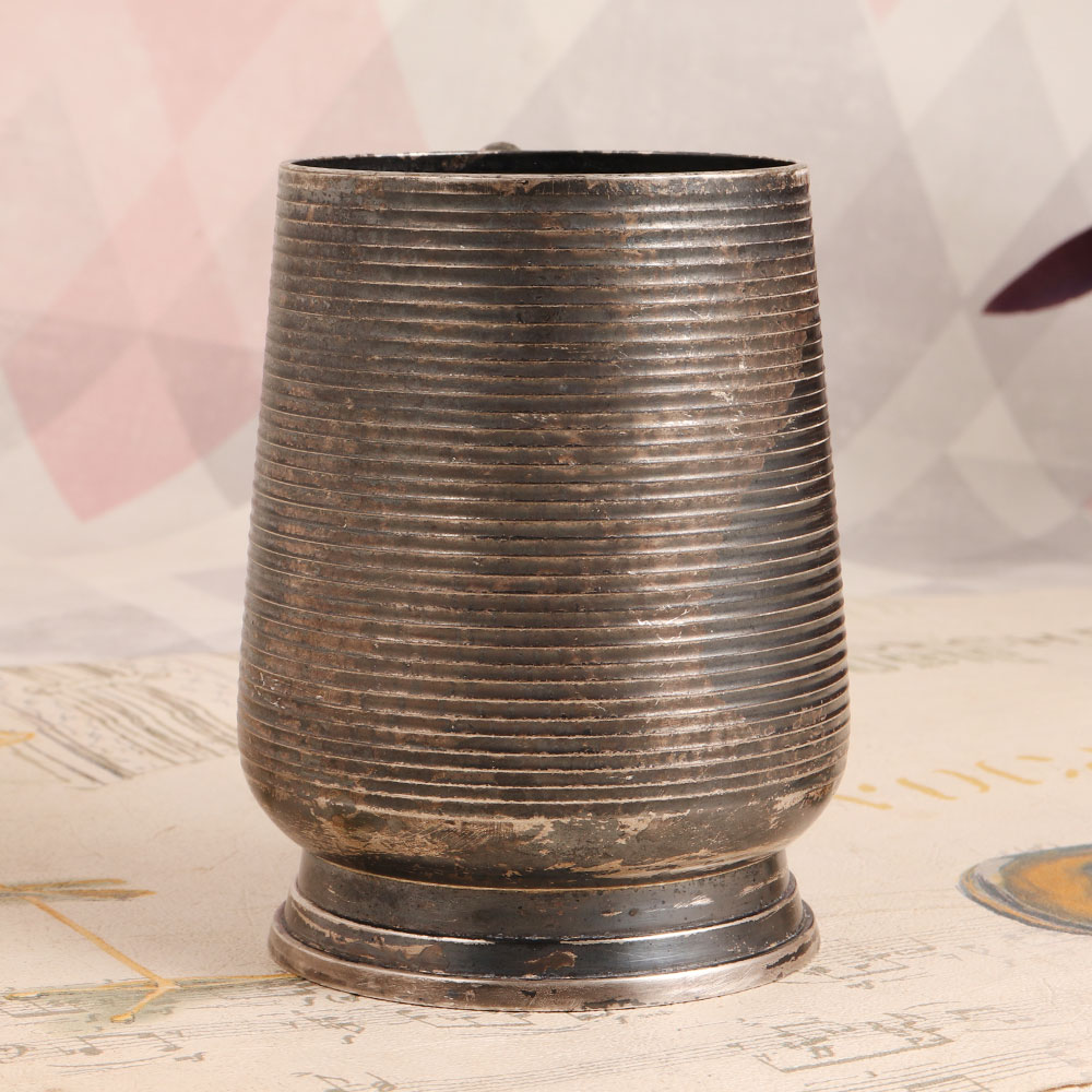 Decorate your space with a touch of timeless elegance by adding this exquisite vintage white metal mug to your collection. Handcrafted by skilled artisans in the English Art tradition, this piece is a true testament to craftsmanship and quality. Crafted from high-quality white metal and adorned with a lustrous silver plating, the mug features a charming handle and a dark finish, adding an air of sophistication to its design. While this vintage gem may not be suitable for your everyday sips, it makes for a splendid decorative accent. Place it in your home, office, restaurant, hotel, cafe, or shop to infuse an aura of vintage charm into any setting. Its unique design and classic beauty will draw the eyes of all who behold it. This vintage white metal mug also makes for a thoughtful gift, perfect for special, festive, or auspicious occasions. It's a charming addition to any vintage collection and a cherished token to be treasured by your family, friends or relatives. Let this relic of a bygone era transport you to a world of sophistication and grace.