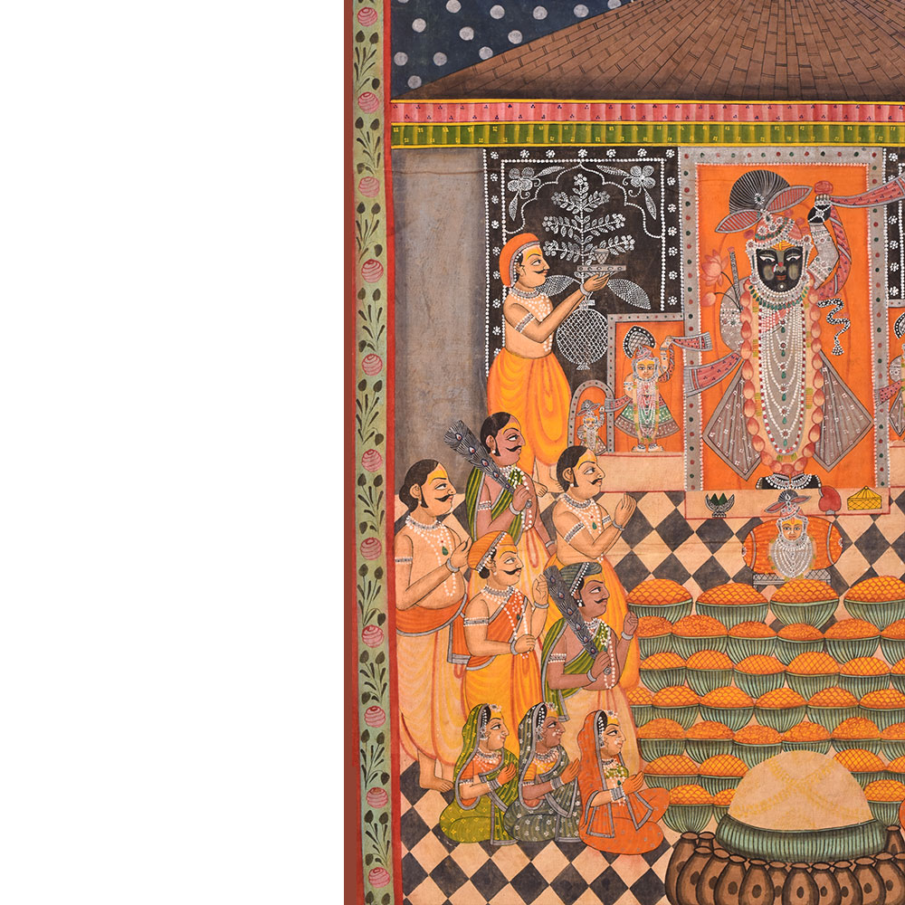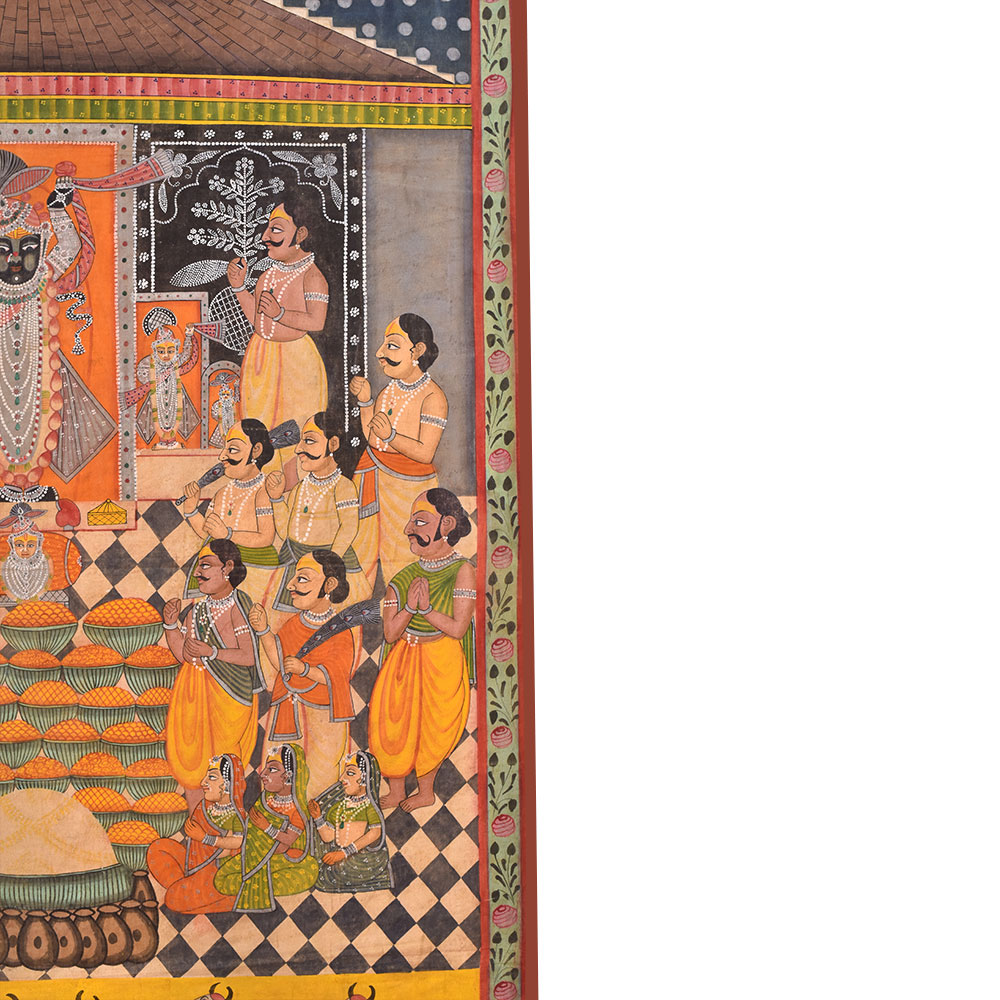 This beautiful pichwai painting on fabric cloth is an intricate work of art that depicts a Hindu God temple, surrounded by many devotees praying to the deity. The painting is created using multi-coloured hues and has been painted by professional Indian artists, making it a stunning masterpiece of craftsmanship. In the background, we can see four swan vehicles in the sky, and six cows which represent the holy and nurturing aspect of the mother goddess. The lower portion of the painting has been decorated with beautiful flowers that add to the aesthetic value of the artwork. This pichwai painting would make an excellent addition to your prayer room or temple, creating a peaceful and serene atmosphere. It can also be given as a gift to family, friends, or relatives for special or festive occasions such as weddings, housewarmings, or religious ceremonies. It is not just a piece of art, but a representation of the divine that can bring joy, peace, and blessings into your home.