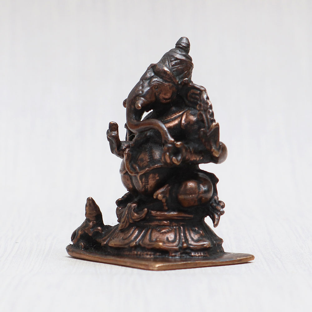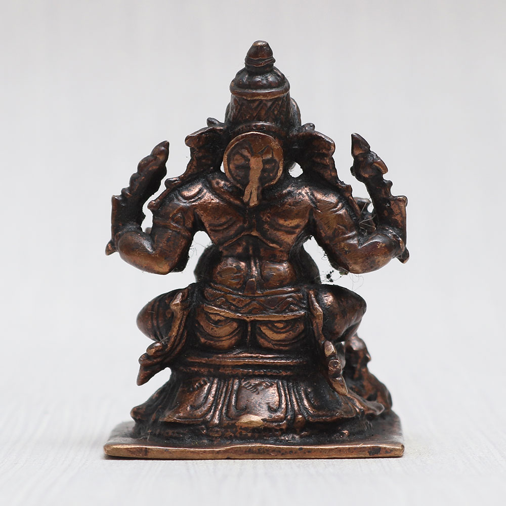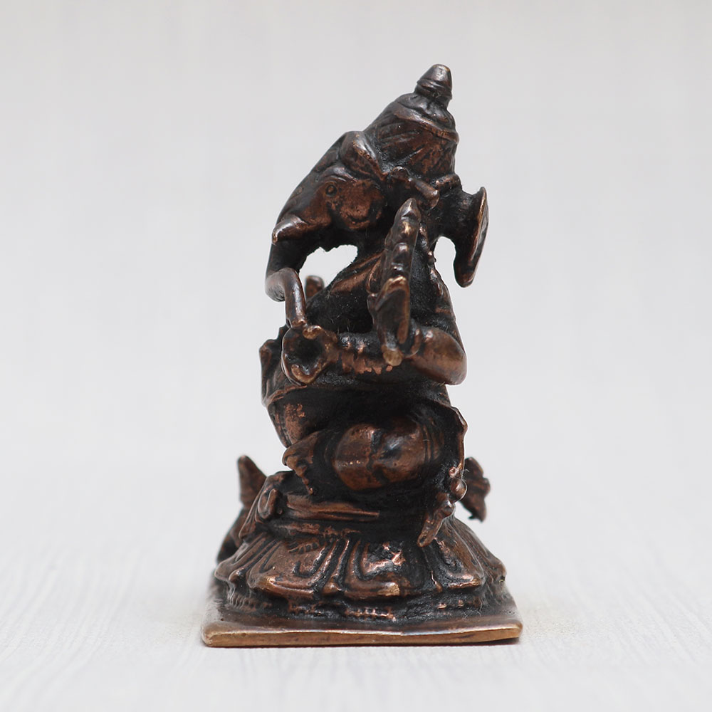 Embrace the divine aura of Lord Ganesha with this magnificent copper statue meticulously handcrafted by professional Indian artisans. Seated gracefully with his vehicle, the mushak (the mouse), this Ganpati idol exudes a timeless vintage charm that elevates the ambiance of any prayer room at home, office, restaurant, cafe, or shop. The captivating detailing of the sculpture makes it an exquisite piece for exhibitions, decorations, and collections. Ideal for worship in temples or personal devotion, this Ganesh Ji statue showcases the perfect blend of artistry and spirituality. Its auspicious presence brings blessings and positivity to any space it graces. Moreover, it serves as a heart-warming gift for your loved ones on special, festive, or auspicious occasions. Whether adorning your sacred spaces or acting as a cherished token of love, this Ganesh idol is a symbol of divine grace and devotion. Additionally, it also makes an ideal Ganpati idol for your car, completing your journey with divine blessings.