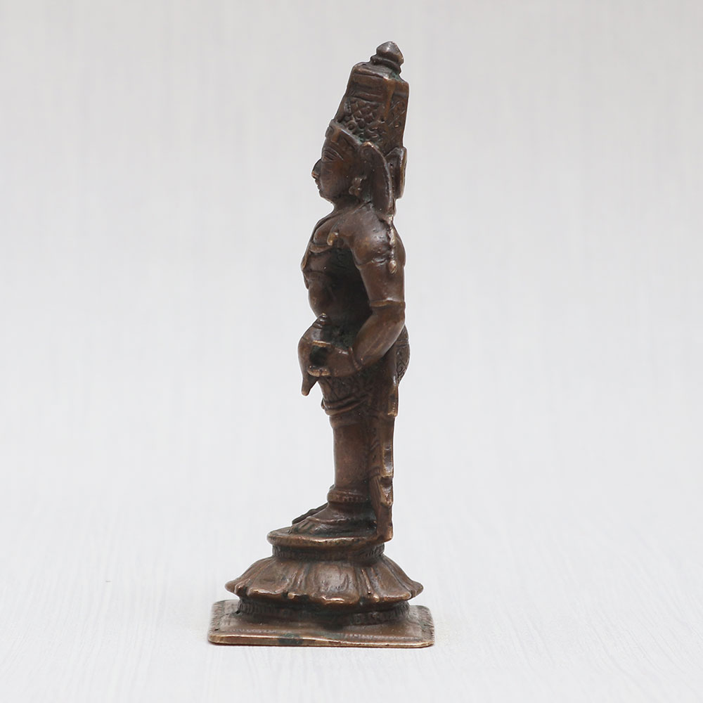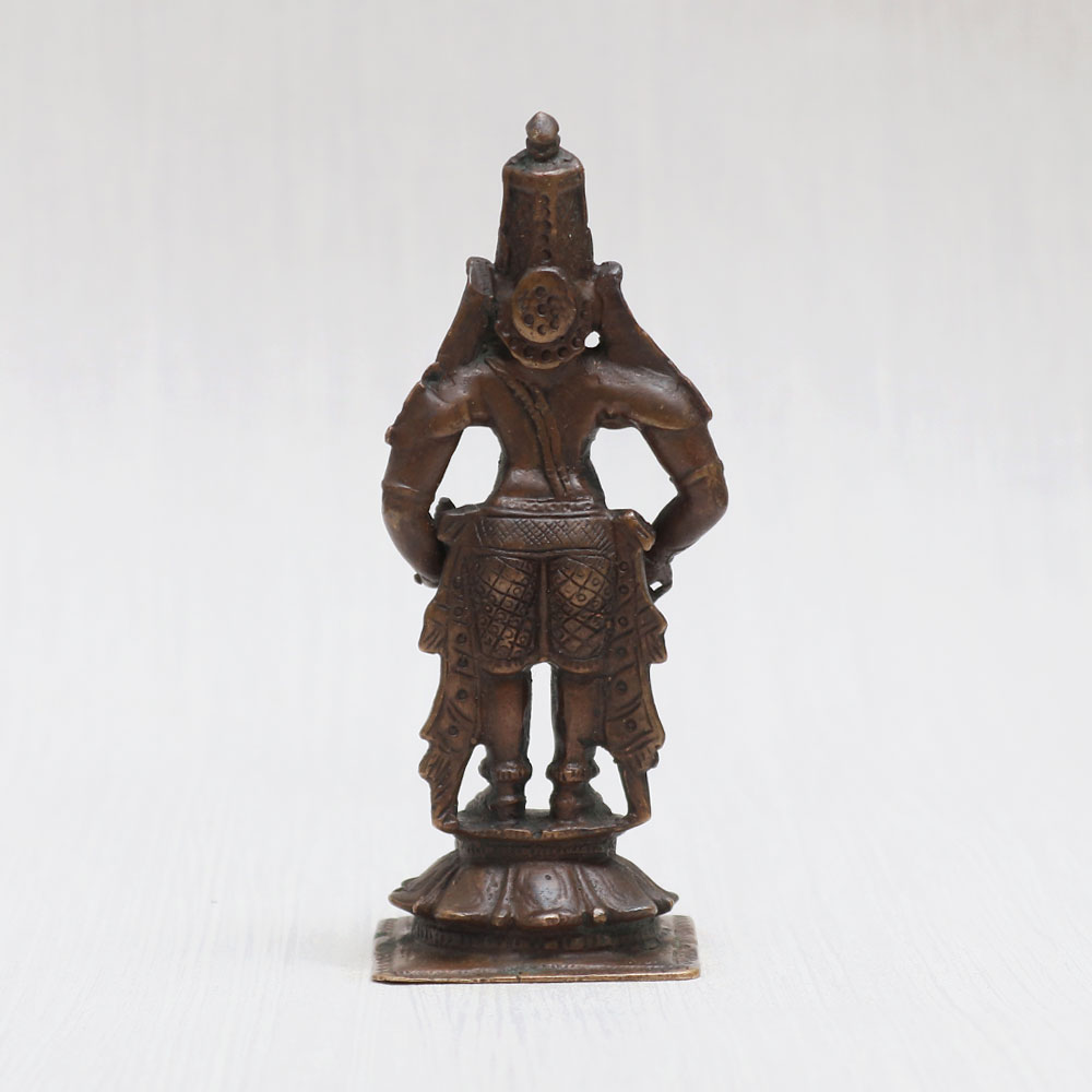 Embrace divine serenity with this exquisitely crafted copper statue of Lord Vishnu, a masterpiece handmade by skilled Indian craftsmen. Meticulously sculpted from high-quality copper, this magnificent creation stands tall on an ornate platform, boasting a vintage-style finish that adds a touch of antiquity to its allure. The statue's eye-catching detailing captures Lord Vishnu's essence, making it an ideal centerpiece for your prayer room at home, office, restaurant, cafe, or shop. Perfect for exhibitions, decorations, and collections, this statue of Lord Vishnu, among other Hindu idols and god statues for home temple online, holds timeless appeal. It offers an ideal addition to temples for worship and serves as an auspicious gift for your loved ones on special, festive, or sacred occasions. Elevate your spiritual space with this divine treasure that embodies the eternal grace of Lord Vishnu.