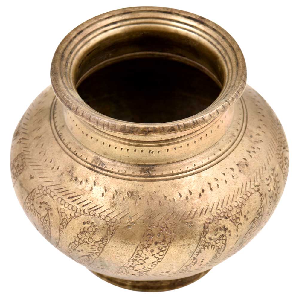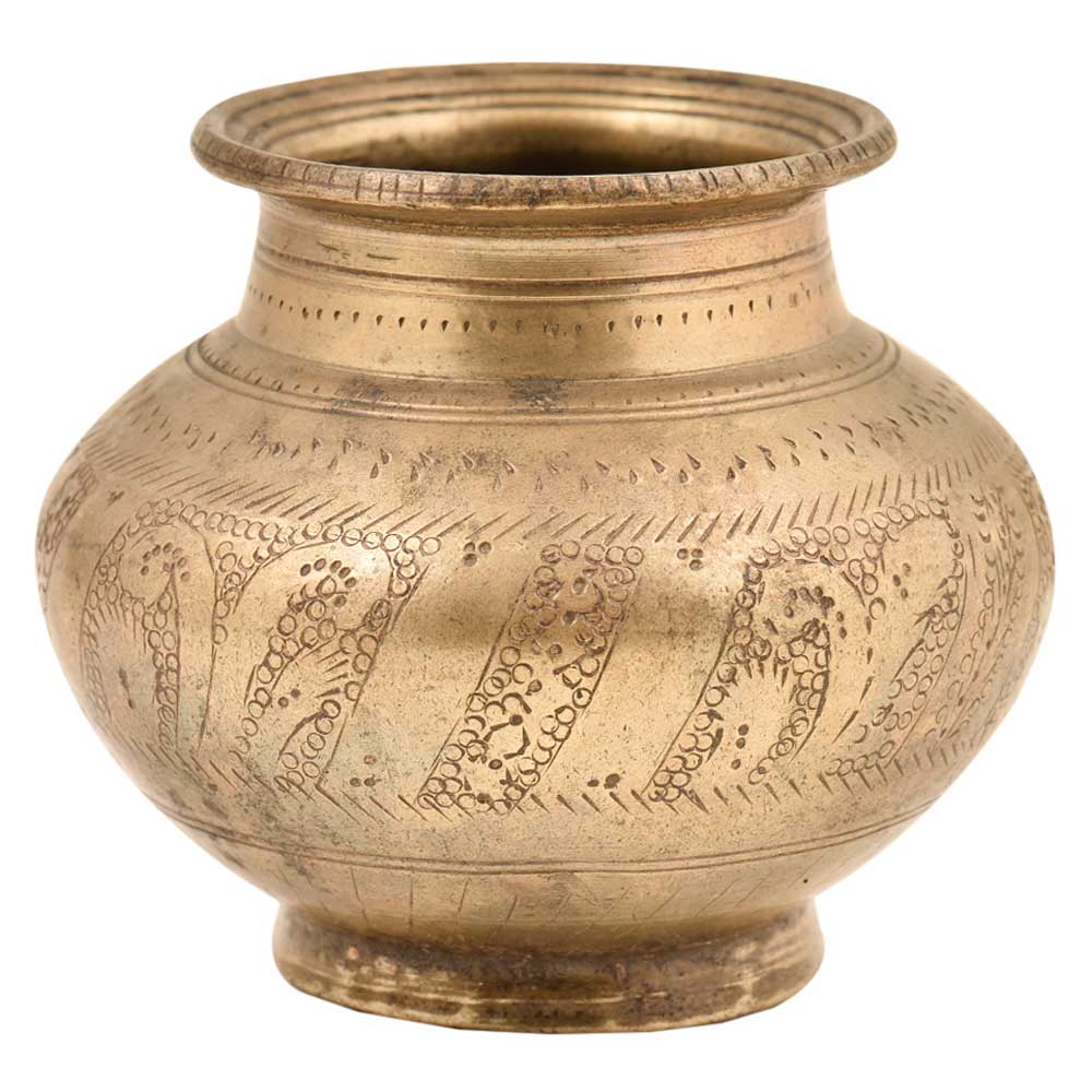 Engraved Brass Water Pot (Lota) From North India is Handmade by the Local Artisans and Each Pot has a Distinct Design No Two Pots are Identical. The Pot Carries the Distinct Design of the Time with flowers and leaves. This Exquisite Piece is a Treat for Collectors and Makes for a Wonderful Decor Accent.