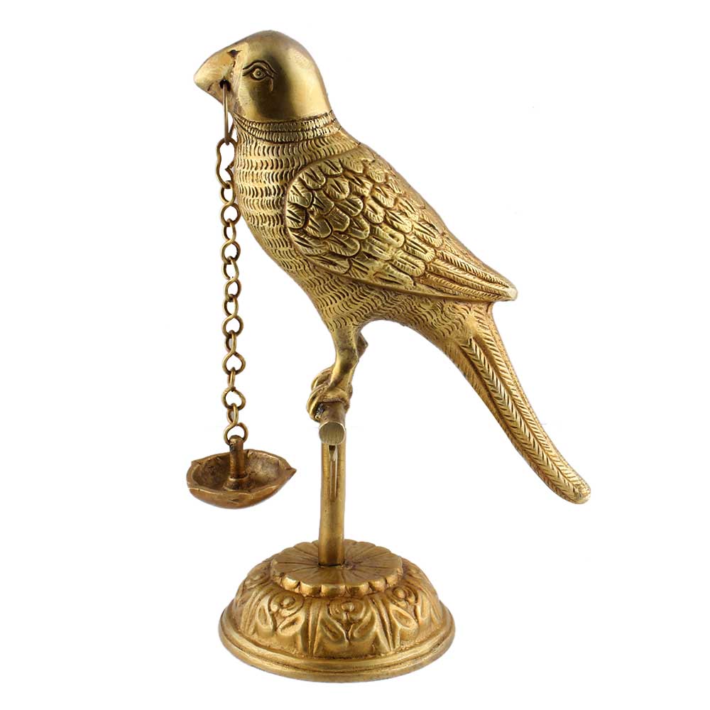 Handcrafted Brass parrot on a branch holding an oil lamp with five wicks on a lovely chain. This is a masterpiece creation of master craftsmen of India .Decorate Your Homes, Offices, Temples, Diwali gift and decoration, wedding gift, new year gift.