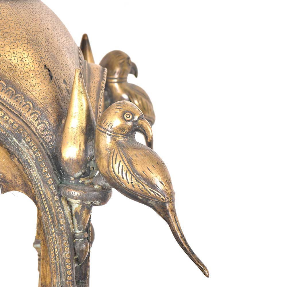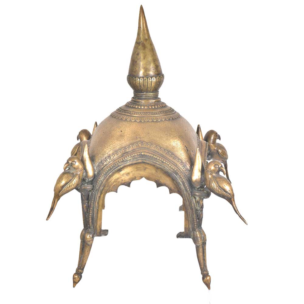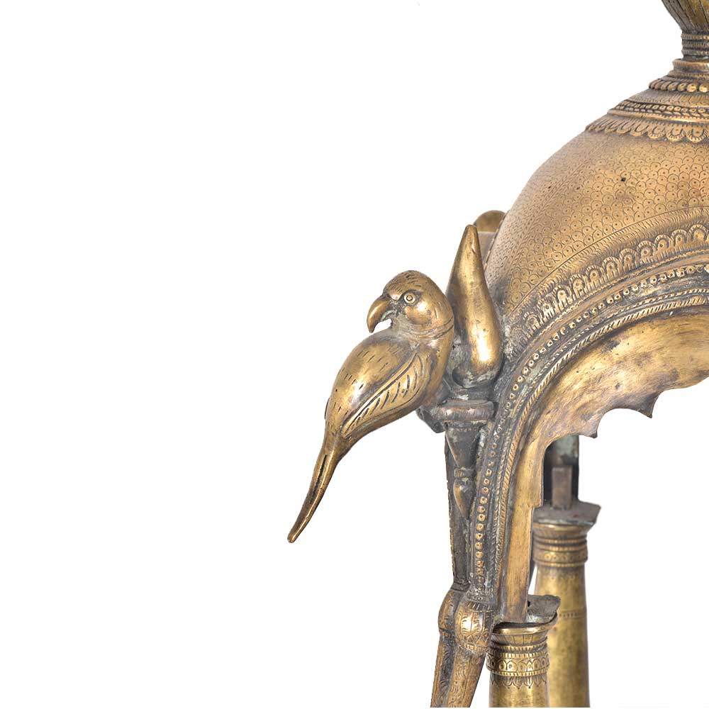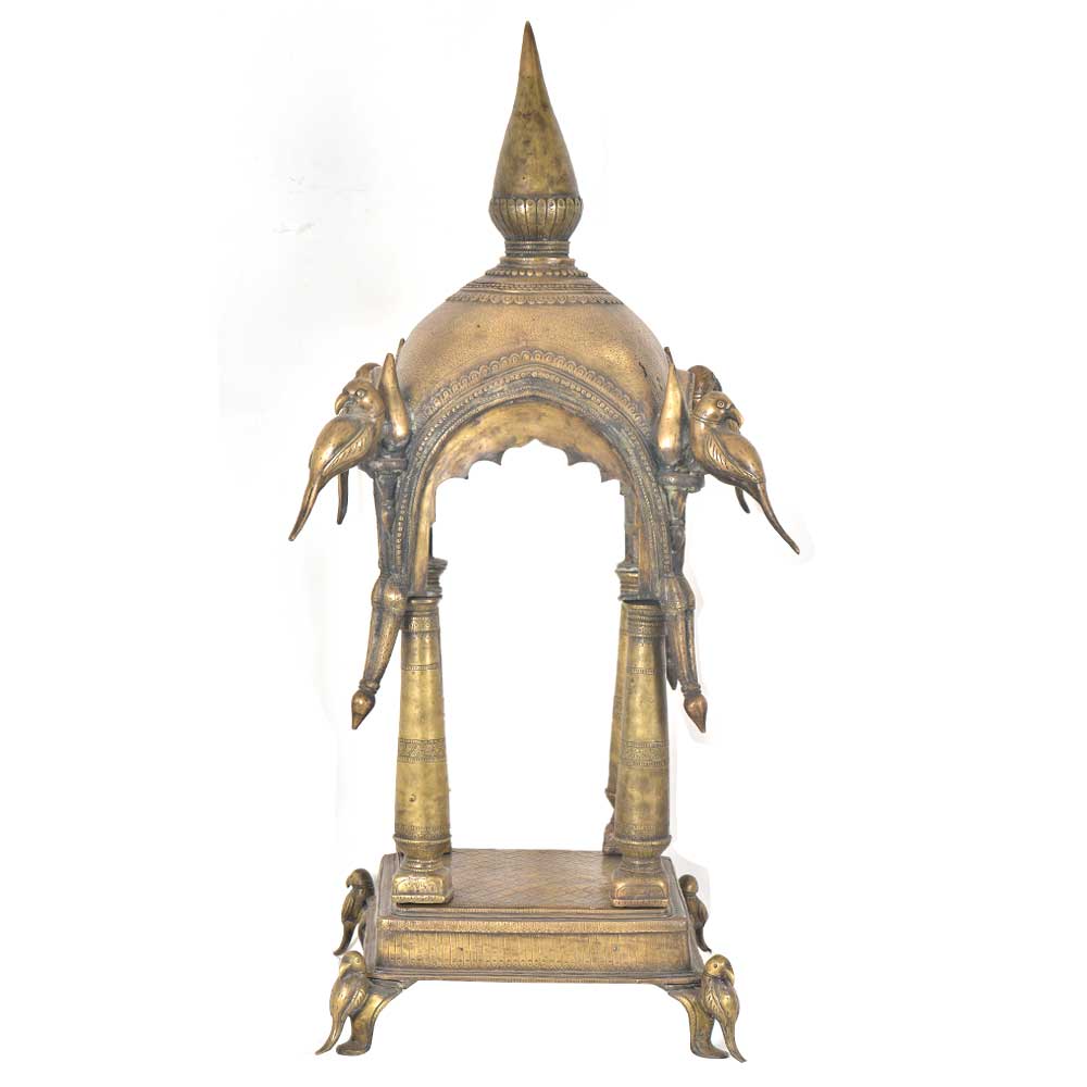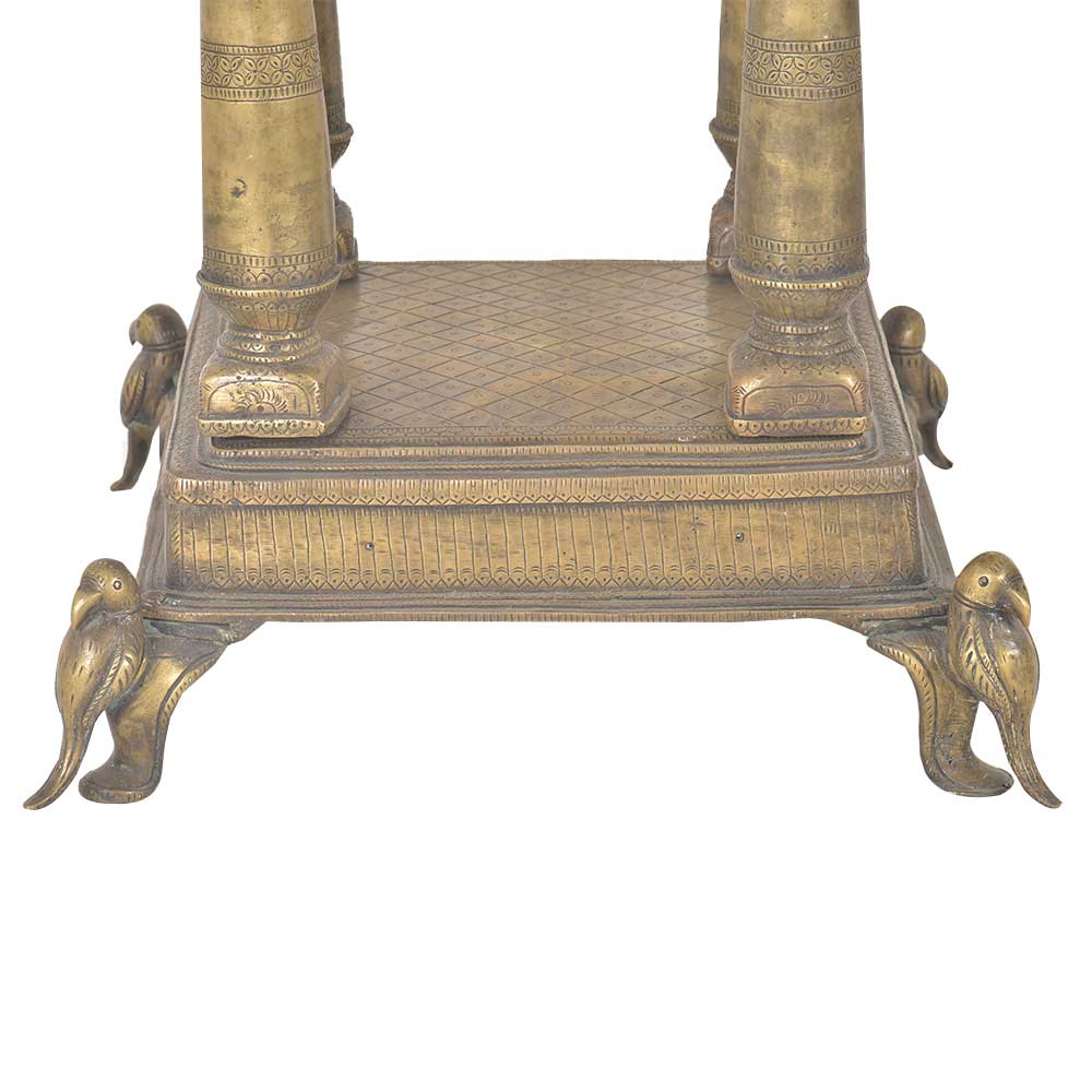 A temple made of solid brass that can easily fit in the interiors of a traditionally decorated home.The temple can be dismanteled and assembled back easily .You can place your god idols and figurines in the given pedestal space between the four pillars. The Upper portion of the temple consists of a dome with arched sides just like any other temple. It is further decorated with parrot figurines on the dome as well as on the legs of the temple. Can be fit in any corner of your home but very functional .Use this brass temple or mandir to perform your daily prayer to make a spiritual connection with the divine.