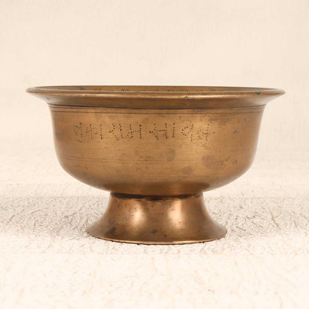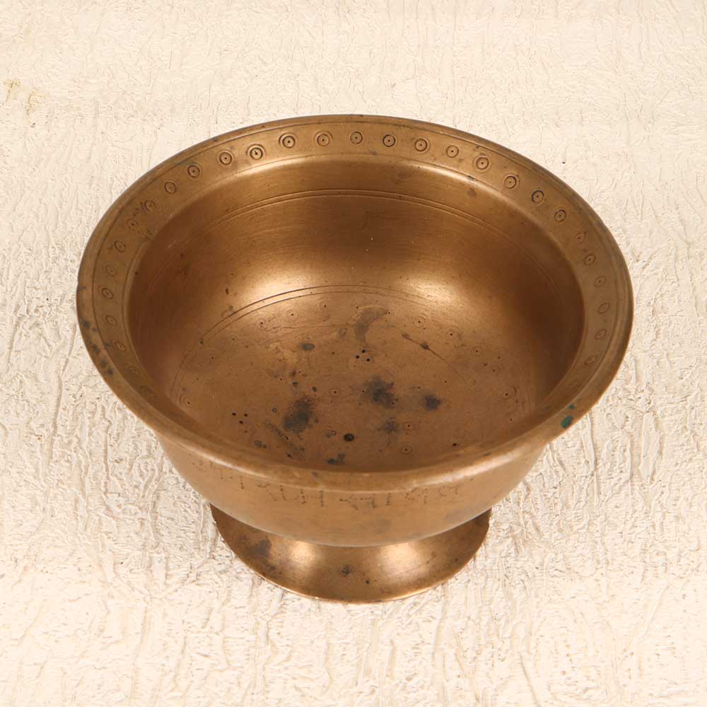 The soulful sound of this bell metal holy kumkum cup will enrich your prayer space and rituals. Handcrafted from solid bell metal, this vintage cup has a melodic ring when rung, calling devotees to worship. Its wide, flared shape provides easy access to the vibrant red kumkum powder within, ideal for marking foreheads in preparation for puja. Each cup develops a unique patina over years of ceremonial use, lending an antique, storied appearance that represents tradition and heritage. For devotees seeking a meaningful, resonant tool to deepen their connection to the divine, this bell metal kumkum cup makes a perfect addition to the home shrine. Use its heavenly ring to focus your mind and summon the Gods, letting its sound sanctify your practice.