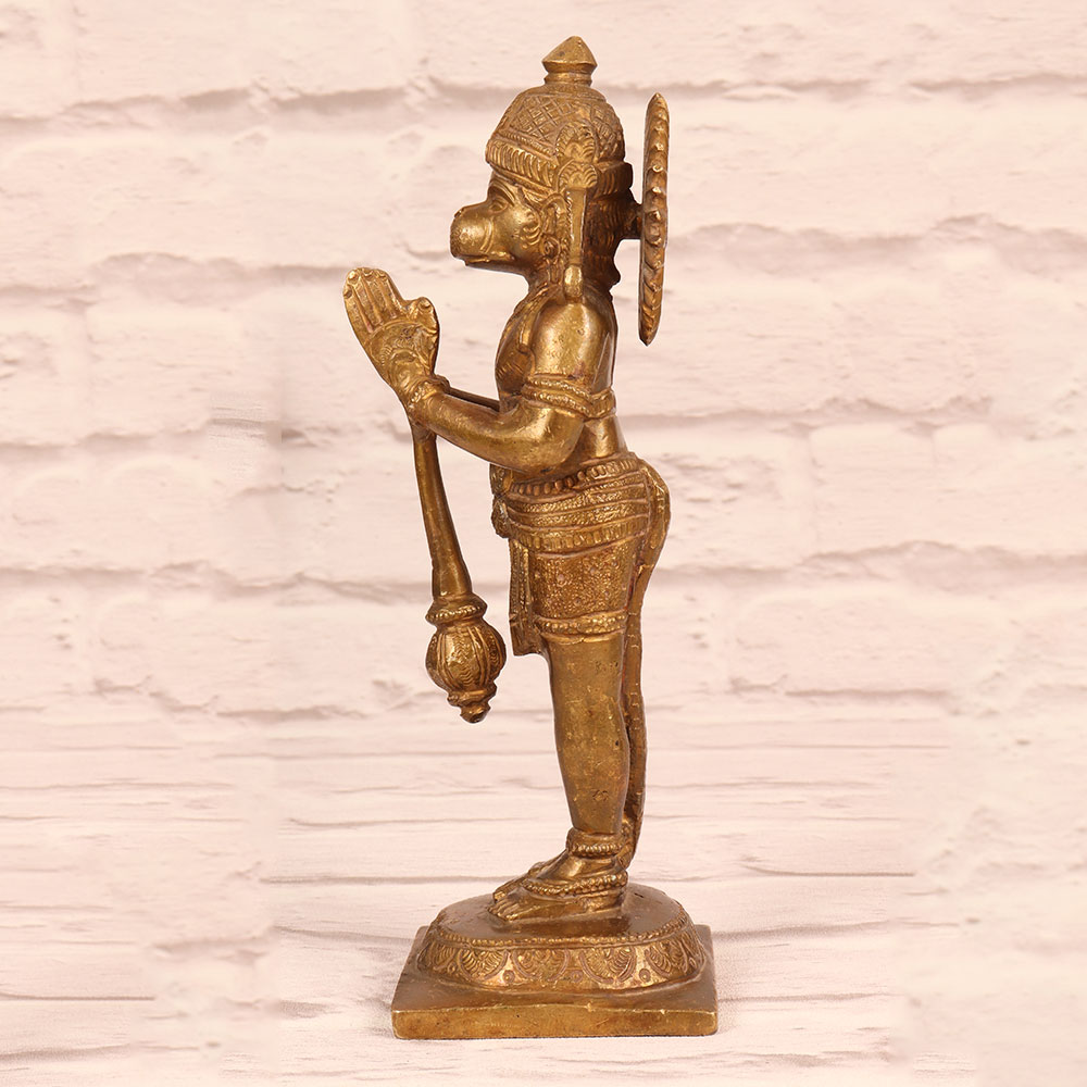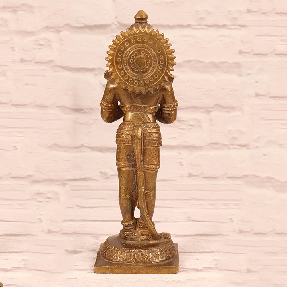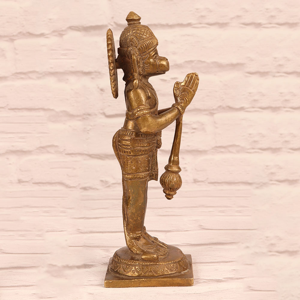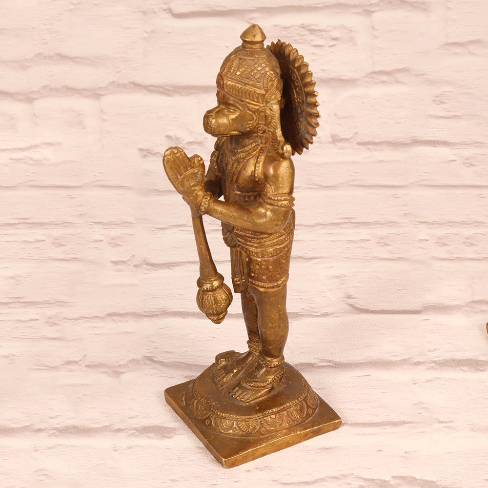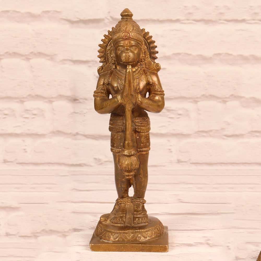 A Brass Lord Hanuman Statue in Namaskar Mudra that stands gracefully on a platform with an exquisite antique brown finish. Meticulously handcrafted by highly talented Indian artisans, this statue is a testament to their artistry and devotion. Lord Hanuman, a revered figure in Hindu mythology, is known for his unwavering devotion to Lord Rama and exceptional strength. The Namaskar Mudra depicted in this statue symbolizes humility and reverence, making it a spiritually enriching addition to any space. Crafted from high-quality brass, the statue radiates durability and timeless beauty. Its intricate details, from the facial expressions to the flowing attire, showcase the artisan’s commitment to perfection. Ideal for adorning home prayer rooms, offices, restaurants, hotels, or cafes, it brings a sense of divine energy and tranquillity to any environment. This elegant Lord Hanuman statue serves as a thoughtful and meaningful gift for your family, friends or relatives during special, festive, or auspicious occasions. Embrace the divine presence in your surroundings with this meticulously crafted masterpiece that seamlessly blends tradition, spirituality, and artistic excellence.