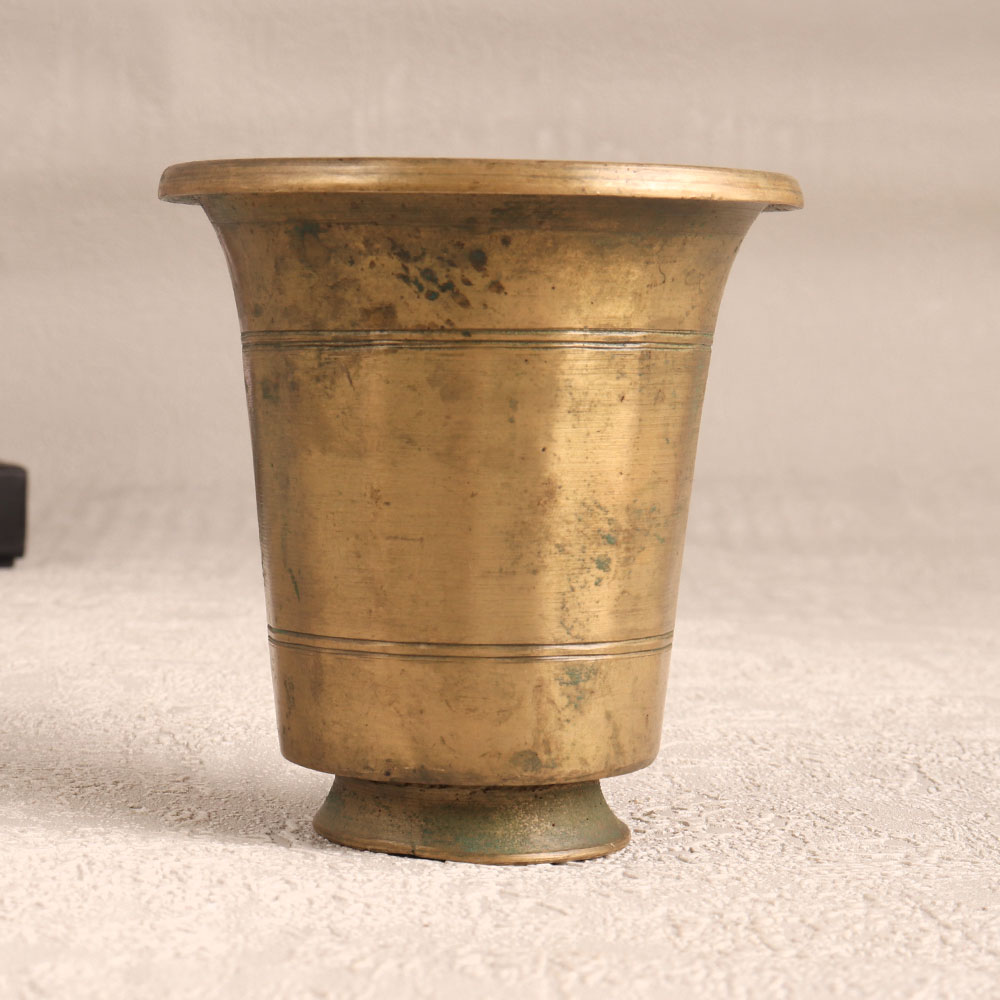 Buy a Vintage Brass Holy Water Glass online which is a testament to South Indian artistry and craftsmanship. Handcrafted by highly skilled Indian artisans, this sacred vessel exudes a timeless charm, with its antique brown finish lending it an aura of vintage elegance. Crafted from high-quality brass, this holy water glass is a versatile addition to your prayer or ritual sessions. It is designed to hold holy water, adding a sacred touch to your devotions, havans, or ceremonies. Its graceful design and antique brown finish make it a stunning accent for your home, office, restaurant, hotel, or cafe's prayer room, enhancing the ambiance and infusing spirituality into your space. Not limited to religious use, this charming piece can also be repurposed as a vessel for flower decorations, making it a versatile choice for any occasion. Share the blessings and beauty of this handcrafted masterpiece with your family, friends or relatives on special, festive, or auspicious occasions, making it a cherished gift that transcends time and tradition. Embrace the legacy of Indian craftsmanship with this Vintage Brass Holy Water Glass.