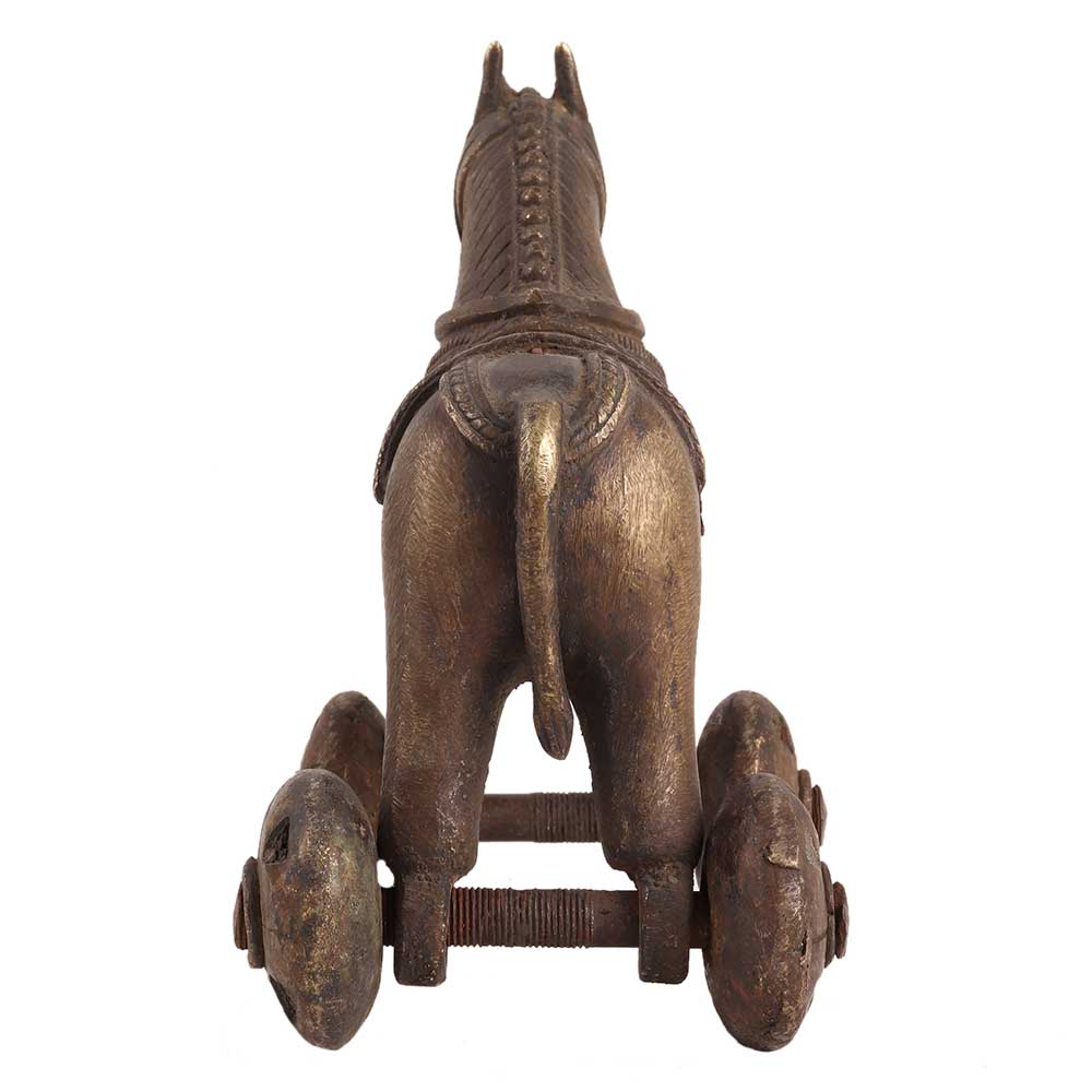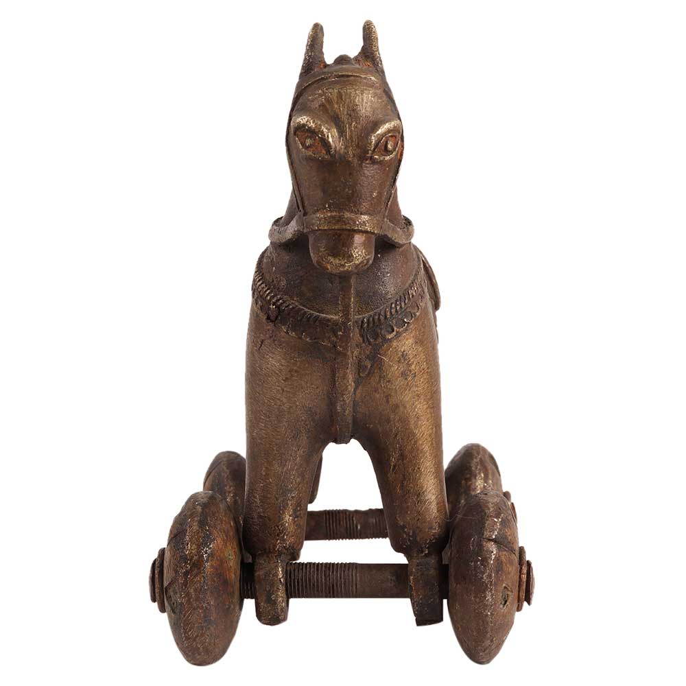 This is an ancient Hindu handcrafted brass horse temple toy with wheels made by skilled artisans. "Temple toys" were symbolic offerings left in Hindu temples. These smaller items, which were frequently shaped as horses, camels, elephants, and carriages, were meant to represent their larger counterparts. Use it yourself or give it to someone you care about.