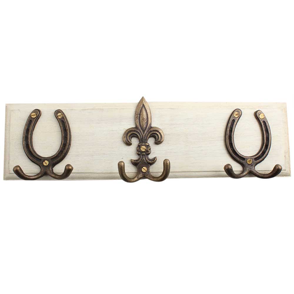Horse Shoe Fleur De Lis Iron Wooden Hook. A Perfect Complement to the Soft Tone of the Wood are these White Traditional Hat &Amp; Coat Hook Made of Genuine Porcelain and Brass. It can be use to Hang Jewellery, Leashes, Towels, Scarves, Light Weight Sweaters, Caps Etc.
