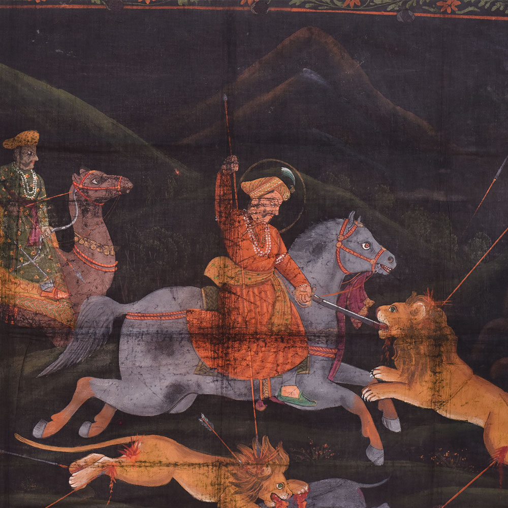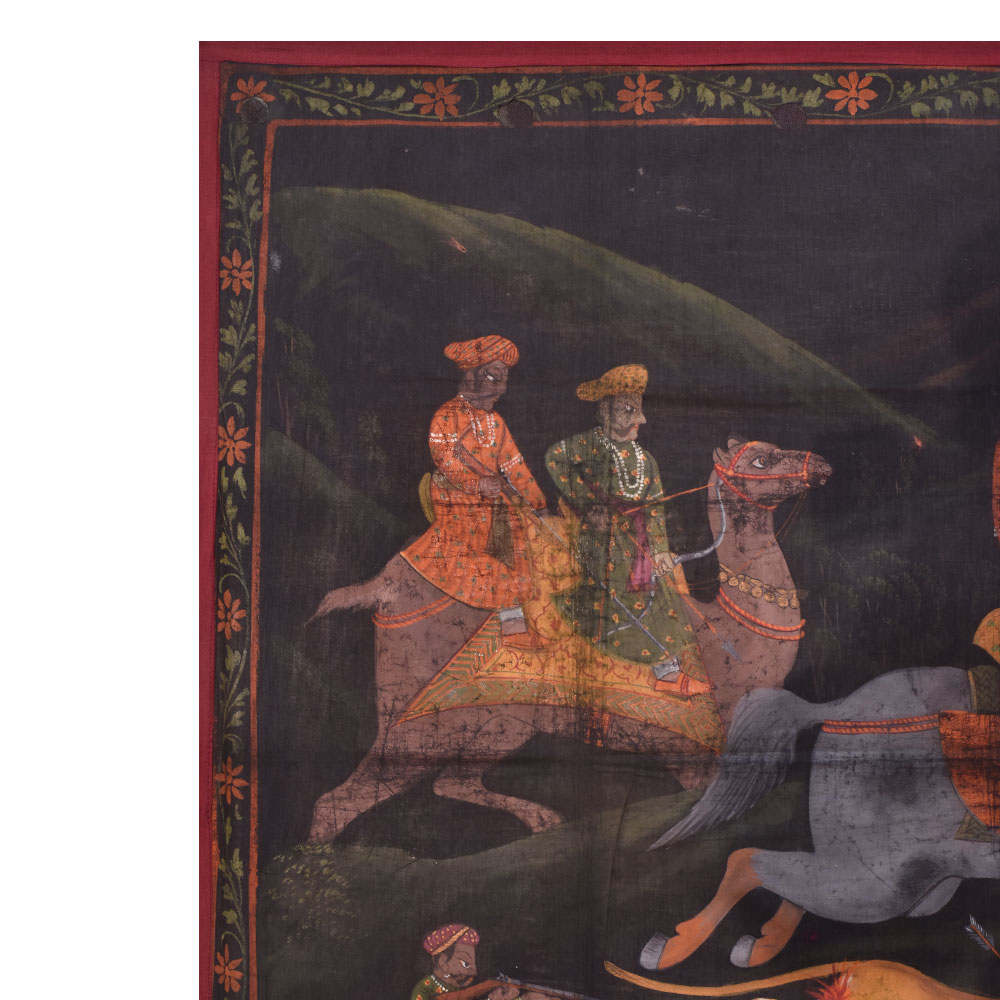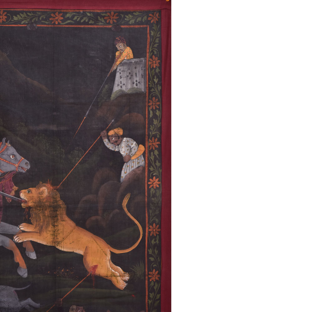 A beautiful Pichwai painting on fabric cloth that is a stunning representation of a regal king embarking on a daring hunt. At the center of the painting, we see the king wielding a sword as he charges towards a ferocious lion, ready to take it down. Behind him, two men ride on a camel, adding to the royal and majestic vibe of the piece. On the right-hand side of the painting, we see three hunters taking down another lion, showcasing the bravery and strength of the king's entourage. The painting has a dark background, which accentuates the bright colours of the main figures, making them truly stand out. The intricate floral borders framing the painting add a touch of elegance and sophistication, giving it an almost royal aura. The painting is expertly painted by professional Indian artists, using a mix of vibrant colours to create a mesmerizing effect. It is a true masterpiece that can be hung in any living room, bringing a touch of Indian culture and tradition to the space. This painting makes an incredible gift for family, friends, or relatives, particularly for special or festive occasions, as it is sure to impress anyone who lays their eyes on it.