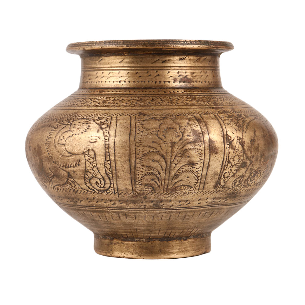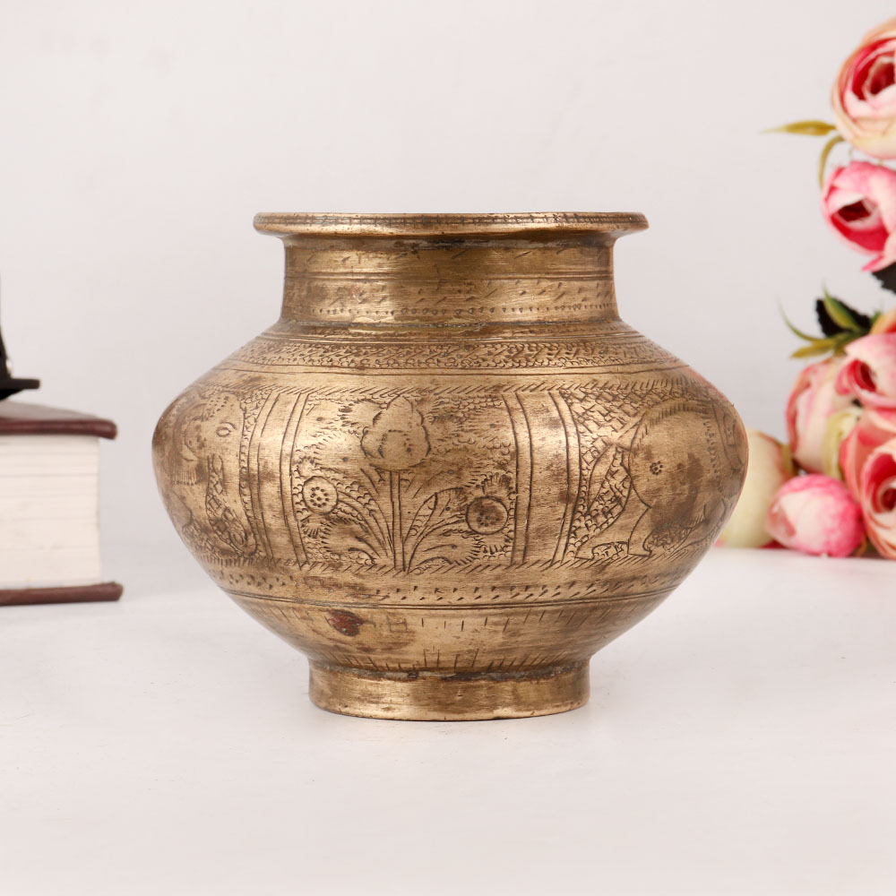 Give your home an adorable interior with a brass holy water pot which is a magnificent creation that blends artistry, spirituality, and functionality. This meticulously crafted Lota is adorned with intricate elephant and floral engravings, showcasing the mastery of skilled Indian craftsmen. Its antique brown finish lends a timeless charm, adding an aura of elegance to any space. Handmade using traditional techniques, this holy water pot is fashioned from premium brass, ensuring durability and a captivating visual appeal. A true masterpiece, it serves as a captivating decorative piece, drawing the attention of all who lay eyes on it. In Hindu temples, this pot is utilized to offer water to the Shivling, a symbolic representation of Lord Shiva. By absorbing negativity from the surroundings and radiating positive energy, it aids in spiritual cleansing and purification. Additionally, it finds purpose during havans, Hindu rituals, and auspicious occasions, where it stores holy water, signifying sanctity and divinity. An ideal gift for your loved ones on special occasions, festivals, or auspicious events, this brass holy water pot bestows blessings, spirituality, and aesthetic allure in equal measure.