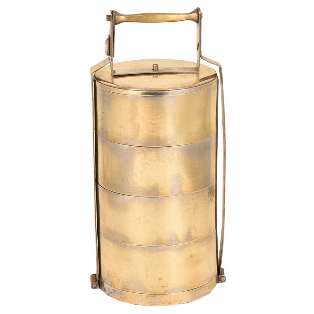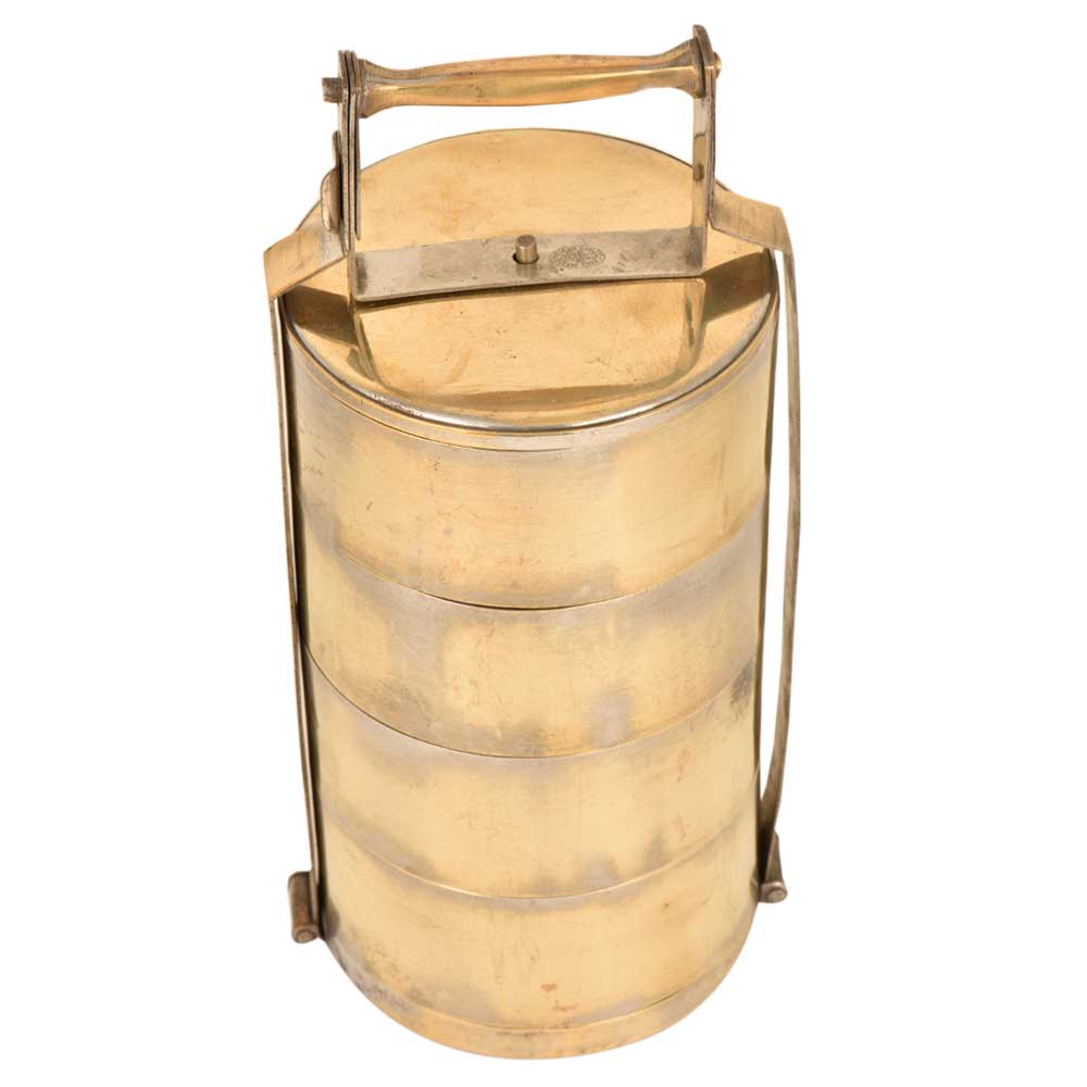 This is an old brass lunch box with four containers. The brass lunch boxes were very popular and are now used as table ornaments, jewelry storage or presentation of food .The boxes were are engraved with the names of the owner so that it could not be misplaced.