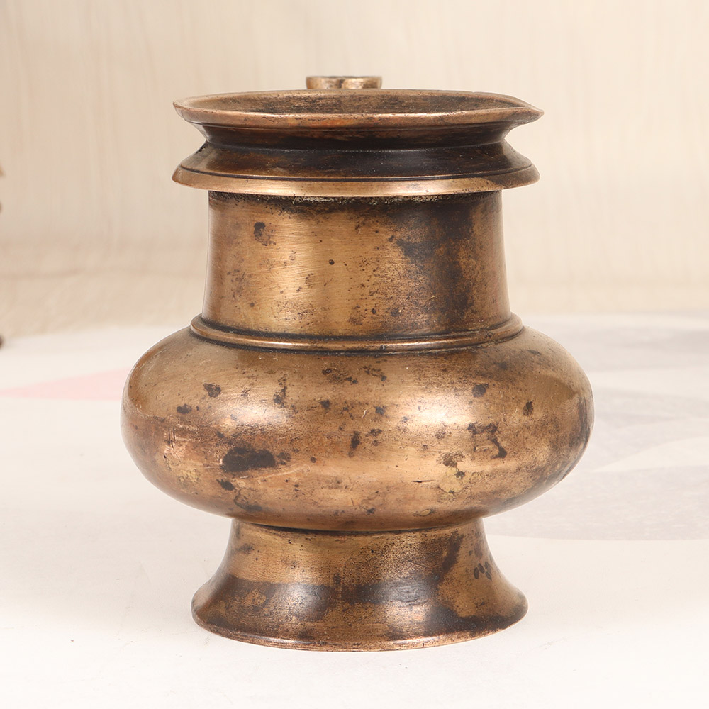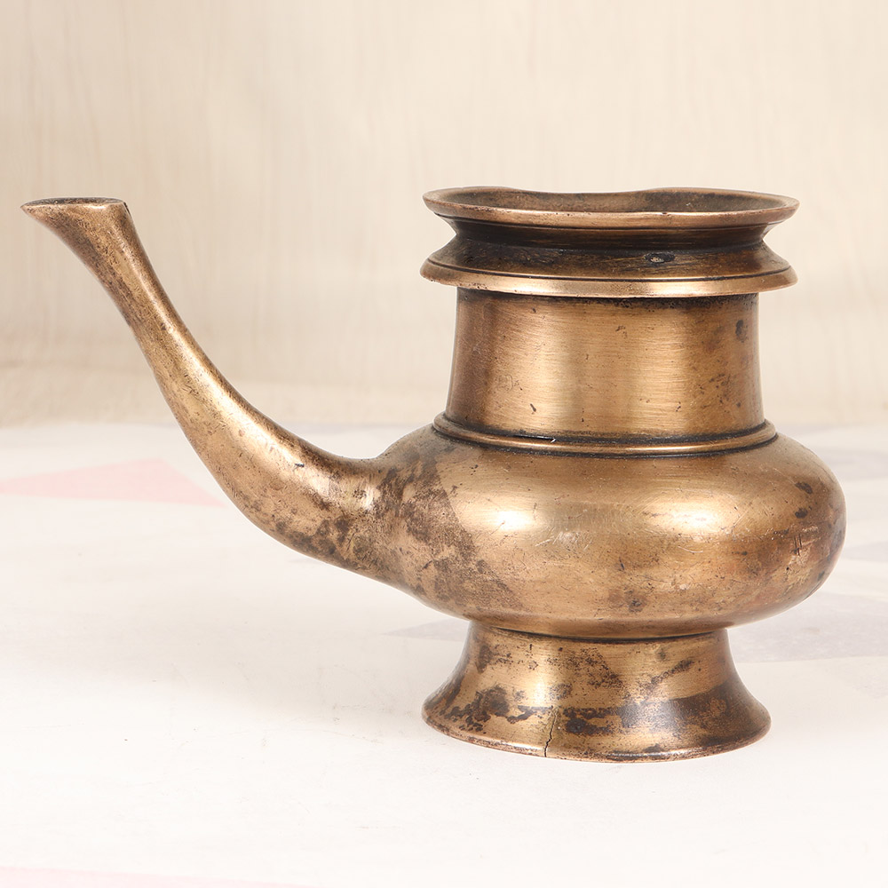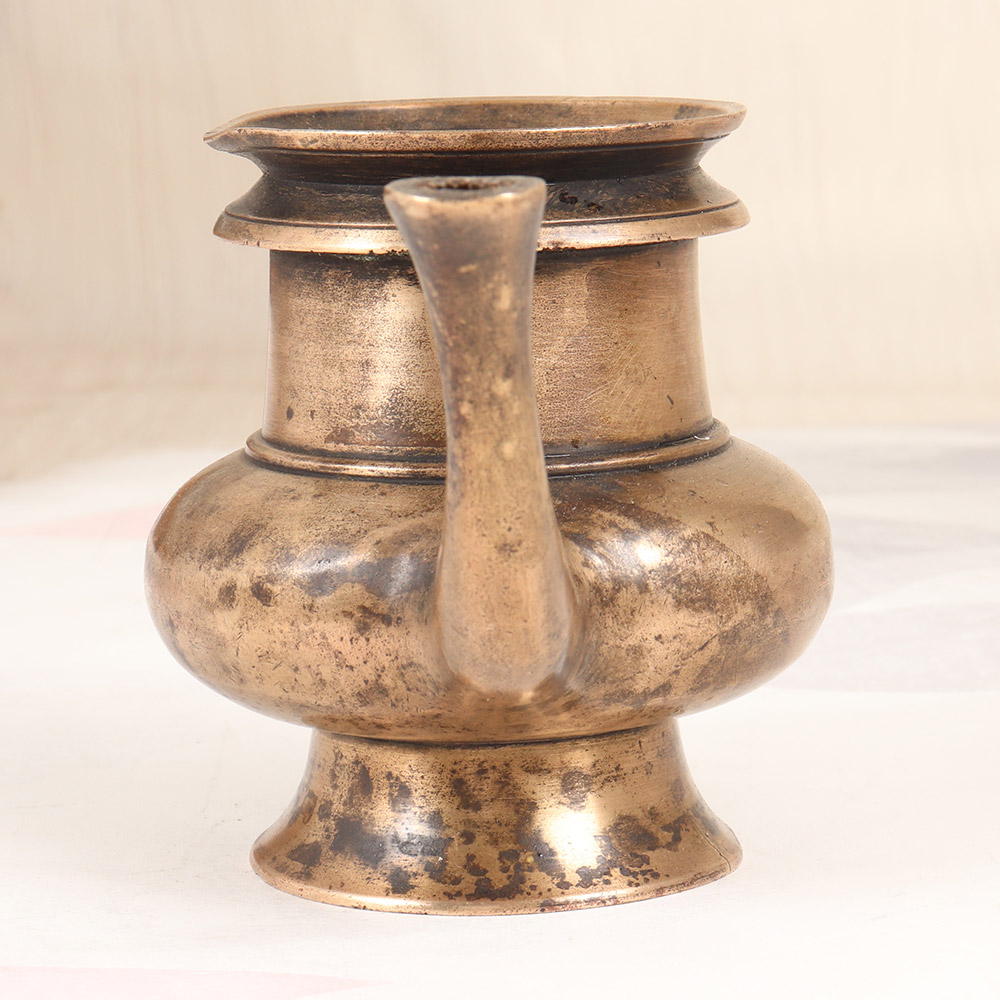 Elevate your spiritual practice and create a sacred space in your home with this stunning vintage brass holy water pot. Crafted with meticulous attention to detail, this elegant vessel is a testament to the rich cultural heritage of South India, and a powerful tool for connecting with the divine. Imagine the calming presence this holy water pot will bring to your home altar or meditation nook. As you reverently fill it with sacred water and use it to anoint your forehead or cleanse your hands before prayer, you'll feel the weight of the brass in your hands, grounding you in the present moment and reminding you of the sacred significance of your practice. Whether you're a devout practitioner or simply seeking to infuse your space with a touch of timeless, sacred beauty, this holy water pot is a must-have. Unlock the power of ritual and let this stunning piece become a cherished part of your daily spiritual routine, inviting the blessings and purification of the divine into your life.