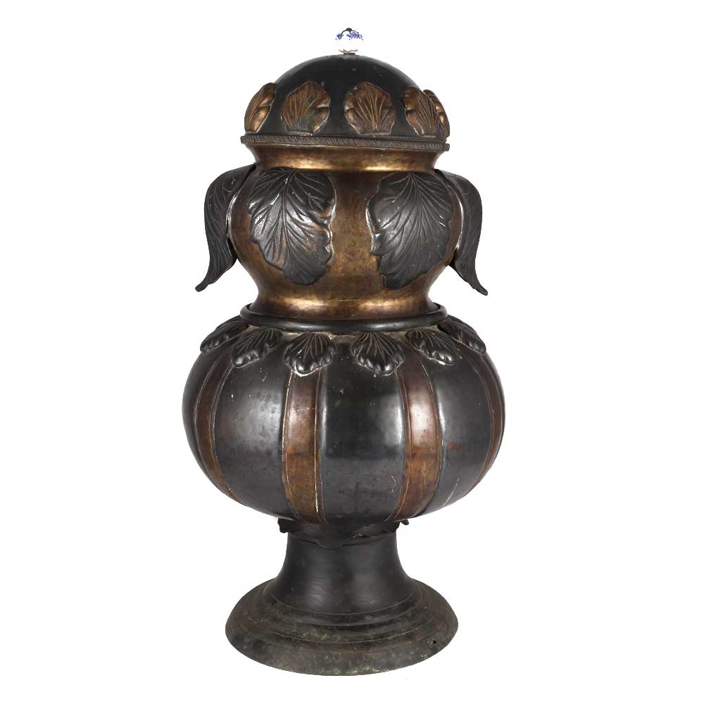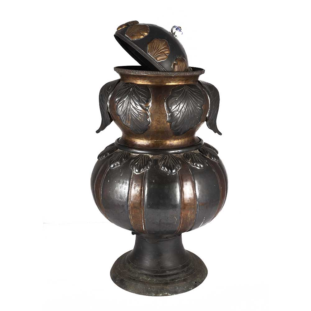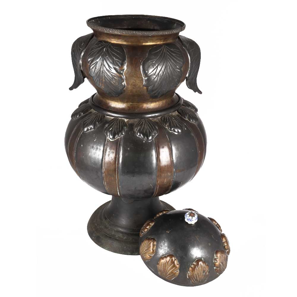 Original ancient rare Brass Copper mix metal holy water pot or Ganga Jamna pot. It is a uniquely shaped brass copper work pot in which two metals are combined to create this uncommon storage vessel. Used for decoration and collection.