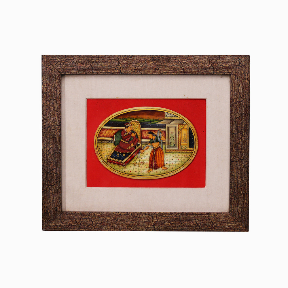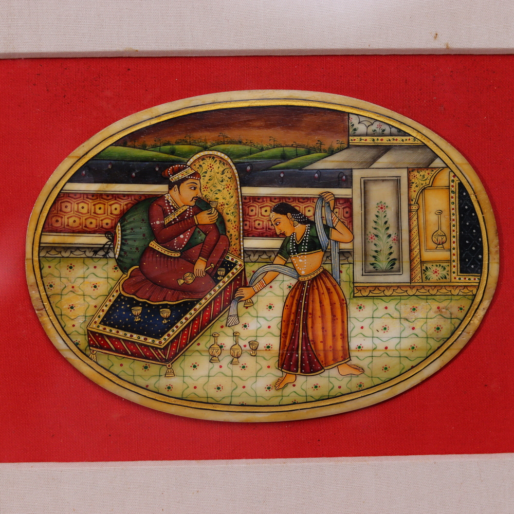 Discover the captivating essence of traditional Indian artistry with this exquisite painting on a camel bone plate. Showcasing the iconic motifs and techniques of the revered Mughal era, this piece is a true testament to the enduring legacy of India's cultural heritage. Lose yourself in the mesmerizing interplay of colors and shapes that dance across the surface of this breathtaking work. From the ornate floral patterns to the elegant geometric designs, every element has been meticulously rendered to capture the essence of India's artistic mastery. Whether you're drawn to the piece for its timeless beauty or its cultural significance, this Indian art painting on camel bone is a must-have addition to your home or collection. It's a stunning conversation starter that will ignite the imagination, inspire deeper appreciation for global art, and infuse your space with a touch of refined, worldly elegance.