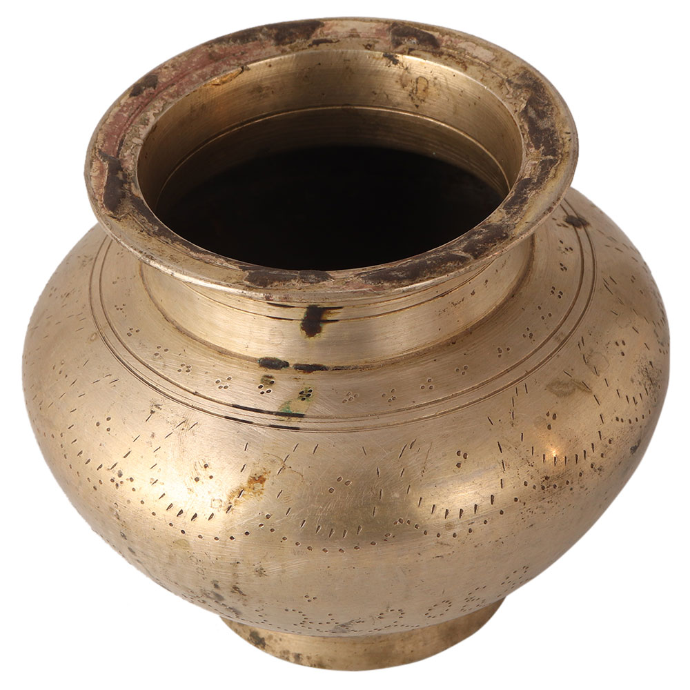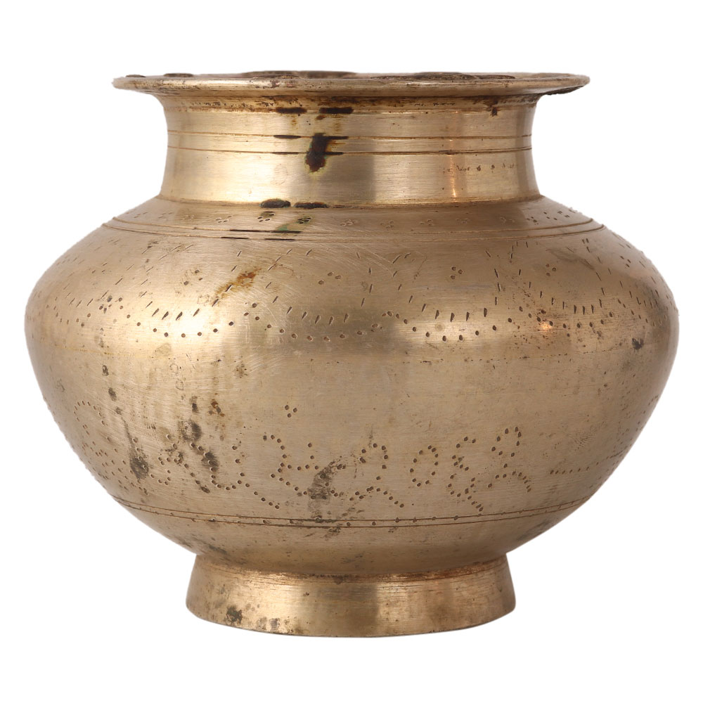 This Indian brass holy water pot is engraved with a detailed dot pattern. It was used in Hindu hawan (prayer) to hold rice and tie moli (red string) around the neck and place a coconut on top to cover the mouth.