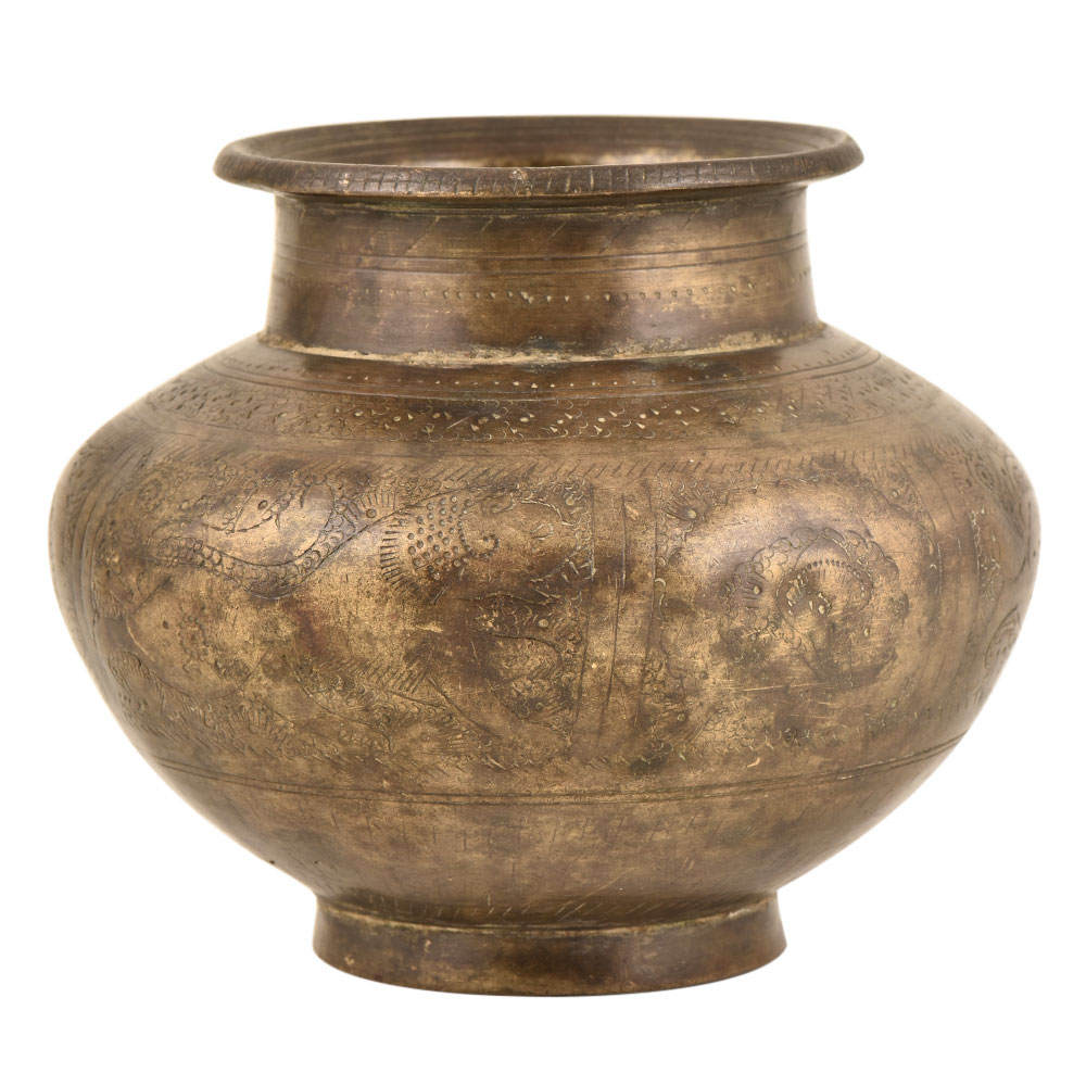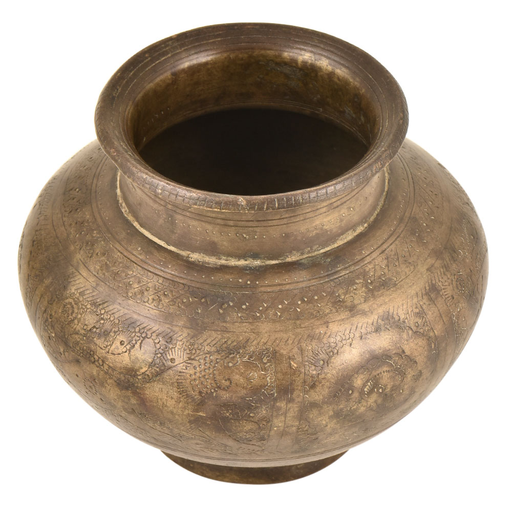 This Handmade Water Pot has Unique Carvings and Engravings Covering Its Surfaces Along with Beautiful Flowing Floral Patterns. The Brass is Oxidized, Making a Stark Relief to the Bright Carvings of the Brass Itself. Used to Store Water At a Cooler Temperature. It Rests Calmly on the Rounded Base, and Can Be Easily Lifted by the Tufted Neck. The Carvings Extend Over the Lip of the Edge of the Pot and Into the Inner Surfaces as Well. This Piece Would Make a Wonderful Topper to An Accent or Corner Table in a Room, and the Subtle Colors Make It the Perfect Accompaniment to Any Room's Decor.