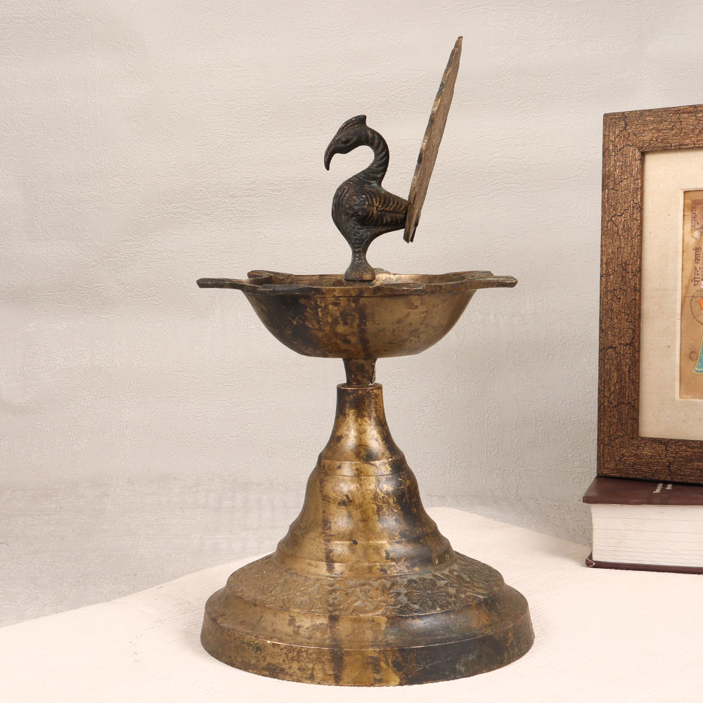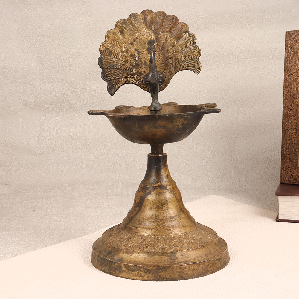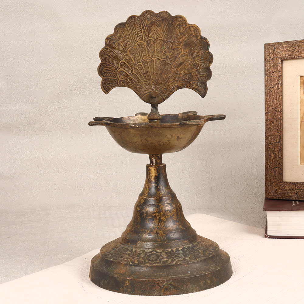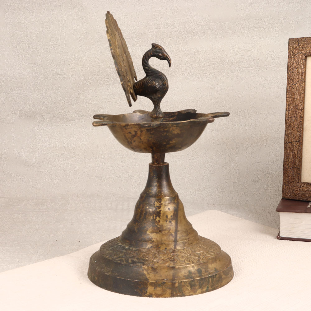 Buy a Vintage Brass Peacock Oil Lamp online that combines elegance and tradition in a single masterpiece. Crafted by professional Indian artisans from high-quality brass, this lamp boasts an antique brown finish that exudes a classic charm. The exquisite engraving on the lamp showcases a meticulously carved peacock on top, adding a touch of regality. Functional and symbolic, this oil lamp accommodates seven jyots, allowing for a captivating display of warm, ambient light. Designed for use with either mustard oil or ghee, it becomes a versatile accessory during special occasions, prayers, or moments of reflection. Its cultural significance makes it a perfect addition to home prayer rooms, offices, restaurants, hotels, or cafes. As a handmade creation, each lamp is a unique testament to the artisan's skill and attention to detail. Consider gifting this Vintage Brass Peacock Oil Lamp to your family, friends or relatives on special, festive, or auspicious occasions which is a thoughtful and cherished present that transcends time and cultural boundaries. Illuminate your space with the richness of tradition and the glow of craftsmanship.
