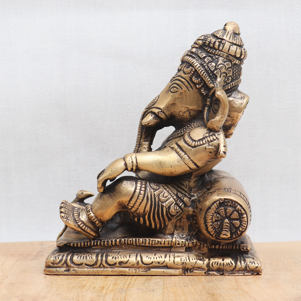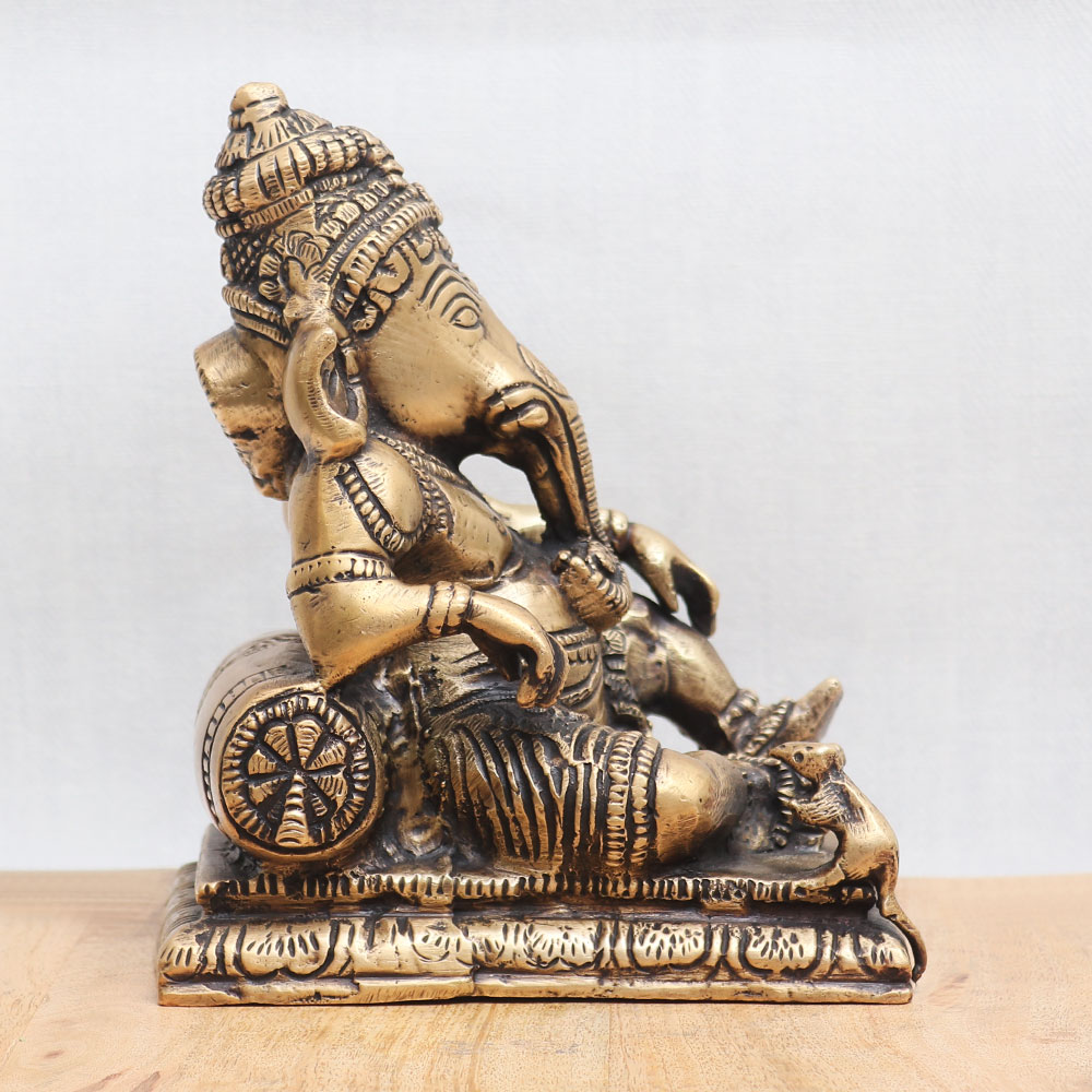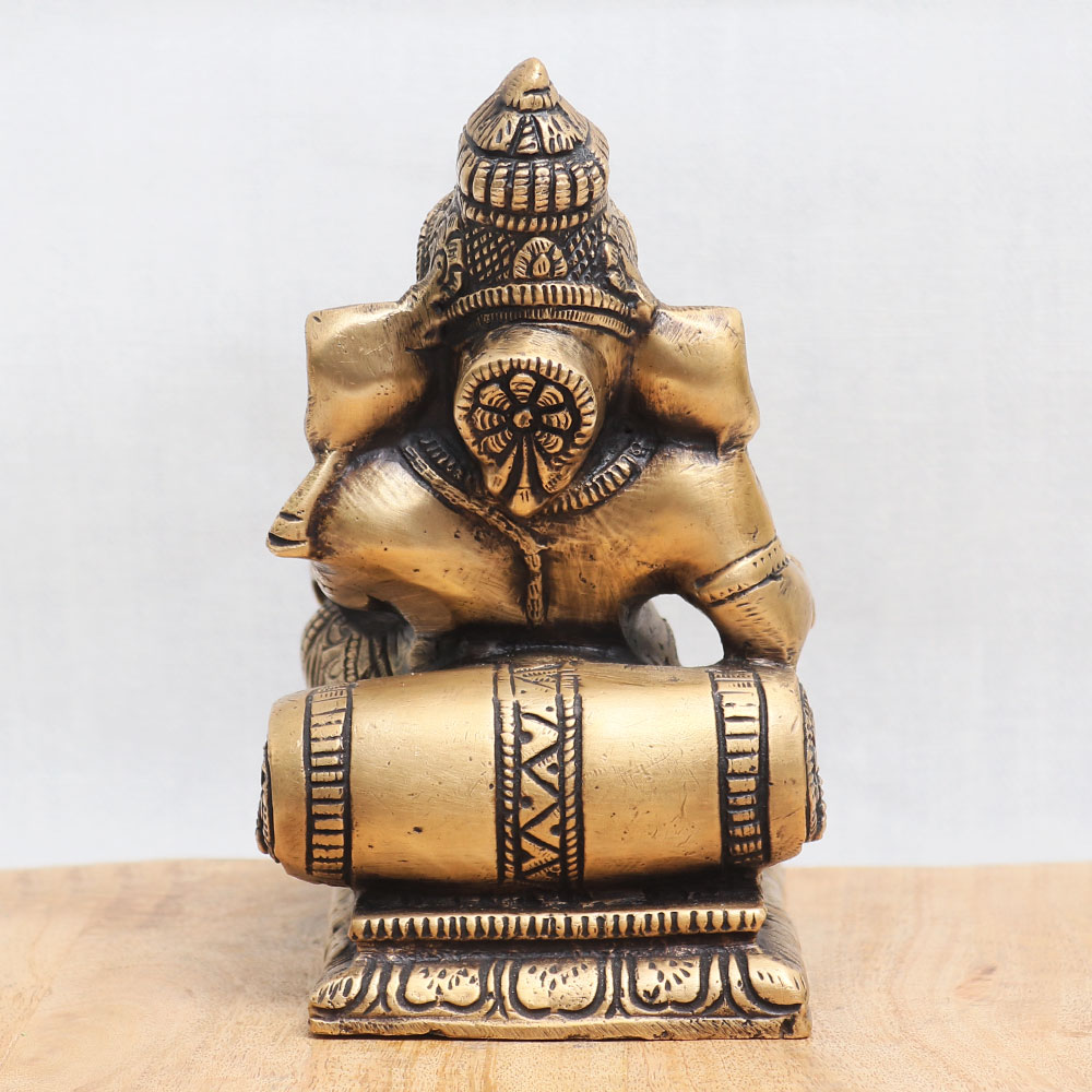 This Lord Ganesha statue depicts him sitting gracefully accompanied by his loyal vahana, Mushak. This divine sculpture is crafted from high-quality bronze by highly skilled Indian artisans, ensuring exceptional craftsmanship and attention to detail. The handmade creation showcases intricate carvings and embellishments, exuding an antique finish that adds a touch of elegance and charm. Ideal for various settings, this enchanting statue can be proudly placed in your home, office, restaurant, or hotel temple, serving as a focal point for worship. It seamlessly blends spirituality and artistry, making it a captivating addition to any space. Additionally, this remarkable collectible is perfect for vintage enthusiasts and can be proudly displayed in a museum or exhibition. Apart from its symbolic significance, this statue also doubles as a striking decorative piece, instantly enhancing the ambiance with its divine aura. An auspicious gift for your loved ones during special occasions or festivals, symbolizing blessings, prosperity, and good fortune. To experience the divine presence of Lord Ganesha and explore an extensive collection of such exquisite sculptures, browse our website and buy sculptures online.
