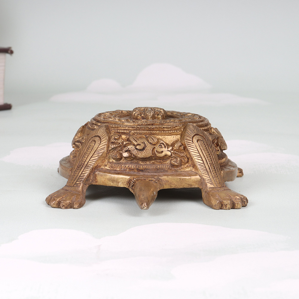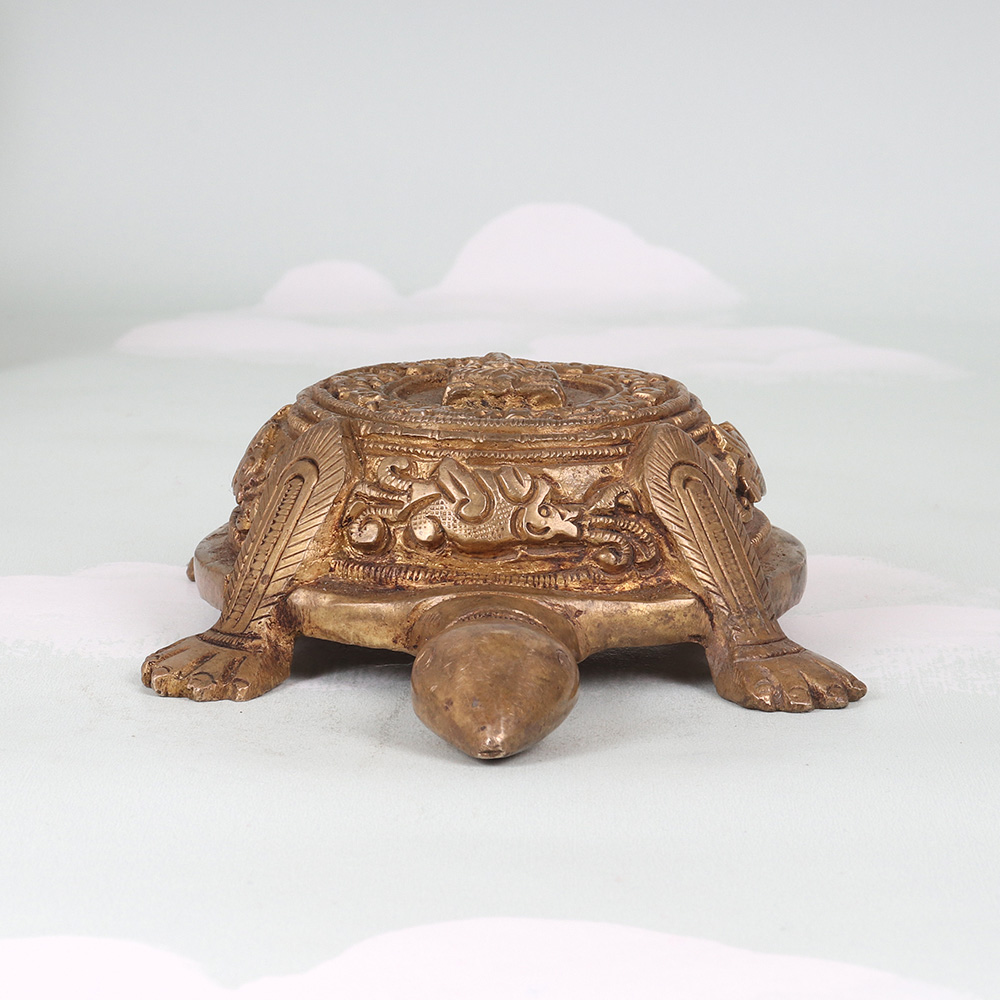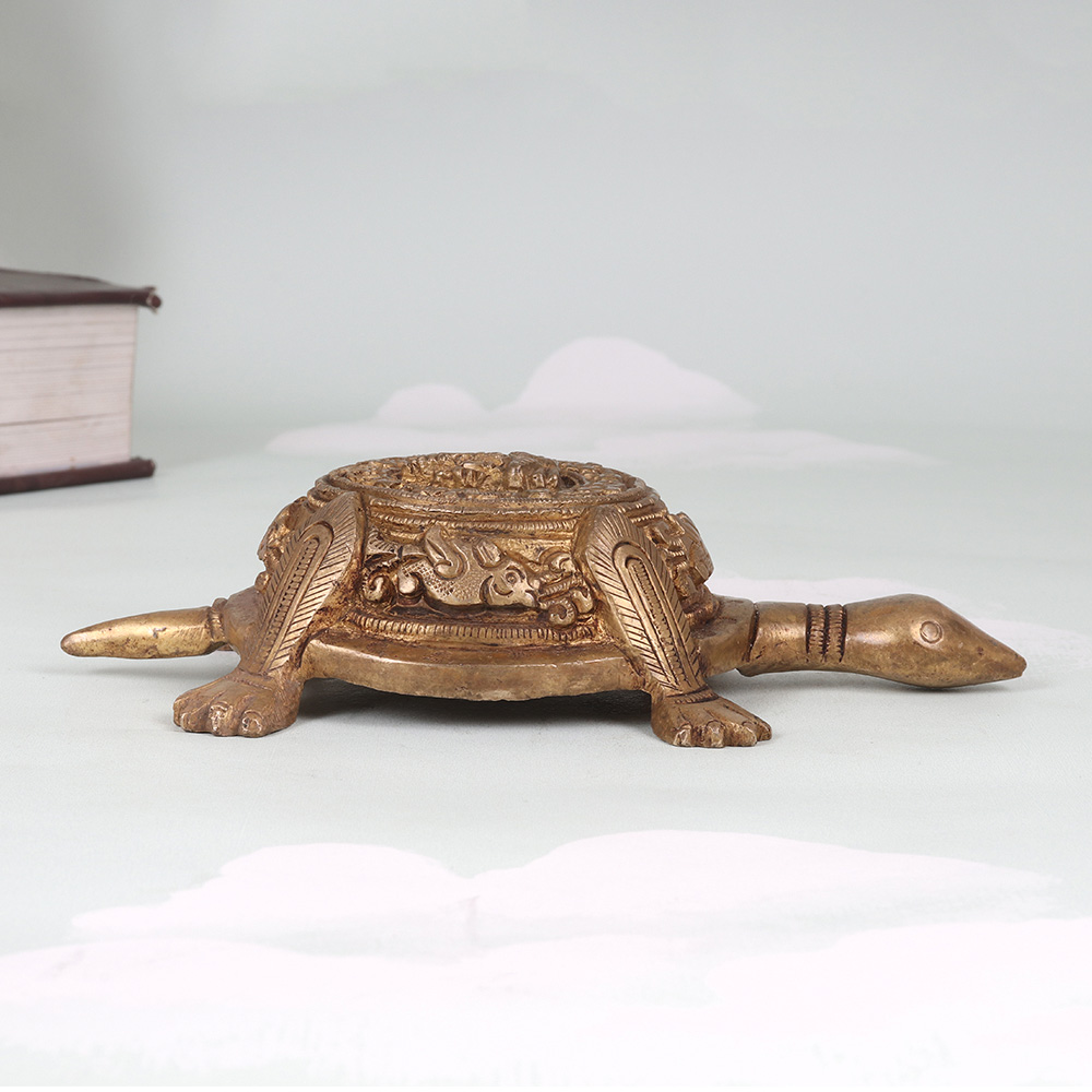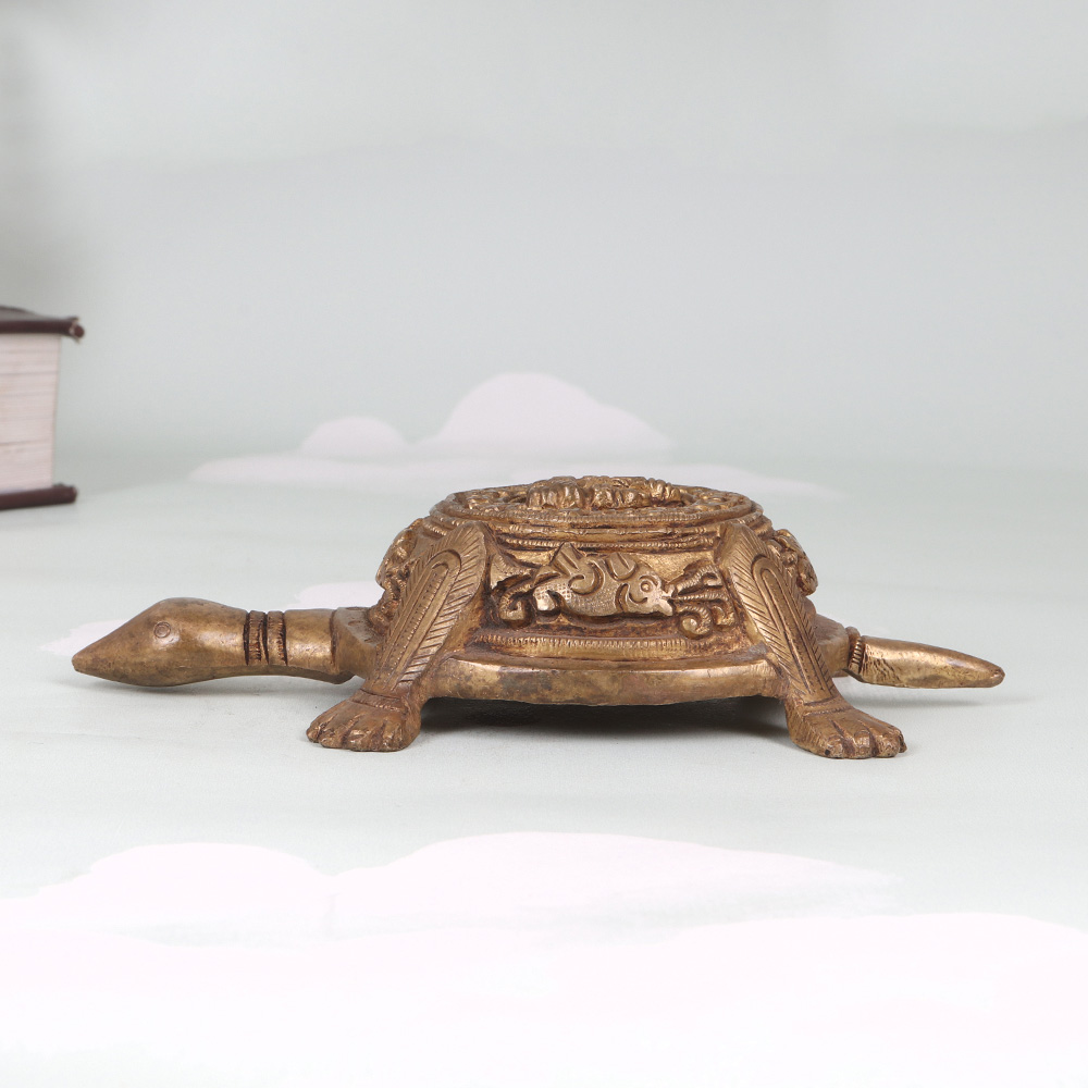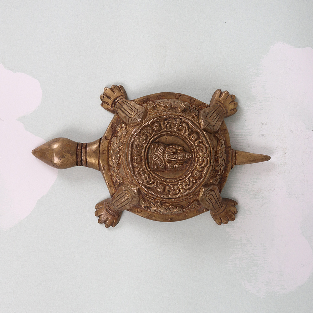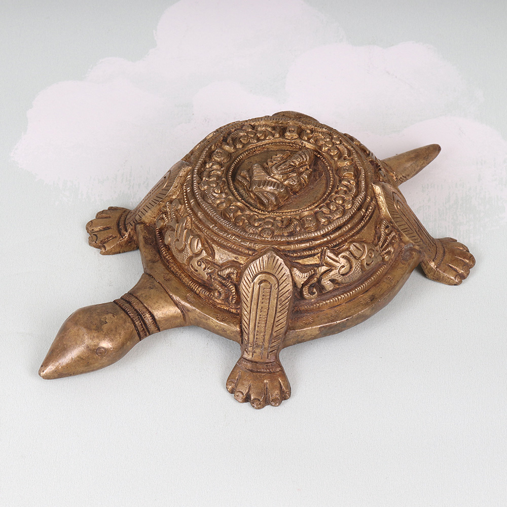 In a world that can sometimes feel chaotic and uncertain, the Brass Turtle Yantra offers a haven of stability and security. Crafted from solid brass and featuring an intricate carving of Lord Ganesha, this captivating symbol blends the ancient wisdom of the turtle with the blessings of the remover of obstacles. The turtle is revered in many spiritual traditions as a symbol of longevity, resilience, and groundedness. By focusing your attention on the Brass Turtle Yantra, you can tap into the turtle's calming influence and cultivate a sense of steadfastness that helps you weather life's storms. Meanwhile, the presence of Lord Ganesha ensures that any obstacles or challenges that arise are swiftly cleared, allowing you to move forward with confidence and ease. Whether you're seeking greater financial abundance, improved relationships, or a deeper connection to your spiritual path, the Brass Turtle Yantra can be a powerful ally. Place it in your home or office to create an atmosphere of tranquility and prosperity, or carry it with you as a pocket-sized talisman to ward off negativity and invite positive change. Embrace the protective energy of this ancient symbol and experience the transformative power of the Brass Turtle Yantra.