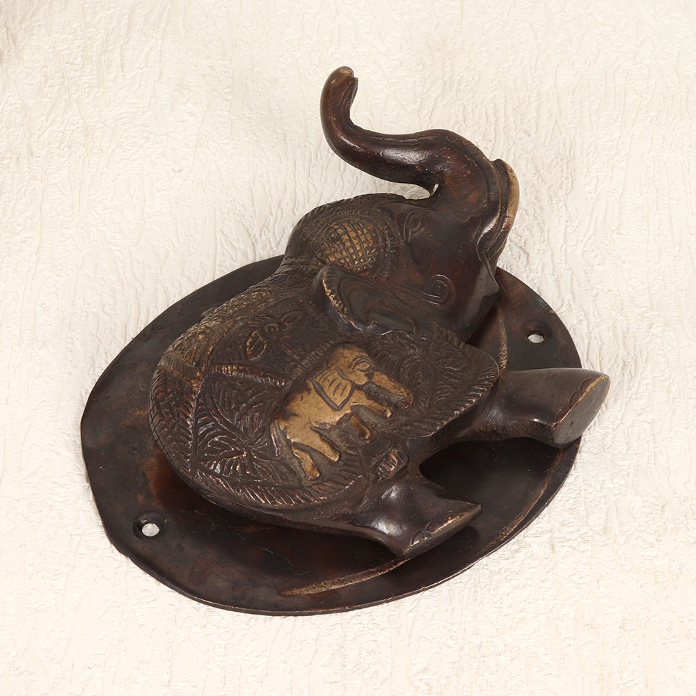 A Vintage Brass Elephant Door Knocker which is a testament to timeless elegance and craftsmanship. This exquisite piece boasts an antique brown finish that adds a touch of nostalgia to any door it graces. Meticulously handmade by talented Indian artisans using high-quality brass, each door knocker is a unique work of art, reflecting the rich tradition of metalwork. Versatile and captivating, this door knocker transcends settings, making it a perfect addition to homes, offices, restaurants, hotels, or cafes. Its distinctive design not only serves as a functional accessory but also doubles as a striking element for vintage collectors. Gift this remarkable piece to your family, friends or relatives on special, festive, or auspicious occasions, and share the joy of possessing a symbol of cultural richness and artistic finesse. Embrace the allure of the past while inviting a touch of India's artisanal heritage into your living spaces with this exceptional brass elephant door knocker.