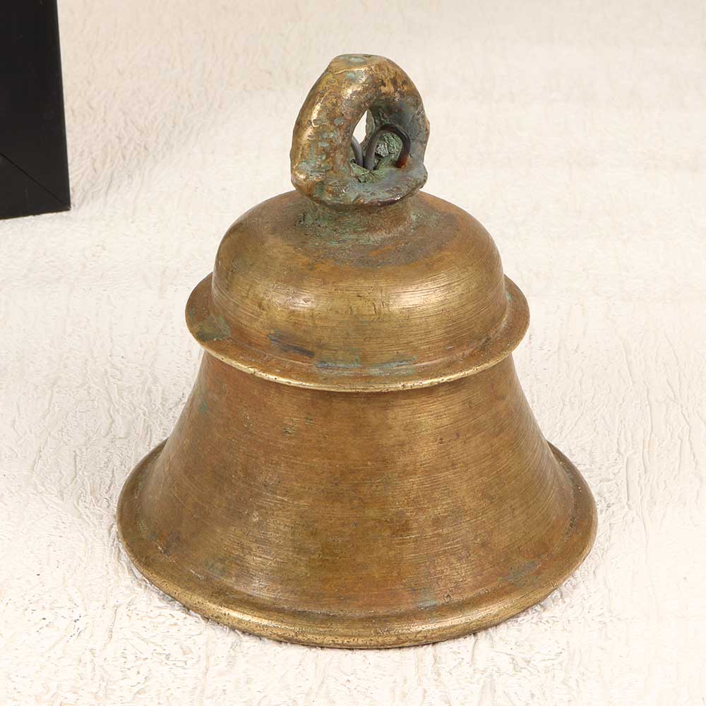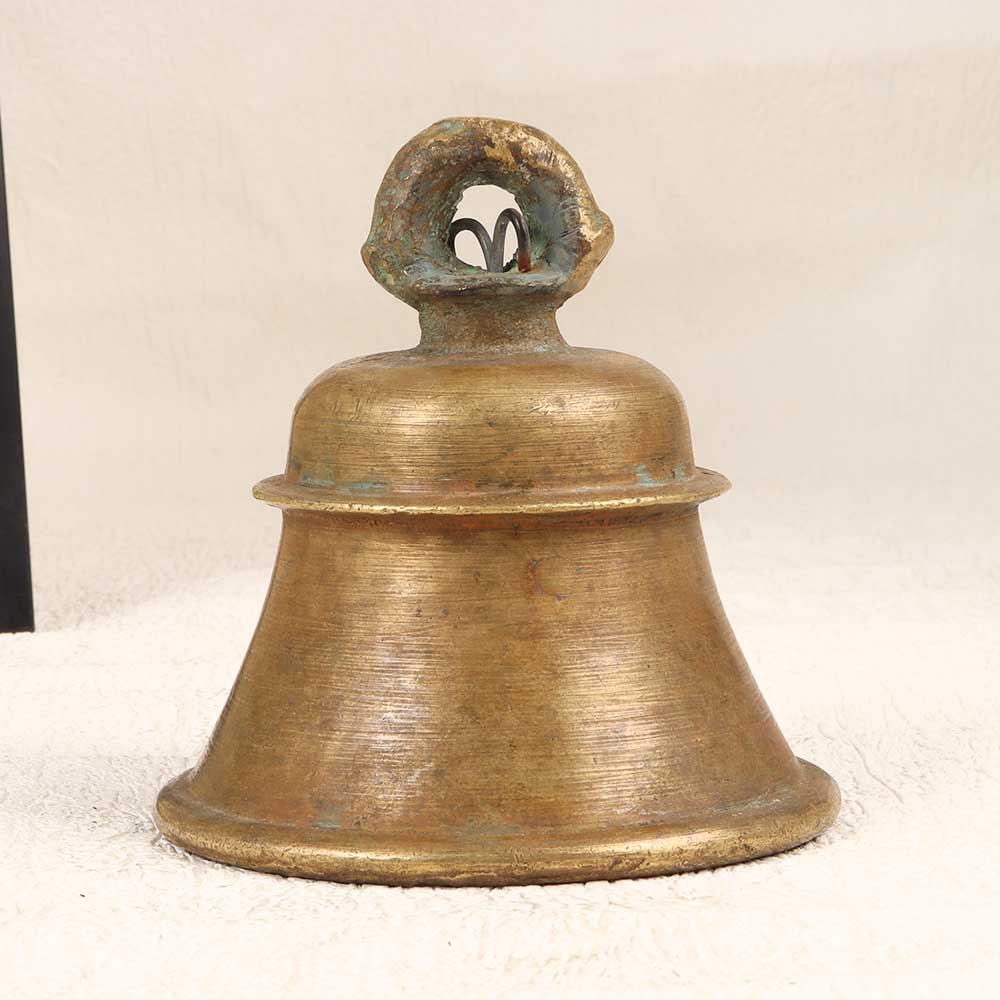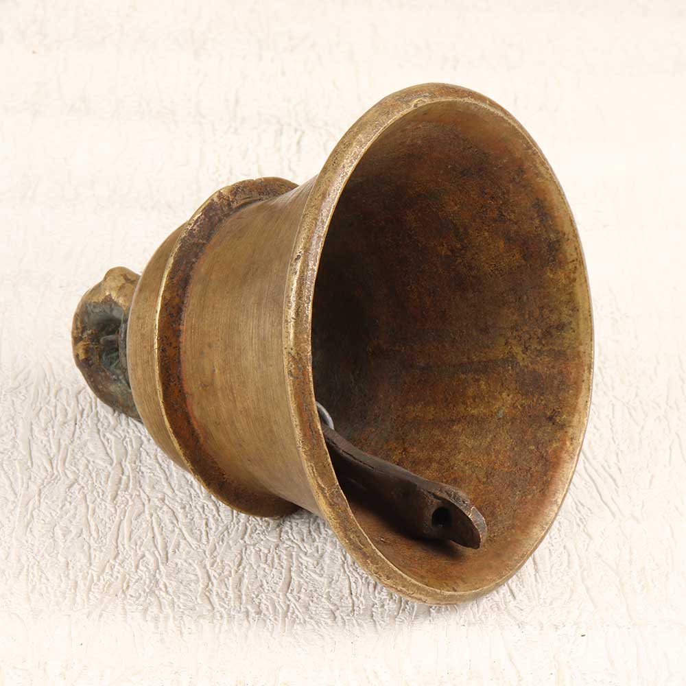 Immerse yourself in meditative tranquility with the deep, soothing tone of this vintage bell metal temple bell from Himachal Pradesh. Expertly cast from bell metal, this minimalist bell features an earthy brown finish and hanging loop for easy mounting anywhere. In Buddhist tradition, the sound of a bell is thought to promote mindfulness and inner peace. Let this bell fill your home with serenity as you gently ring it to mark moments of meditation or relaxation. Hang it in your yoga room, garden, entryway or anywhere you need an oasis of calm. With its beautifully simple design and ability to soothe the spirit, this vintage temple bell makes a meaningful addition to any space. Bring a piece of ancient tradition to your home with this resonant, brown-finished bell metal bell.